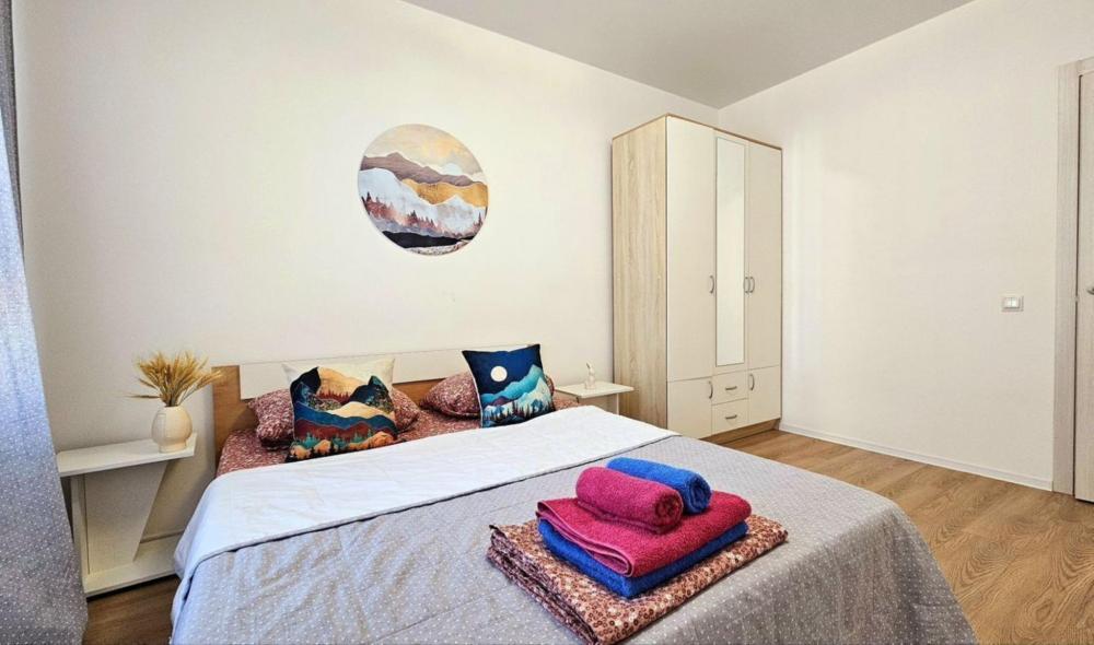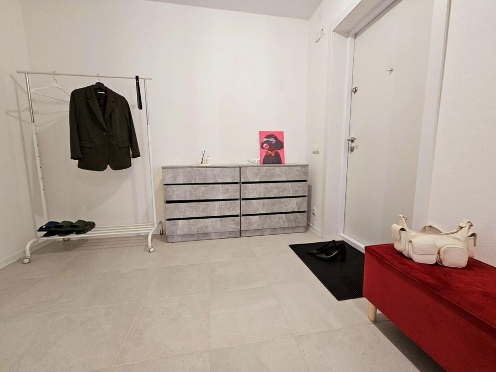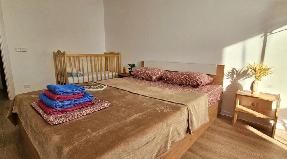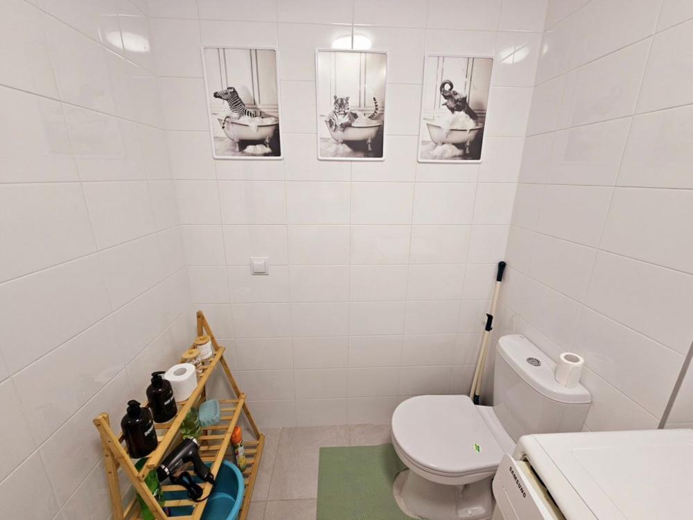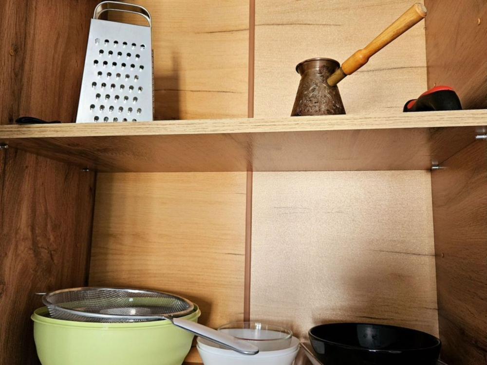 Полностью меблирована: 2 двуспальных кровати 160×200, 2 двуспальных дивана, пуф-раскладушка 180×70, шкаф , комод, кухонный гарнитур, стол, стулья. Бытовая техника: телевизор, стиральная машина, холодильник, микроволновая печь, электрический чайник, утюг, фен. А также все необходимое для проживания: постельное белье, комплекты полотенец, вся посуда, сушилка для белья, гладильная доска.