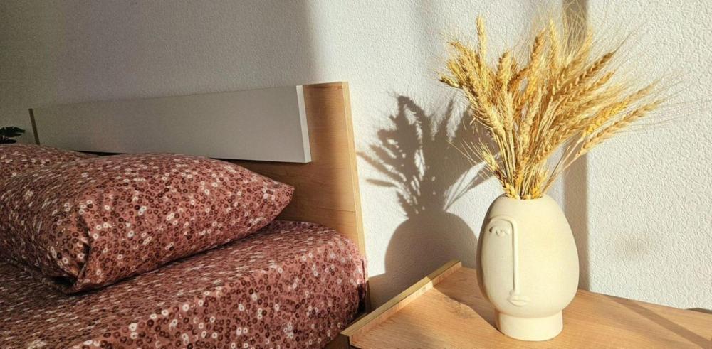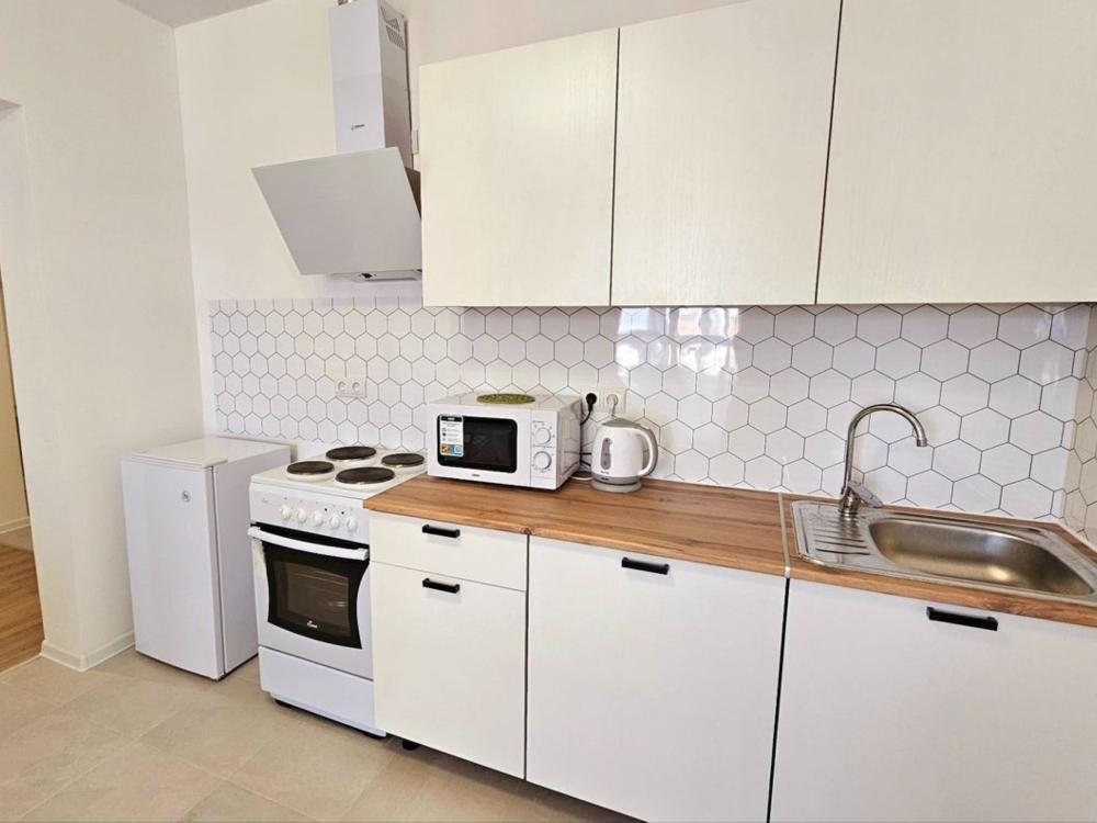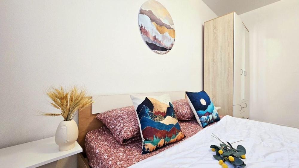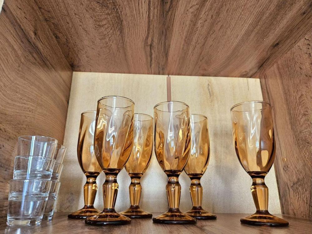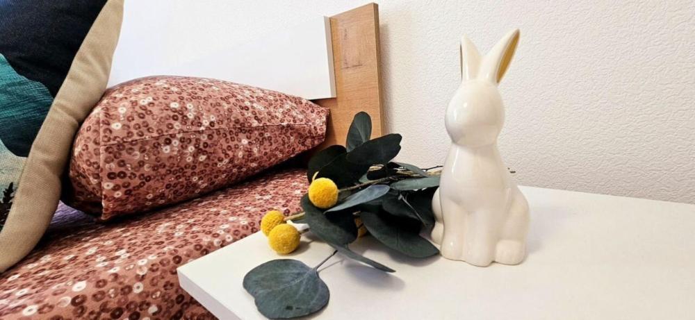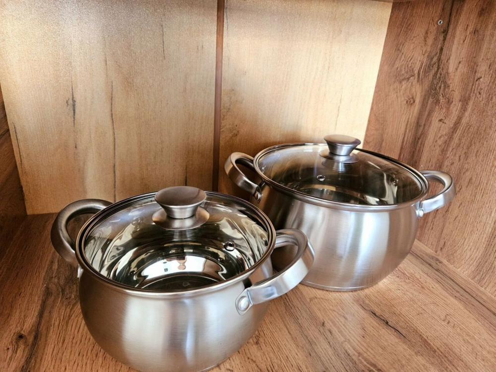 Полностью меблирована: 2 двуспальных кровати 160×200, 2 двуспальных дивана, пуф-раскладушка 180×70, шкаф , комод, кухонный гарнитур, стол, стулья. Бытовая техника: телевизор, стиральная машина, холодильник, микроволновая печь, электрический чайник, утюг, фен. А также все необходимое для проживания: постельное белье, комплекты полотенец, вся посуда, сушилка для белья, гладильная доска.