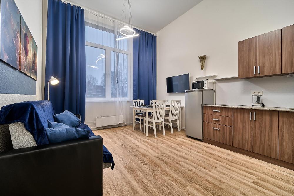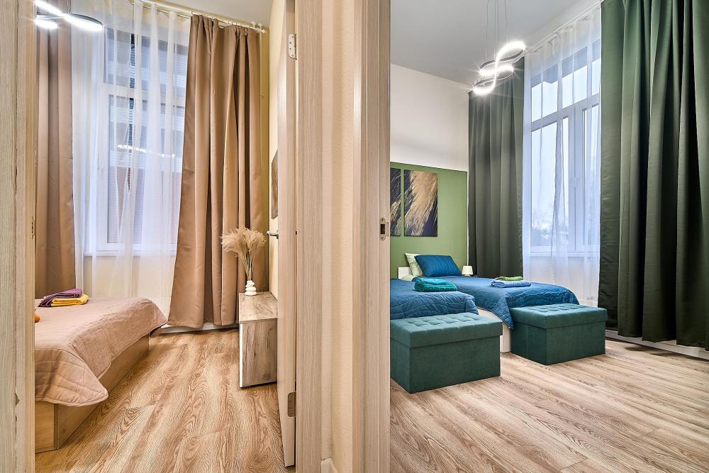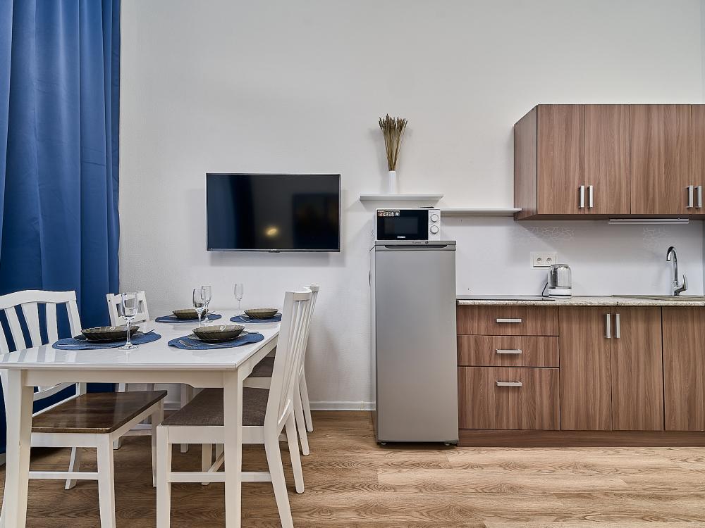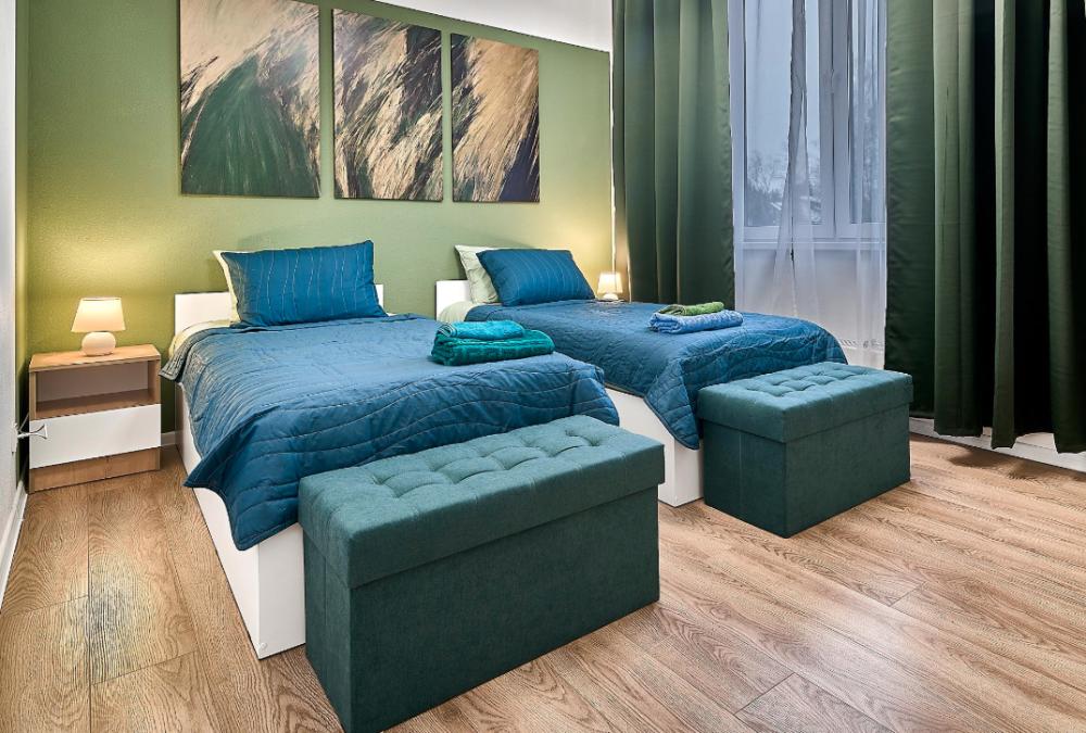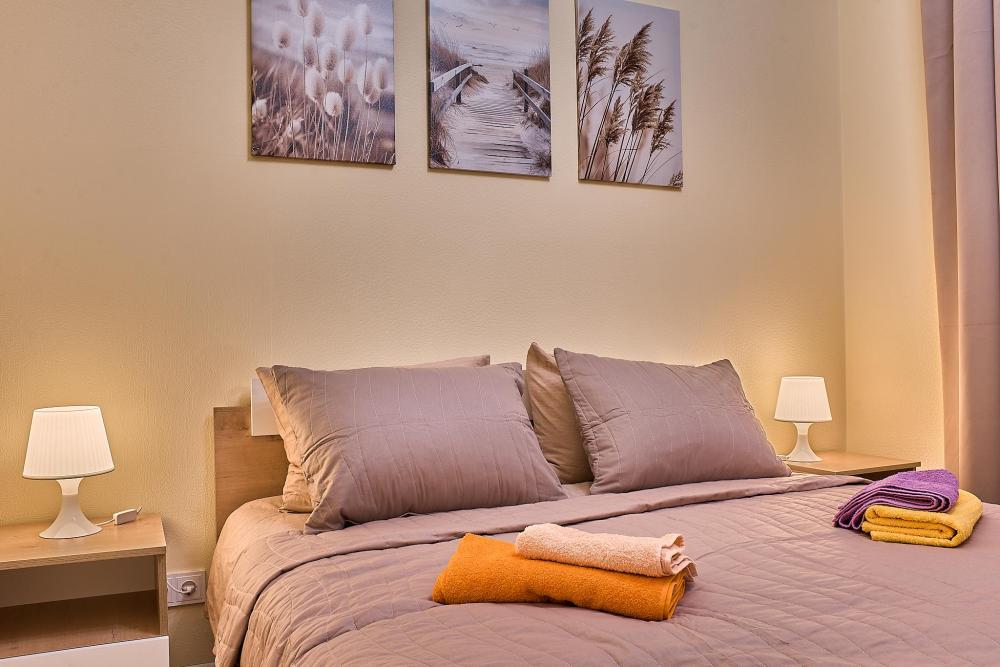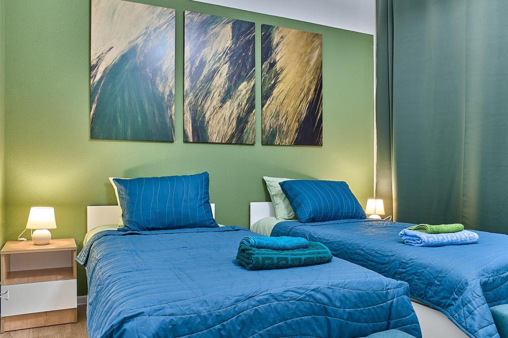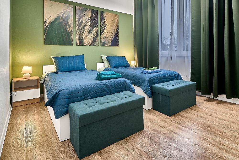 В апартаментах возможно размещение 4 гостей. Спальные места: двуспальная кровать 160×200, две односпальные кровати 90×200. Кухня оборудована необходимой посудой и техникой: плита, кофеварка, чайник, микроволновая печь, холодильник. К услугам гостей также wi-fi и телевизор Smаrt ТV, стиральная машина, постельное бельё и полотенца, фен для волос, утюг, одноразовые тапочки, средства гигиены.