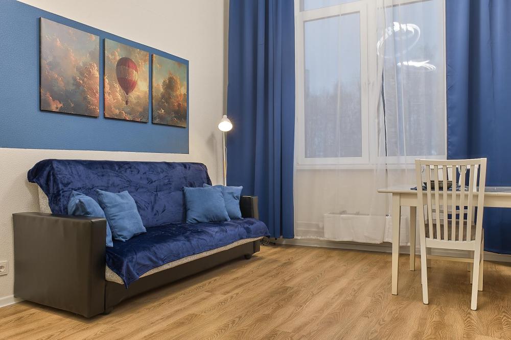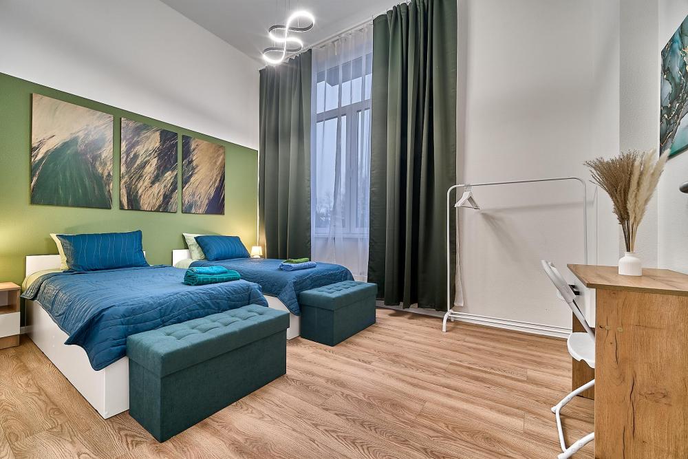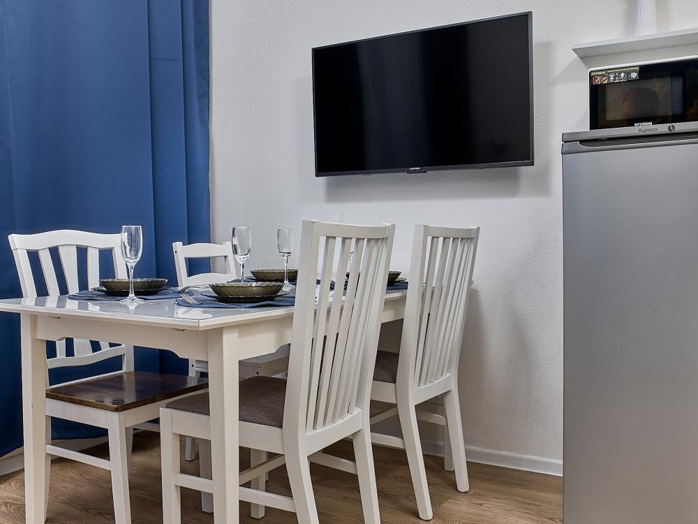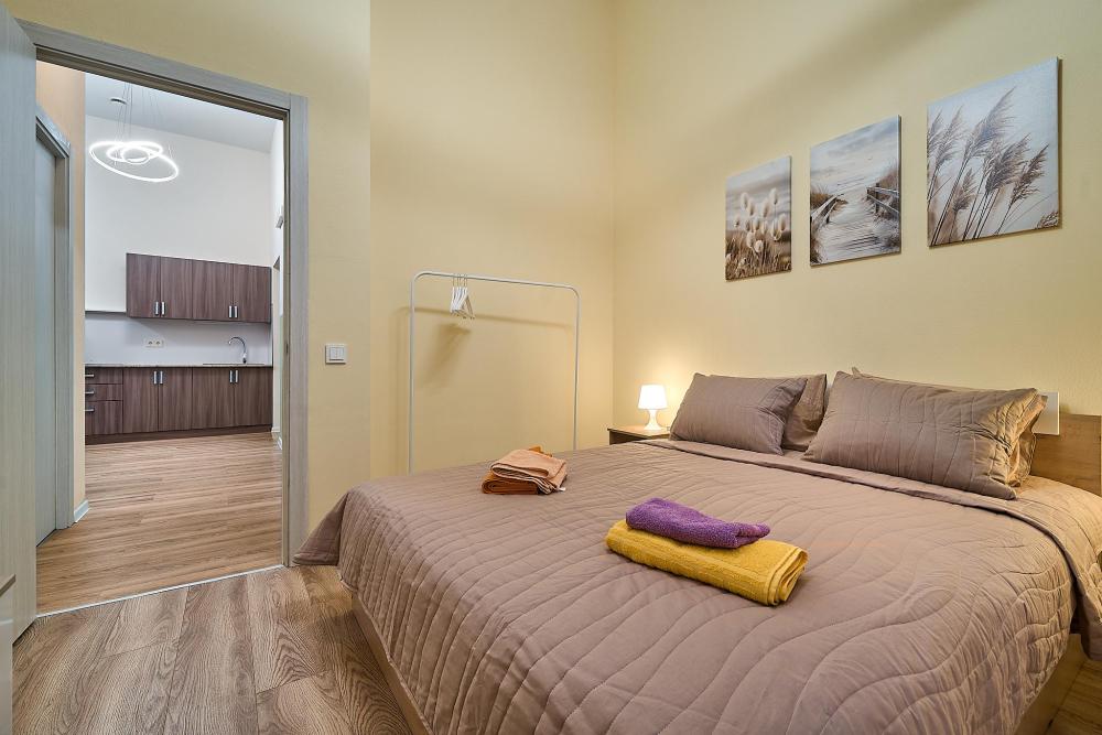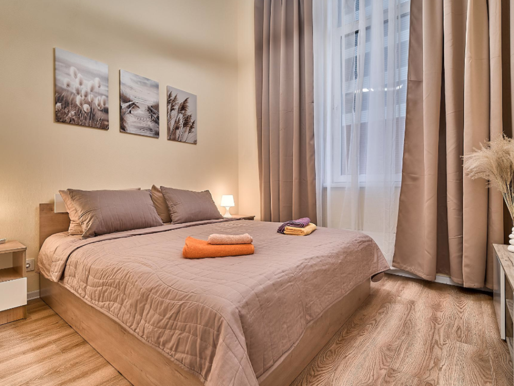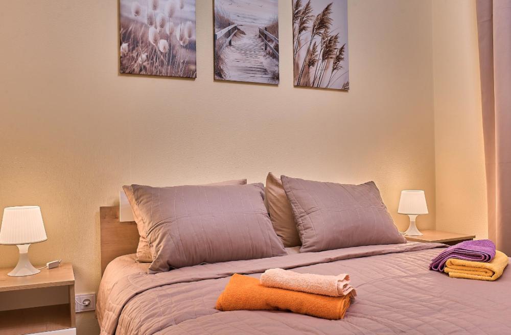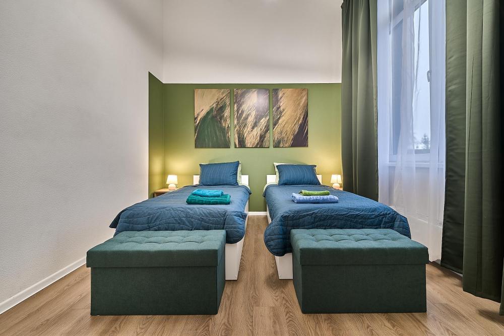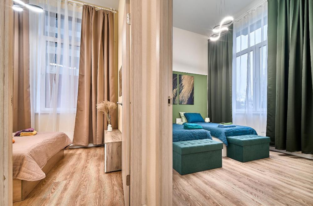 В апартаментах возможно размещение 4 гостей. Спальные места: двуспальная кровать 160×200, две односпальные кровати 90×200. Кухня оборудована необходимой посудой и техникой: плита, кофеварка, чайник, микроволновая печь, холодильник. К услугам гостей также wi-fi и телевизор Smаrt ТV, стиральная машина, постельное бельё и полотенца, фен для волос, утюг, одноразовые тапочки, средства гигиены.