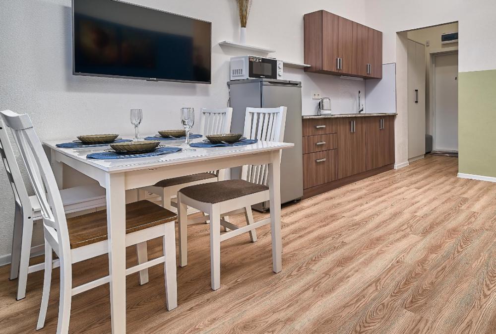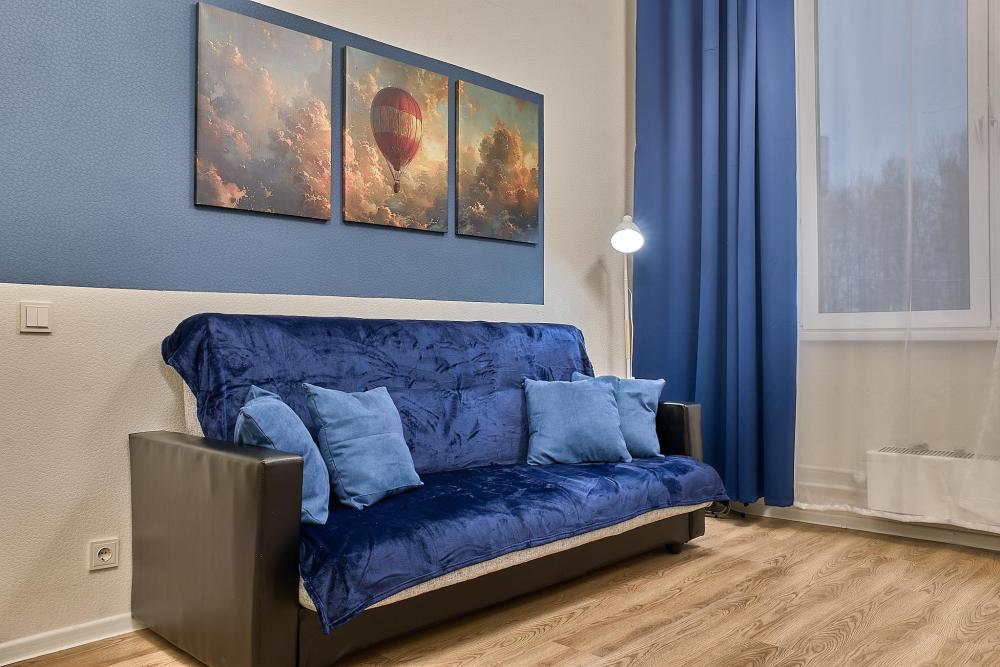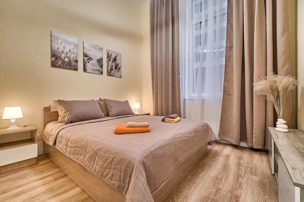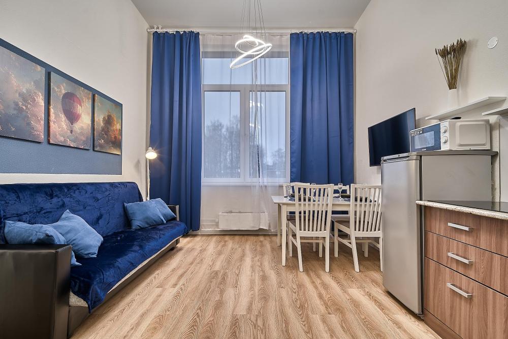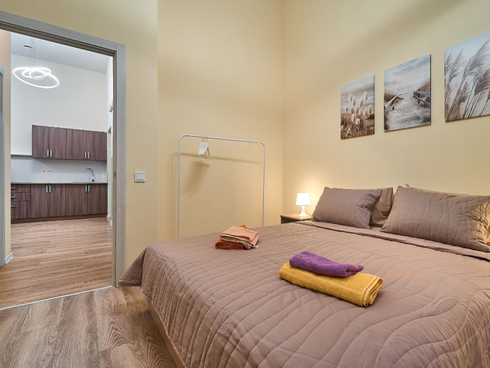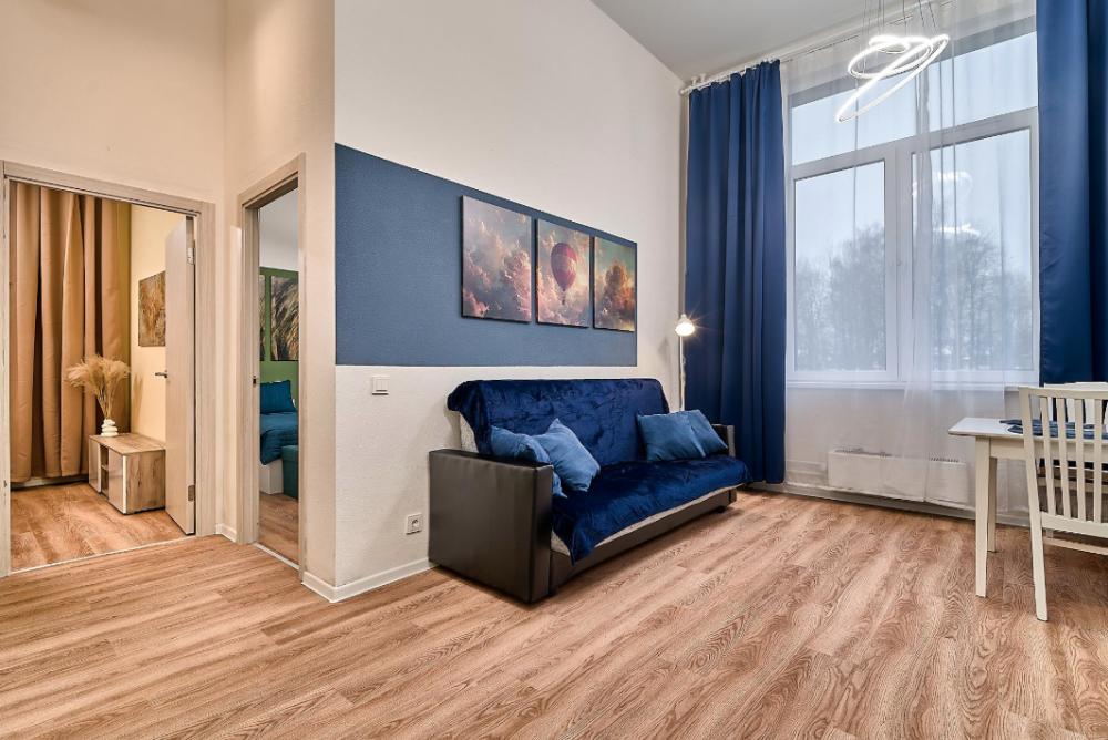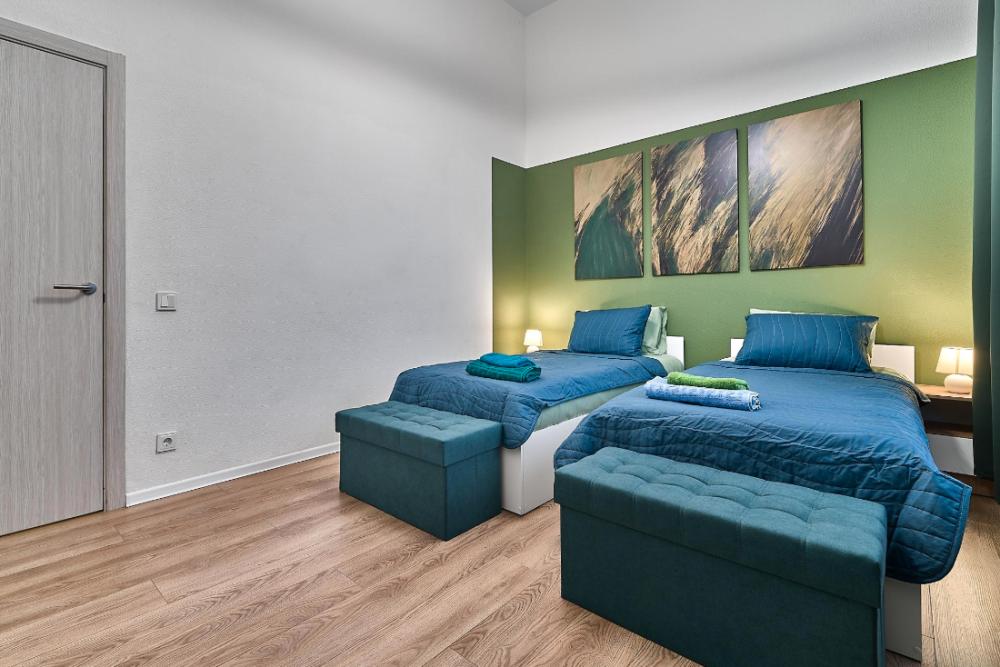 В апартаментах возможно размещение 4 гостей. Спальные места: двуспальная кровать 160×200, две односпальные кровати 90×200. Кухня оборудована необходимой посудой и техникой: плита, кофеварка, чайник, микроволновая печь, холодильник. К услугам гостей также wi-fi и телевизор Smаrt ТV, стиральная машина, постельное бельё и полотенца, фен для волос, утюг, одноразовые тапочки, средства гигиены.