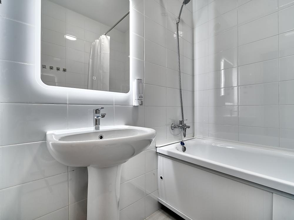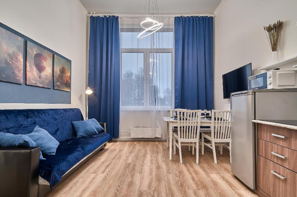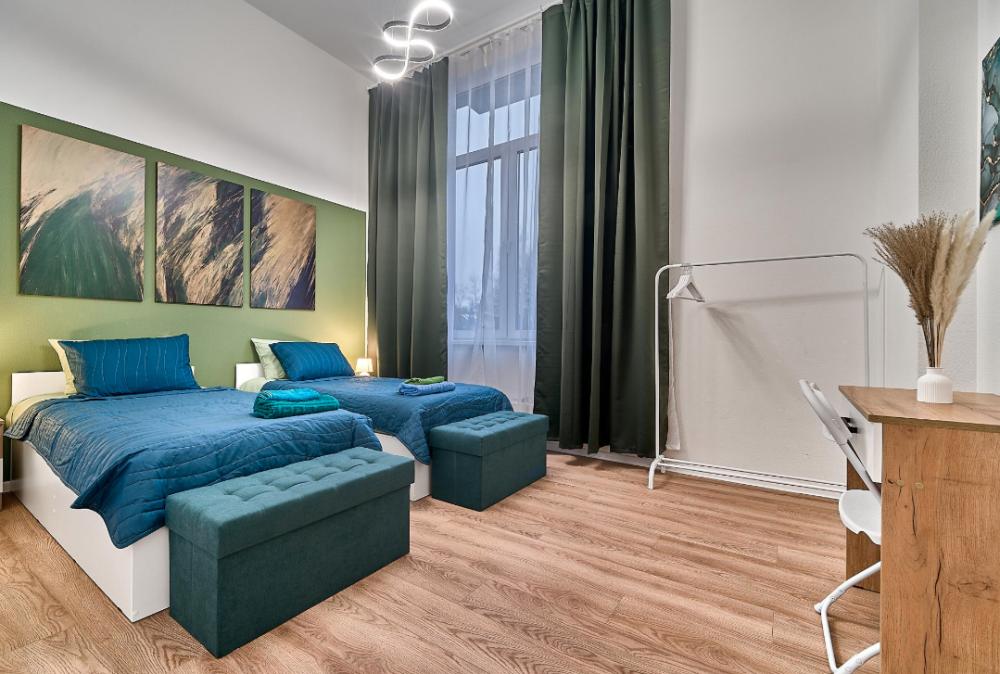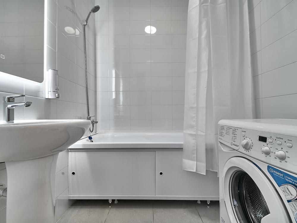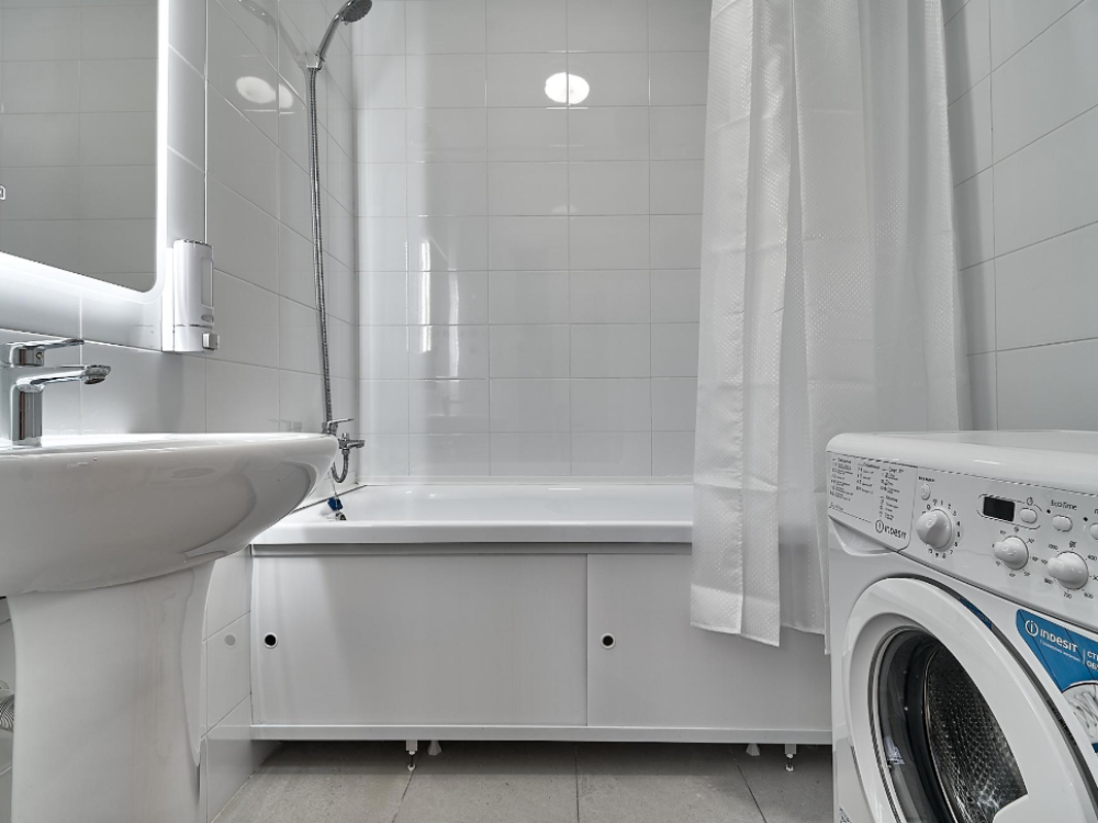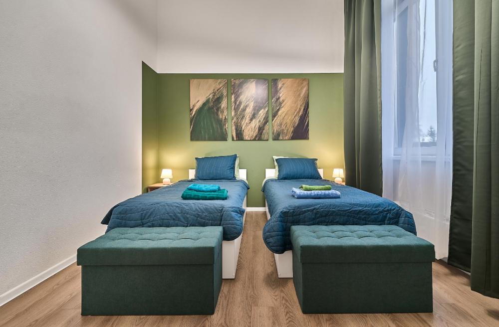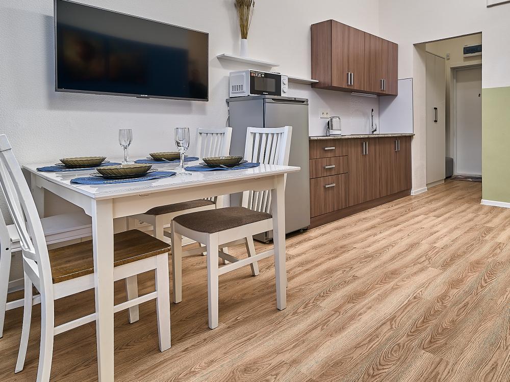 В апартаментах возможно размещение 4 гостей. Спальные места: двуспальная кровать 160×200, две односпальные кровати 90×200. Кухня оборудована необходимой посудой и техникой: плита, кофеварка, чайник, микроволновая печь, холодильник. К услугам гостей также wi-fi и телевизор Smаrt ТV, стиральная машина, постельное бельё и полотенца, фен для волос, утюг, одноразовые тапочки, средства гигиены.