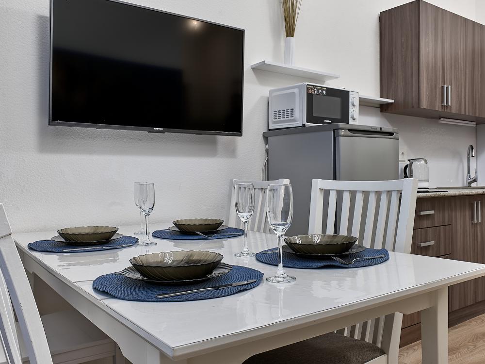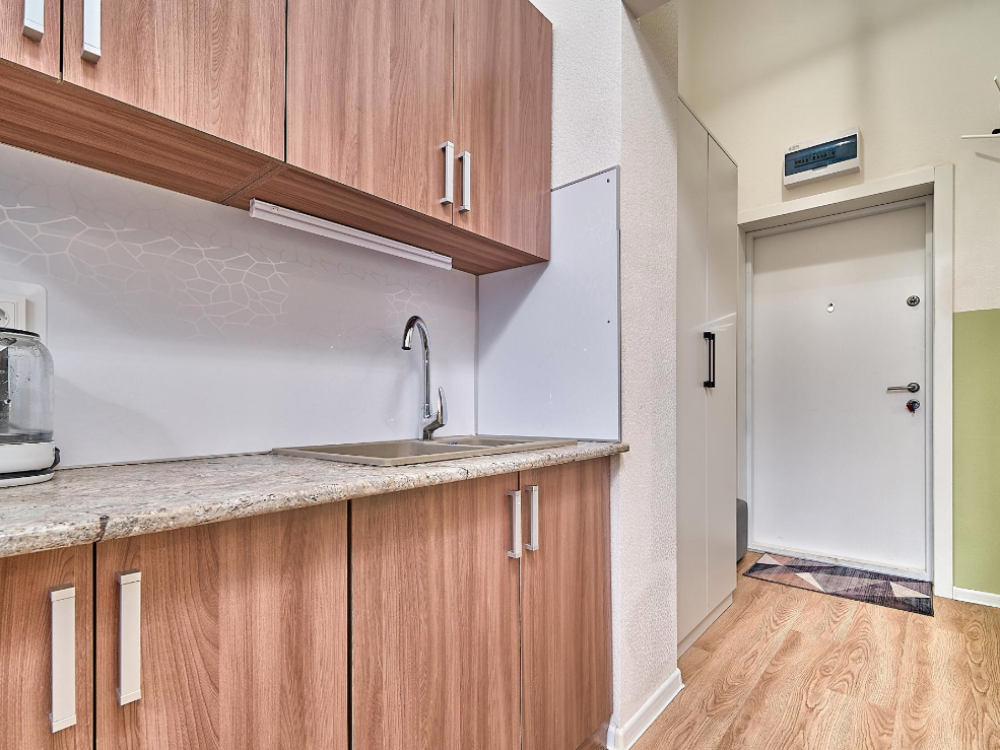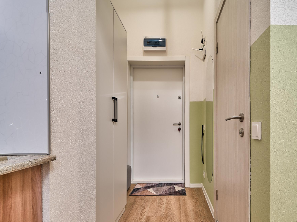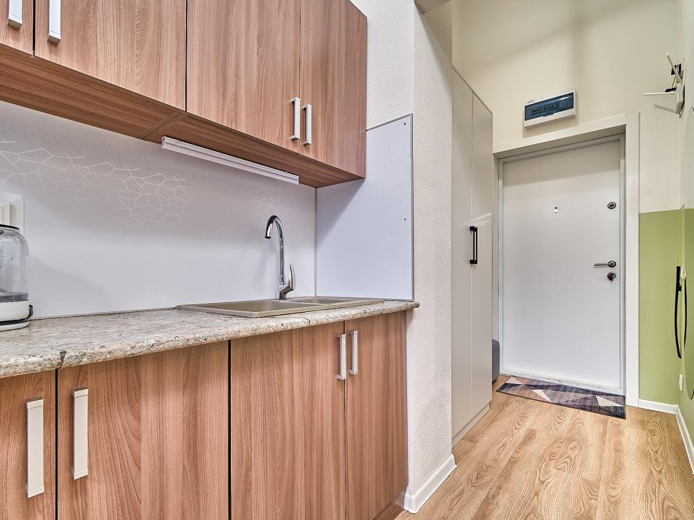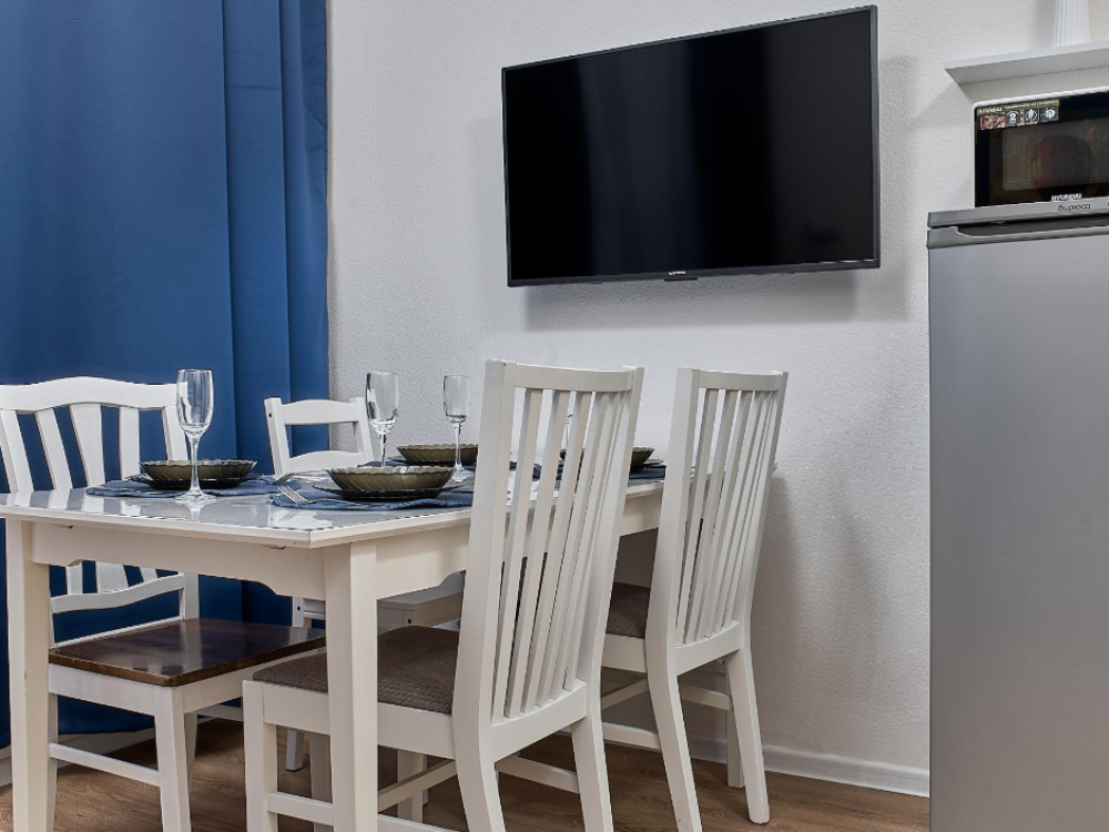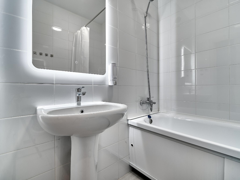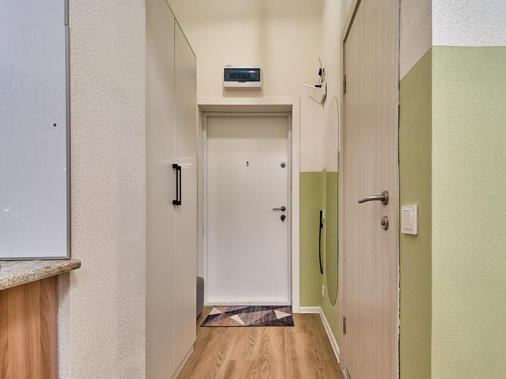 В апартаментах возможно размещение 4 гостей. Спальные места: двуспальная кровать 160×200, две односпальные кровати 90×200. Кухня оборудована необходимой посудой и техникой: плита, кофеварка, чайник, микроволновая печь, холодильник. К услугам гостей также wi-fi и телевизор Smаrt ТV, стиральная машина, постельное бельё и полотенца, фен для волос, утюг, одноразовые тапочки, средства гигиены.
