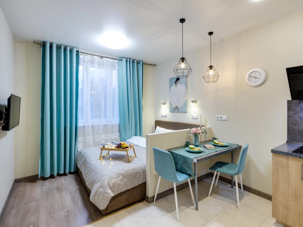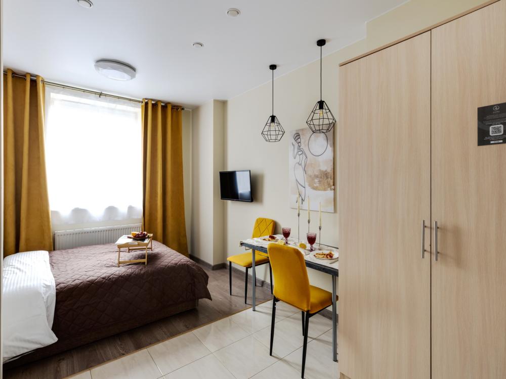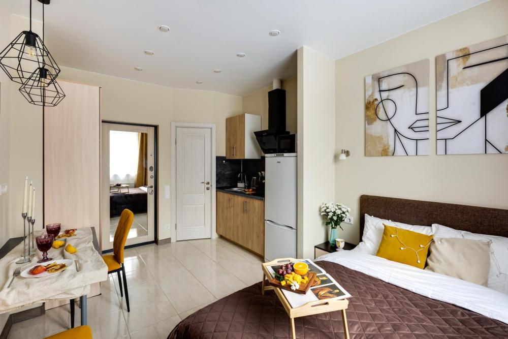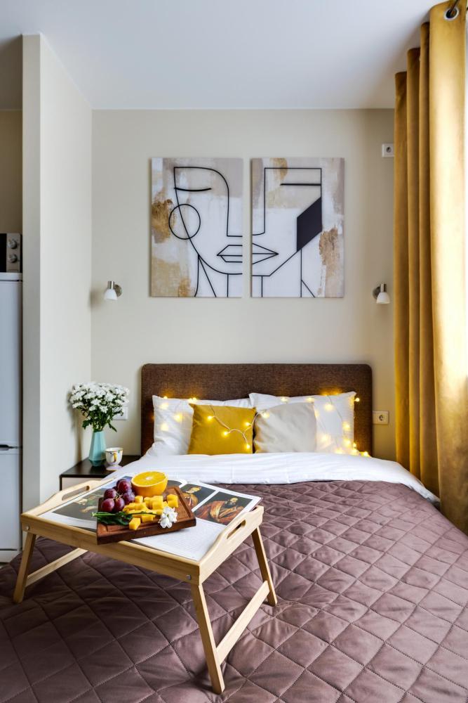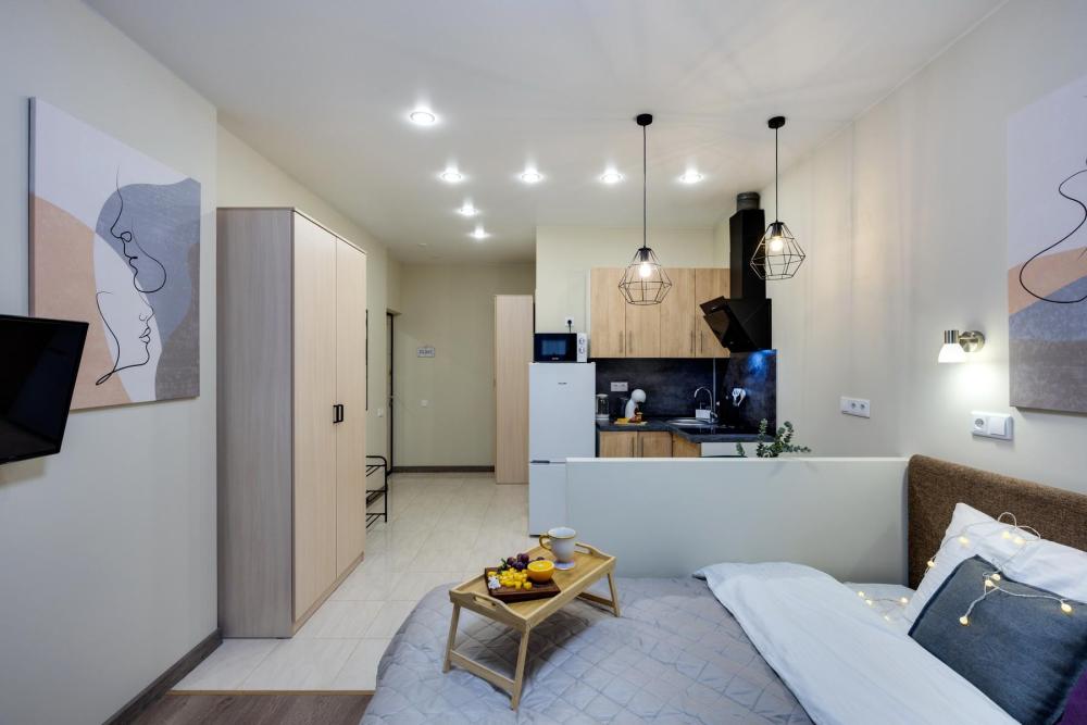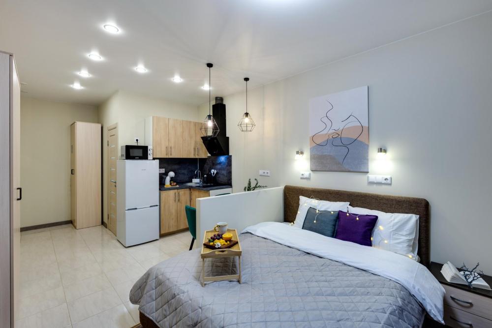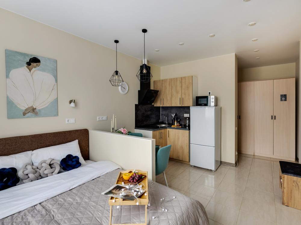 Современные апартаменты-студия с балконом для уютных вечеров, выполнена в стильных и теплых тонах. Идеальный вариант для пары или самостоятельного проживания, где каждая деталь создана для комфорта и уюта. Для комфортного проживания гостей апартаменты оборудованы всем необходимым: уютная двуспальная кровать 160×200 см с ортопедическим матрасом и качественным постельным бельем, полноценная кухня с индукционной варочной панелью, капсульной кофе-машиной, стиральная машина, фен, утюг, Smart TV и бесплатный Wi-Fi. Продуманные детали: шторы blackout для отличного сна, фильтр для воды и вся необходимая посуда для приготовления любимых блюд. Забота о гостях: приветственный набор (чай, кофе, сахар), комплекты полотенец и средства гигиены (шампунь, гель, мыло), а также тапочки.
