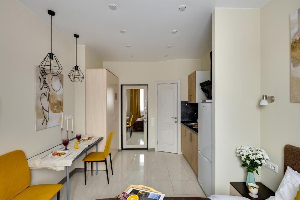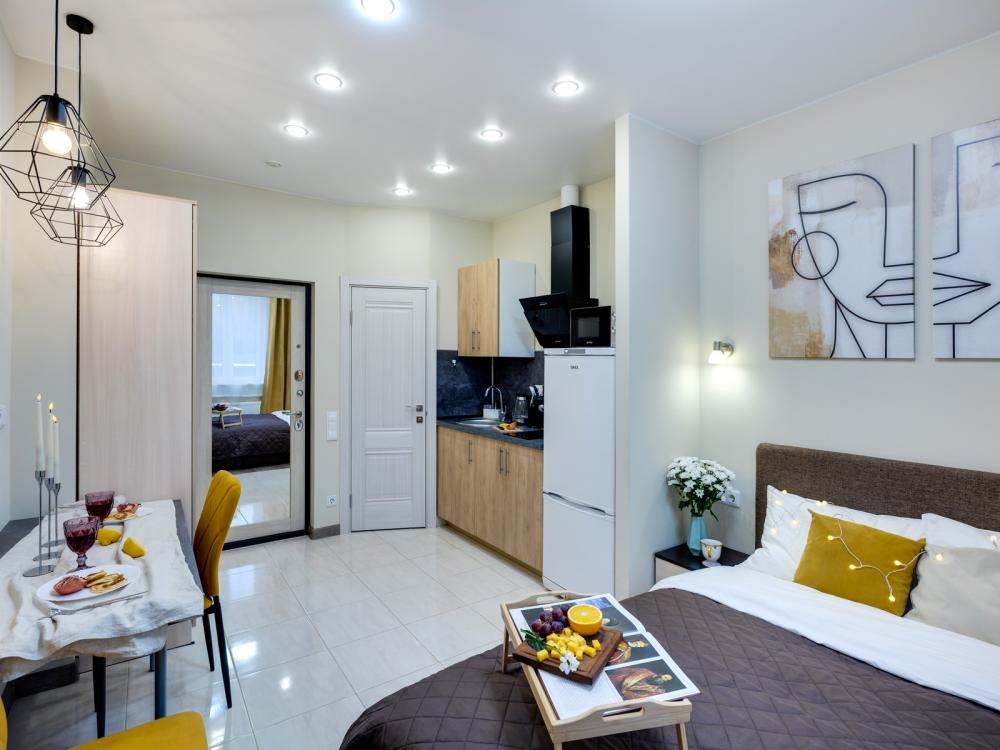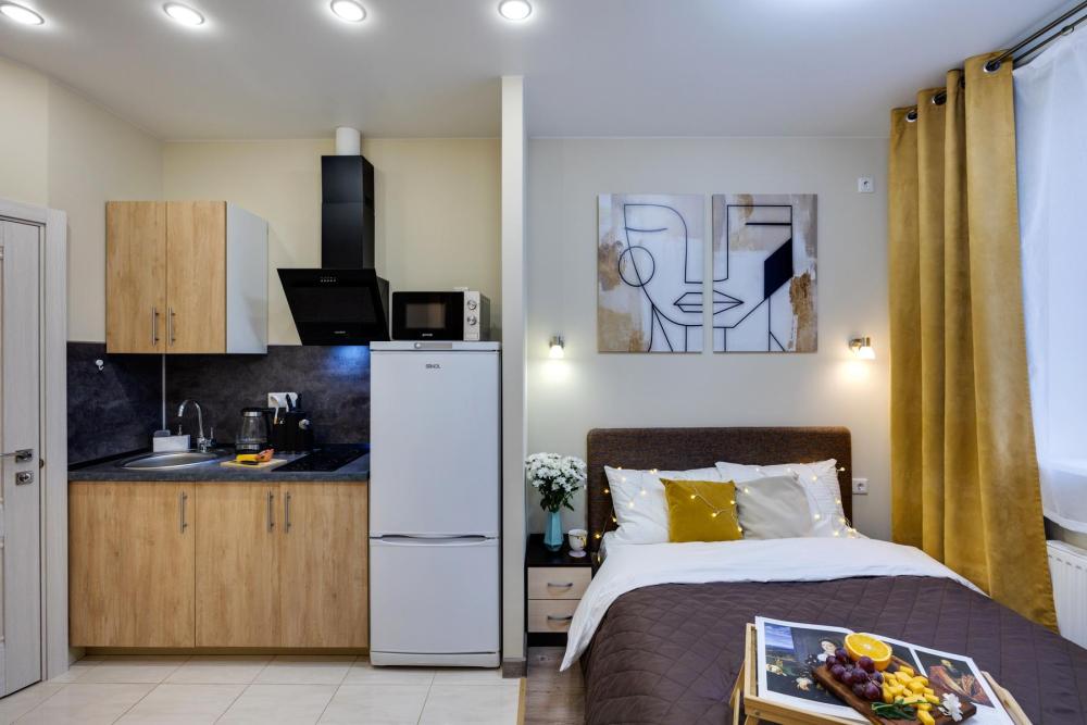 Уютная студия «Эллида» от HOME24 в ЖК "Одинбург" для идеального отдыха. Почувствуйте себя как дома в современной студии, выполненной в уютных и солнечных тонах. Идеальный вариант для пары или самостоятельного проживания, где каждая деталь создана для вашего комфорта и Комфортный отдых: Уютная двуспальная кровать 140×200 см с ортопедическим матрасом и качественным постельным бельем. Современная техника: полноценная кухня с индукционной варочной панелью, стиральная машина, фен, утюг, Smart TV и бесплатный Wi-Fi. Продуманные детали: шторы blackout для отличного сна, фильтр для воды и вся необходимая посуда для приготовления любимых блюд. Забота о гостях: приветственный набор (чай, кофе, сахар), комплекты полотенец и средства гигиены (шампунь, гель, мыло),а также тапочки.