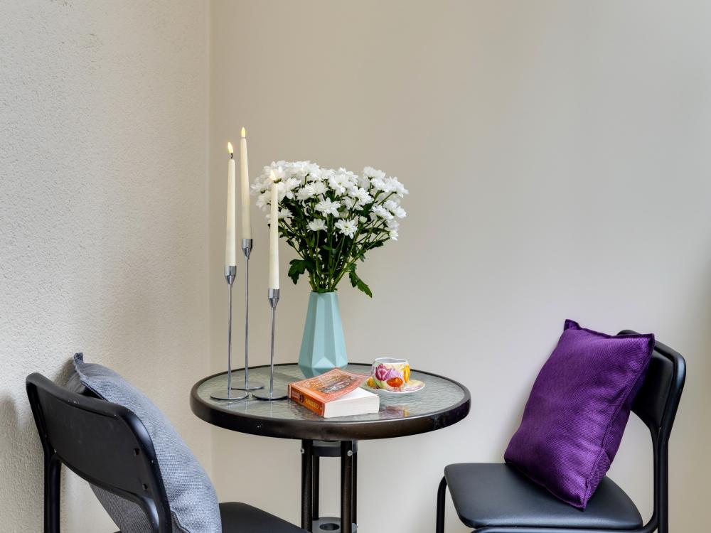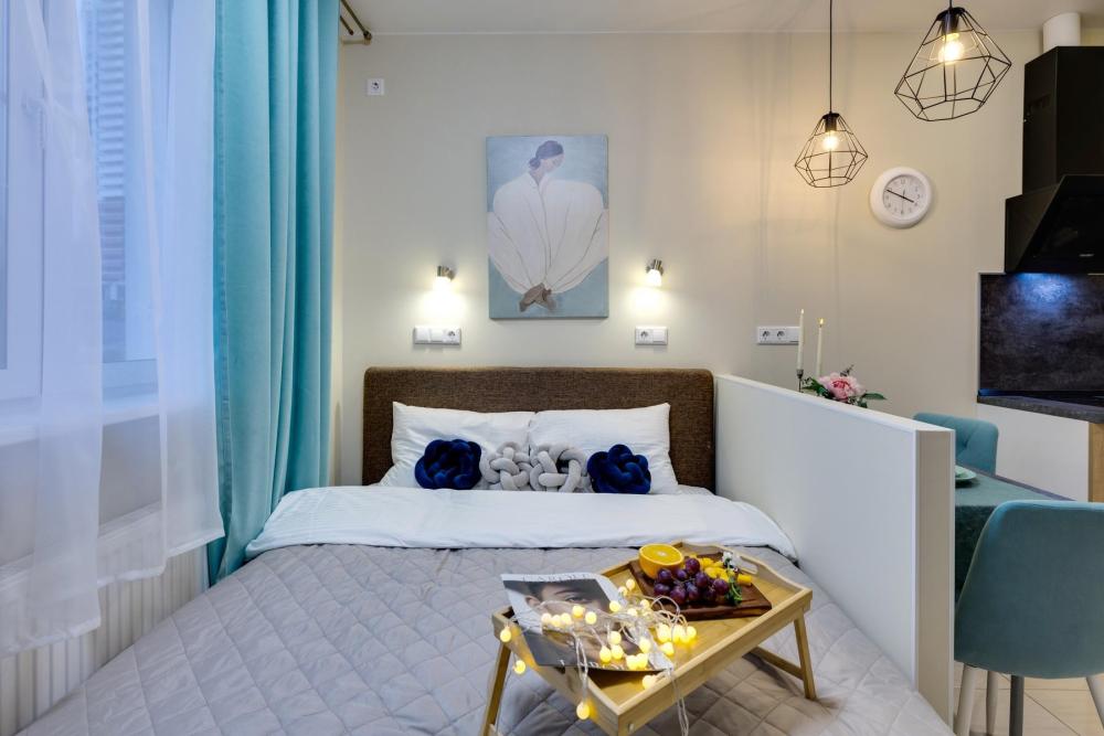 Уютная студия «Энигма» от HOME24 в ЖК "Одинбург" для идеального отдыха. Почувствуйте себя как дома в современной студии, выполненной в нежных и спокойных тонах. Идеальный вариант для пары или самостоятельного проживания, где каждая деталь создана для вашего комфорта и уюта. Комфортный отдых: уютная двуспальная кровать 160×200 см с ортопедическим матрасом и качественным постельным бельем. Современная техника: полноценная кухня с индукционной варочной панелью, стиральная машина, фен, утюг, Smart TV и бесплатный Wi-Fi. Продуманные детали: шторы blackout для отличного сна, фильтр для воды и вся необходимая посуда для приготовления любимых блюд. Забота о гостях: приветственный набор (чай, кофе, сахар), комплекты полотенец и средства гигиены (шампунь, гель, мыло), а также тапочки.