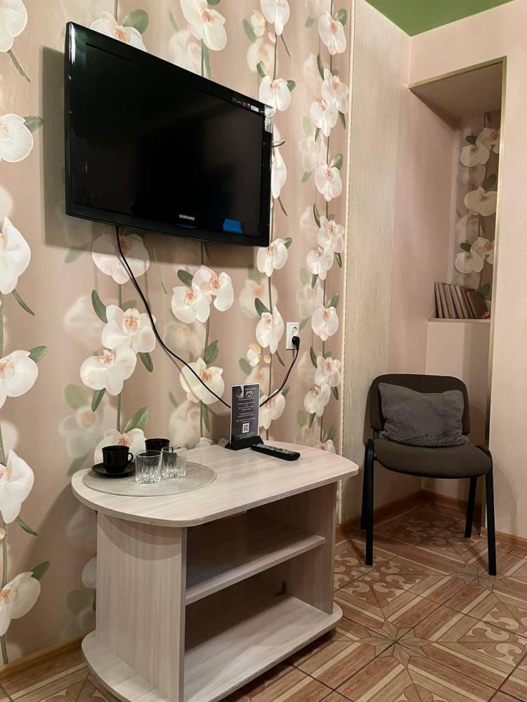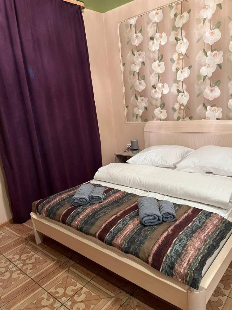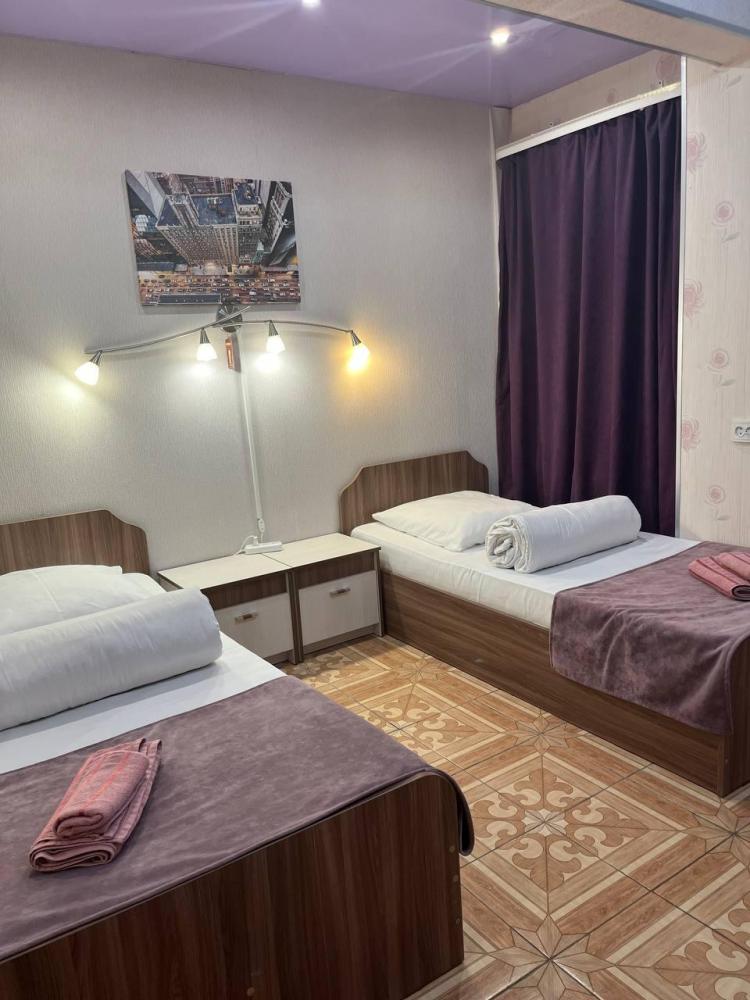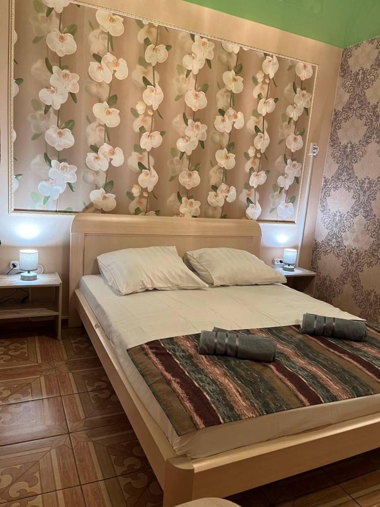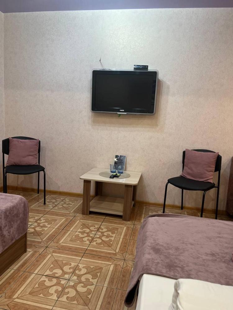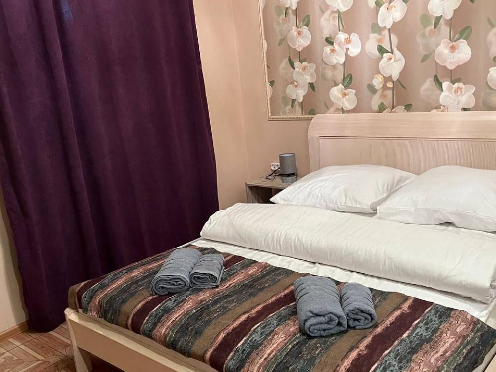 Номер укомплектован двуспальной кроватью с удобным матрасом, прикроватными тумбами, столиком, стульями, большим плазменным телевизором. В номере предусмотрена туалетная комната без душа. Душ на этаже!