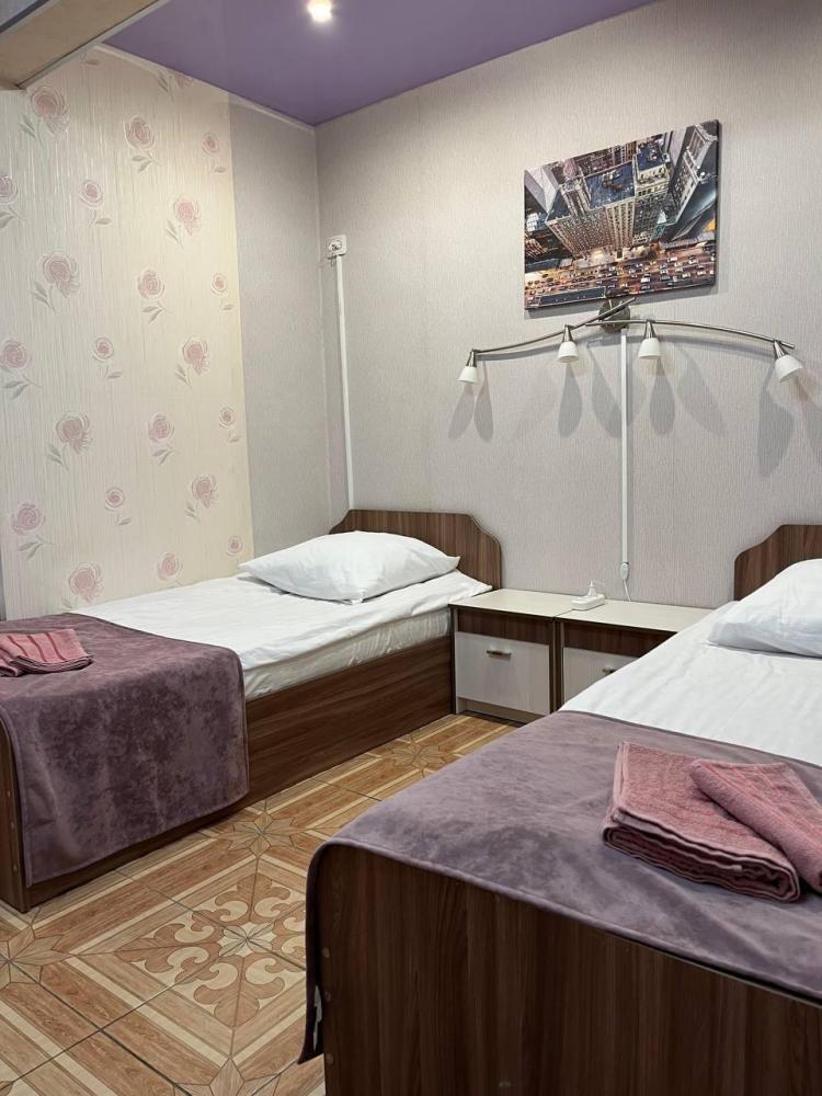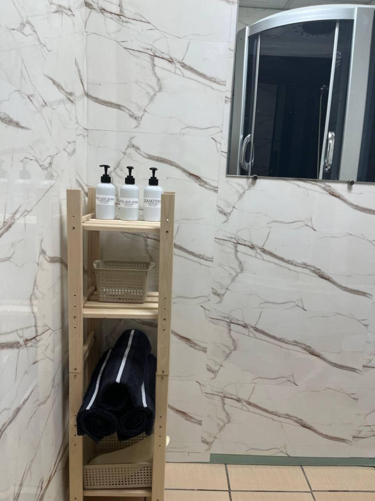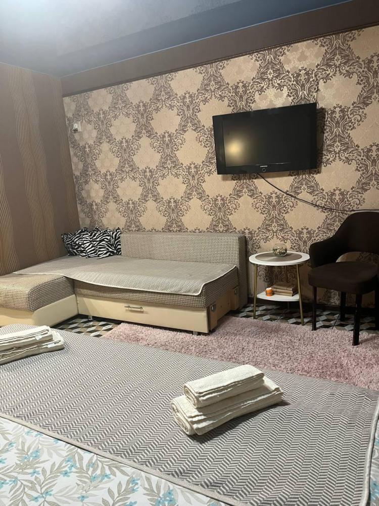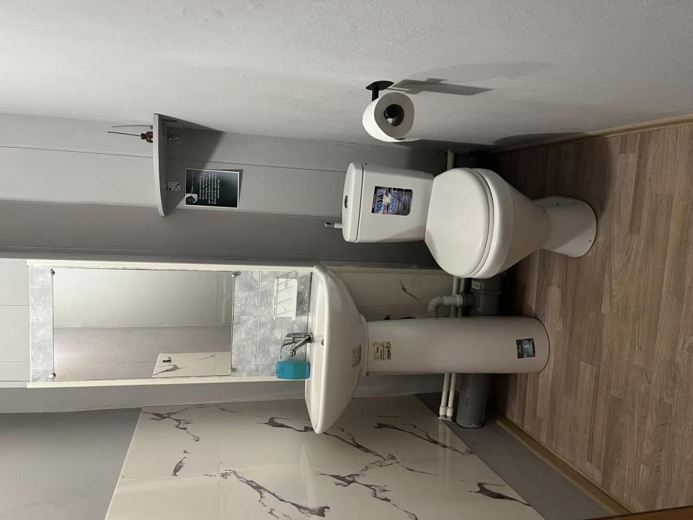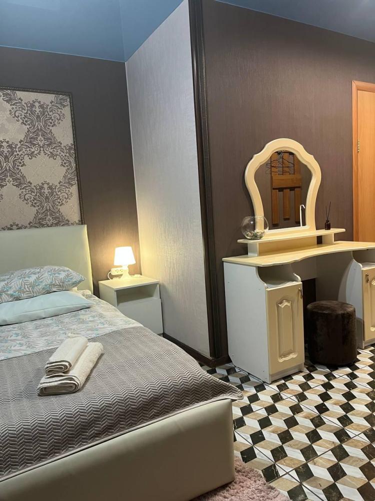 Номер укомплектован двуспальной кроватью с удобным матрасом, прикроватными тумбами, столиком, стульями, большим плазменным телевизором. В номере предусмотрена туалетная комната без душа. Душ на этаже!