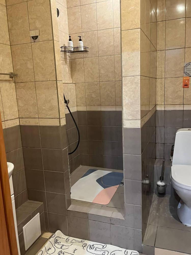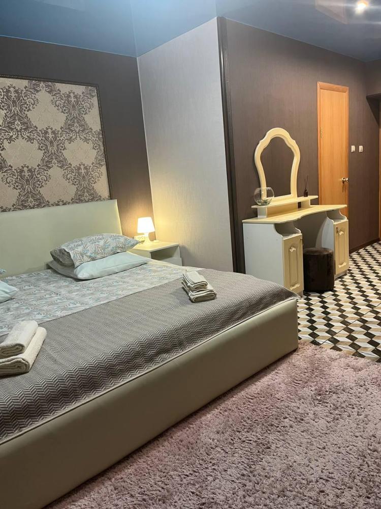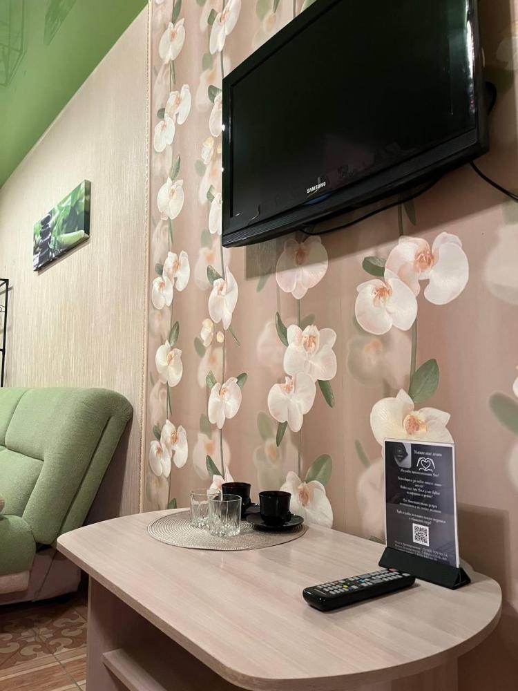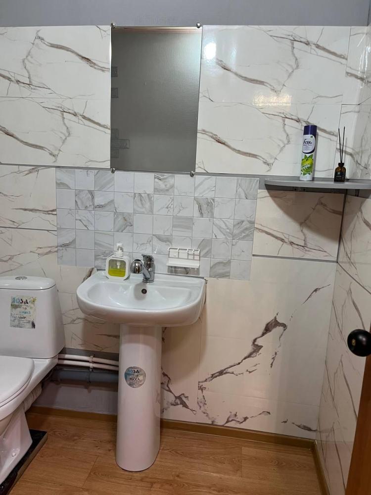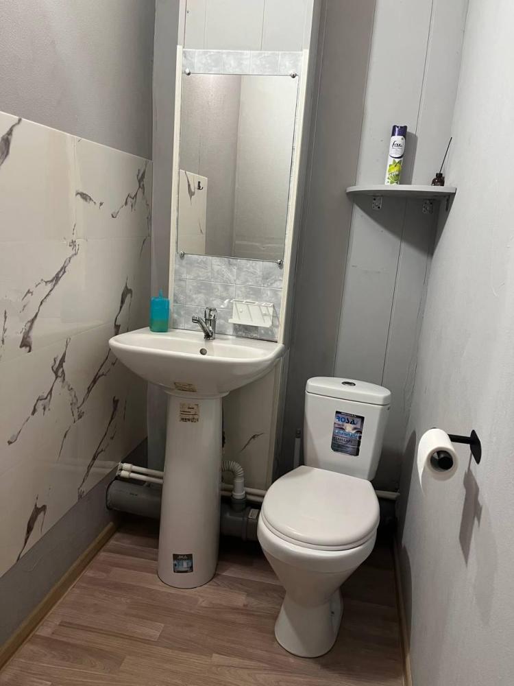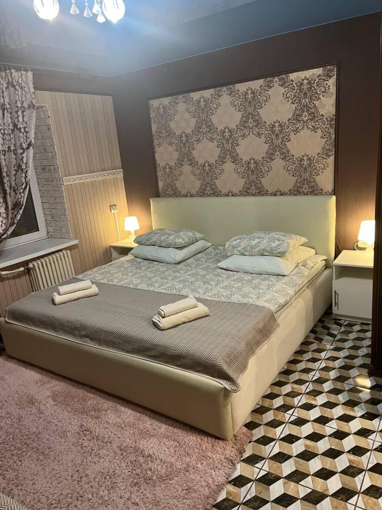 Номер укомплектован двуспальной кроватью с удобным матрасом, прикроватными тумбами, столиком, стульями, большим плазменным телевизором. В номере предусмотрена туалетная комната без душа. Душ на этаже!