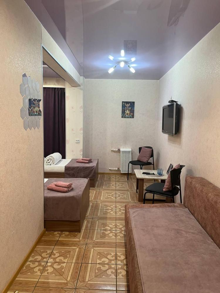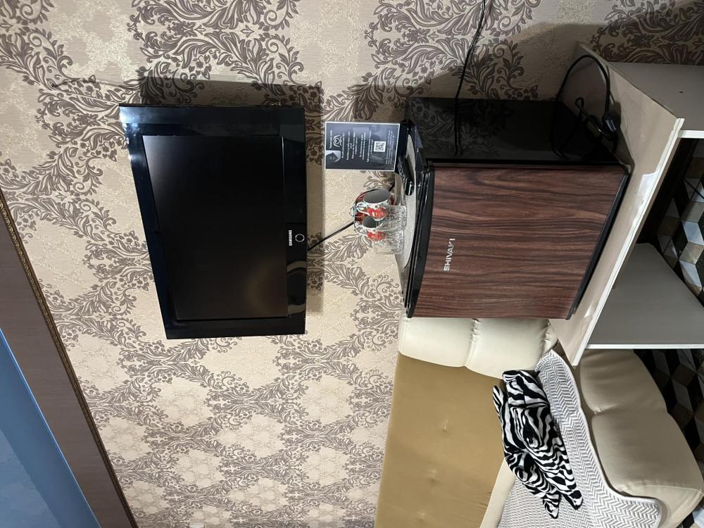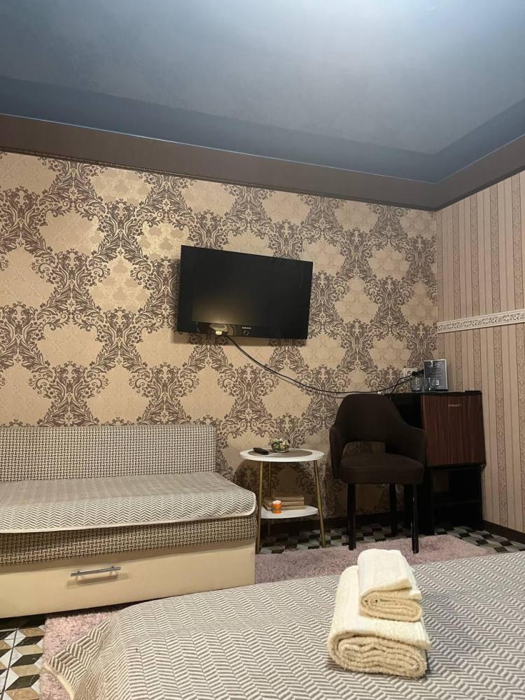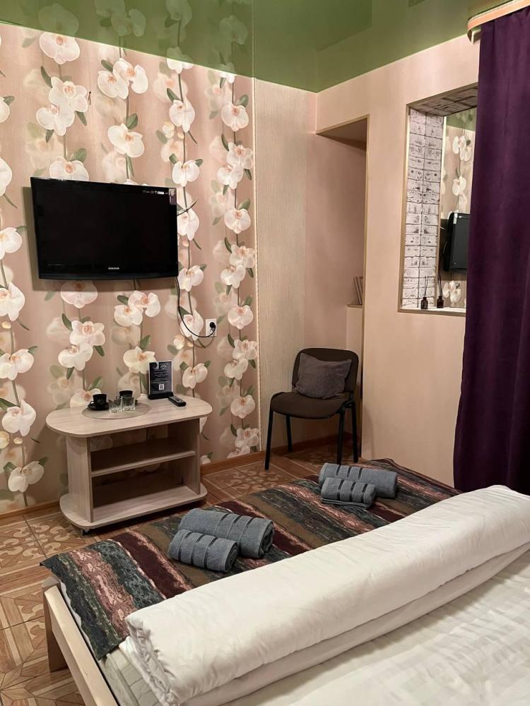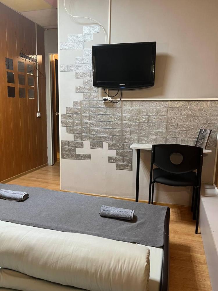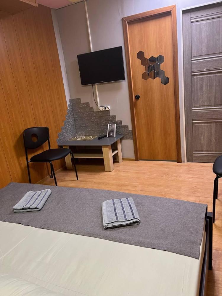 Номер укомплектован одной двуспальной кроватью, столиком, стулом, плазменным телевизором. В номере предусмотрена туалетная комната без душа. Без окна. Душ на этаже!