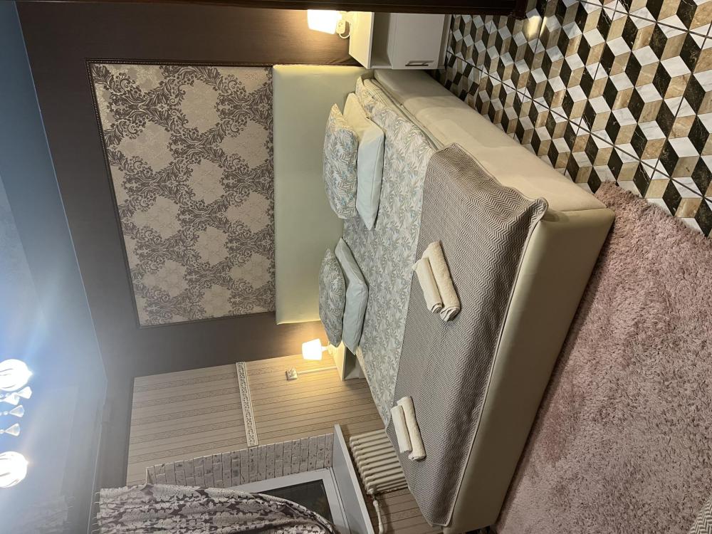 Номер Комфорт категории Люкс выполнен в классическом сдержанном стиле, укомплектован большой кроватью размера Max King Size с ортопедическим матрасом, большим угловым диваном. Кроме этого в номере предусмотрен барный холодильник, большой плазменный телевизор, зона с туалетным столиком и гримерное зеркало с пуфиком, а так же другими деталями, обеспечивающими комфортабельный отдых при длительном проживании. В номере расположена индивидуальная туалетная комната с душем и качественными косметическими средствами, полотенцами, халатами и тапочками.