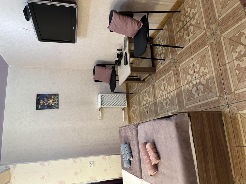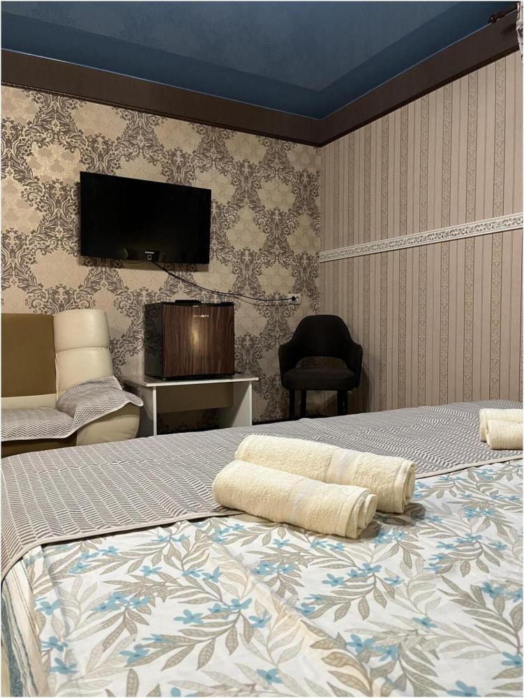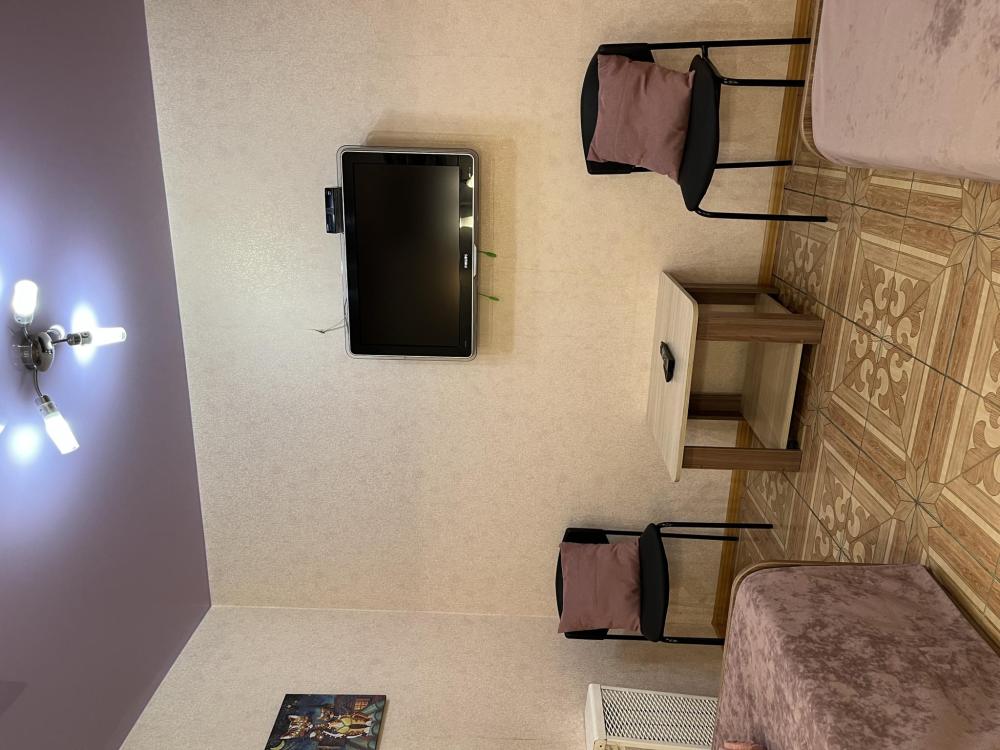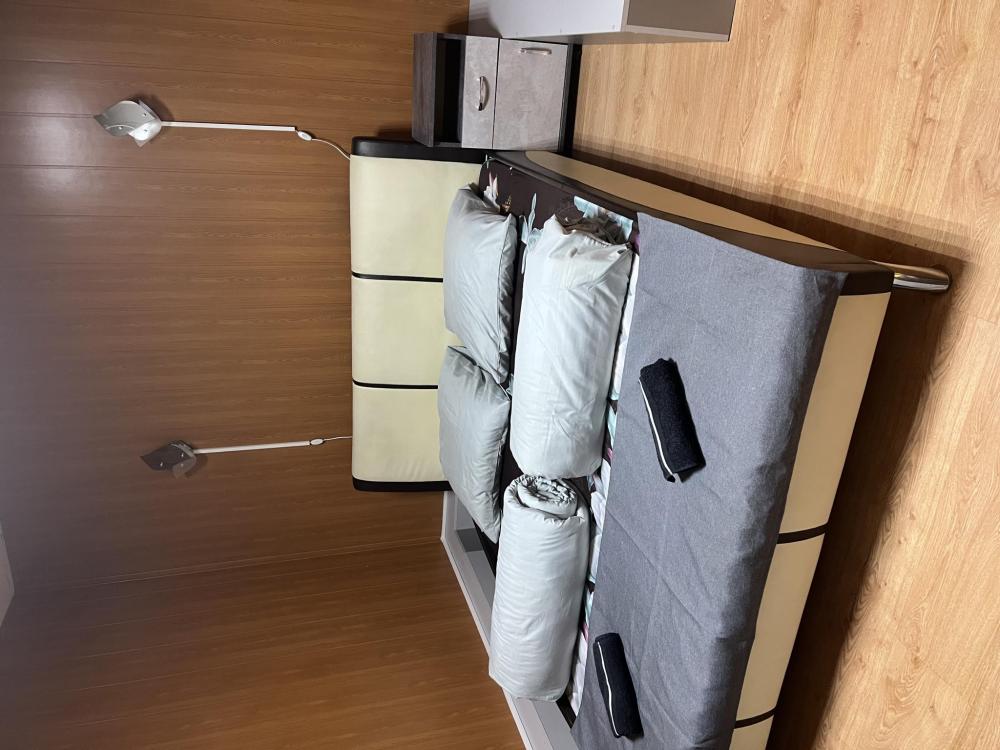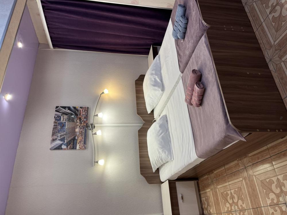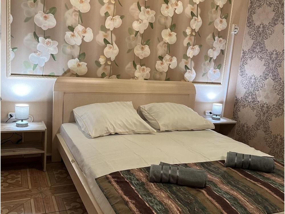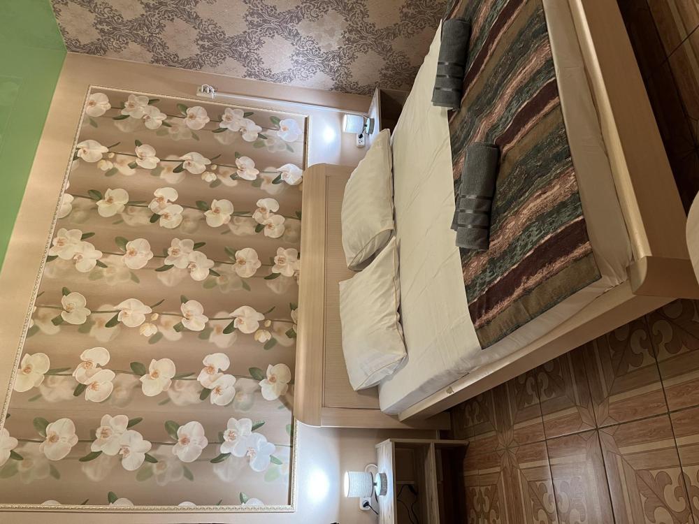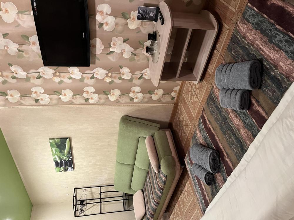 Стандарт улучшенный с двуспальной Номер укомплектован большой двуспальной кроватью с ортопедическим матрасом, диваном в качестве доп места, зоной с туалетным столиком, большим плазменным телевизором. Так же в номере предусмотрен индивидуальный сан узел с душем.