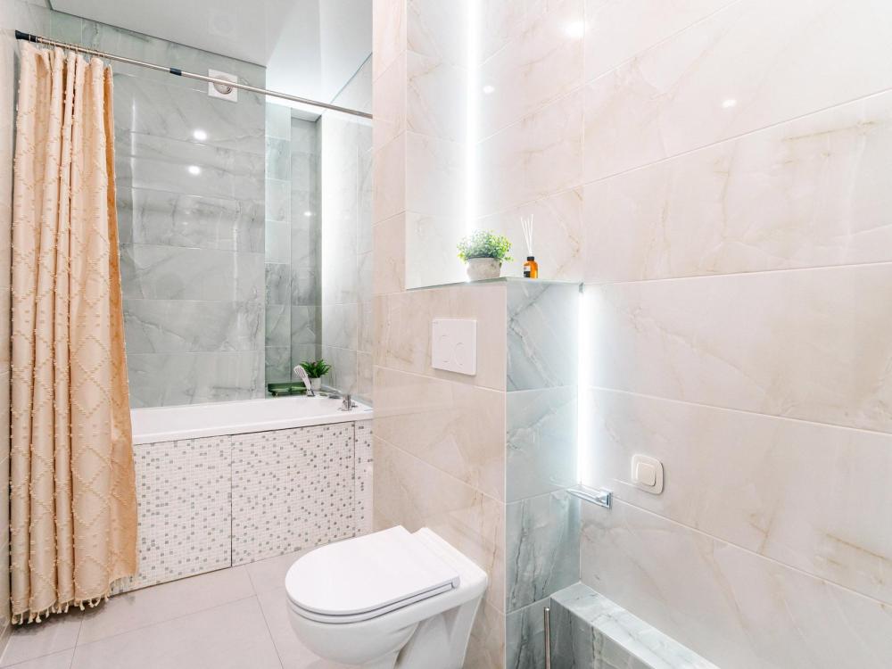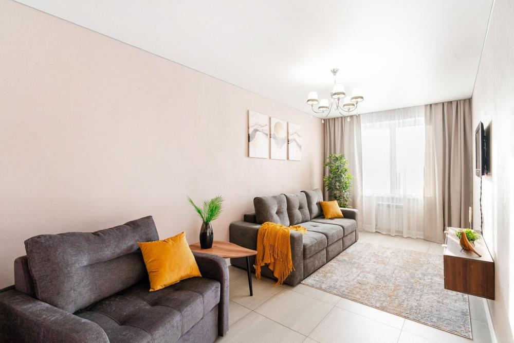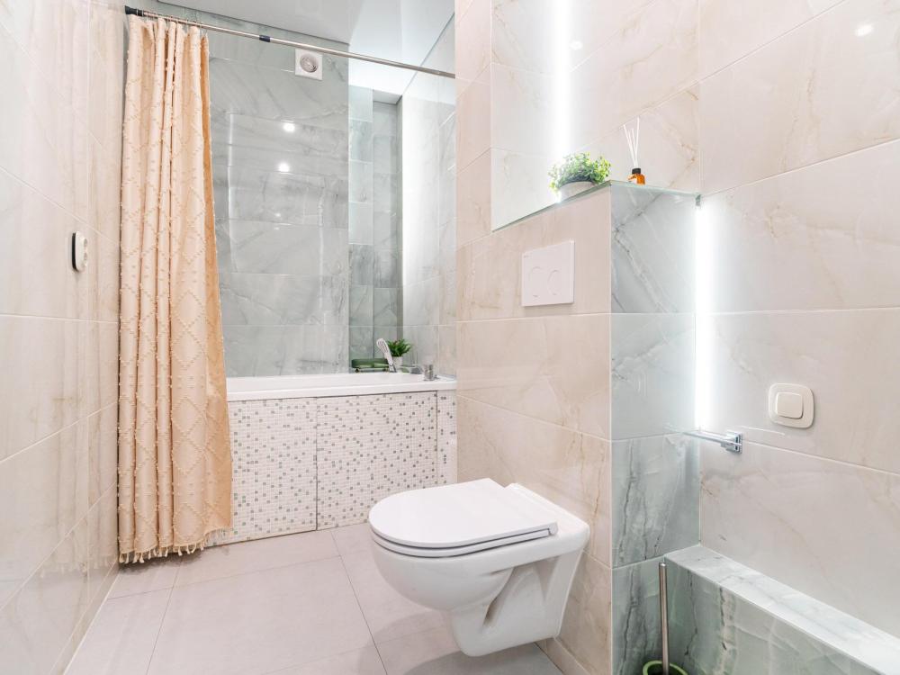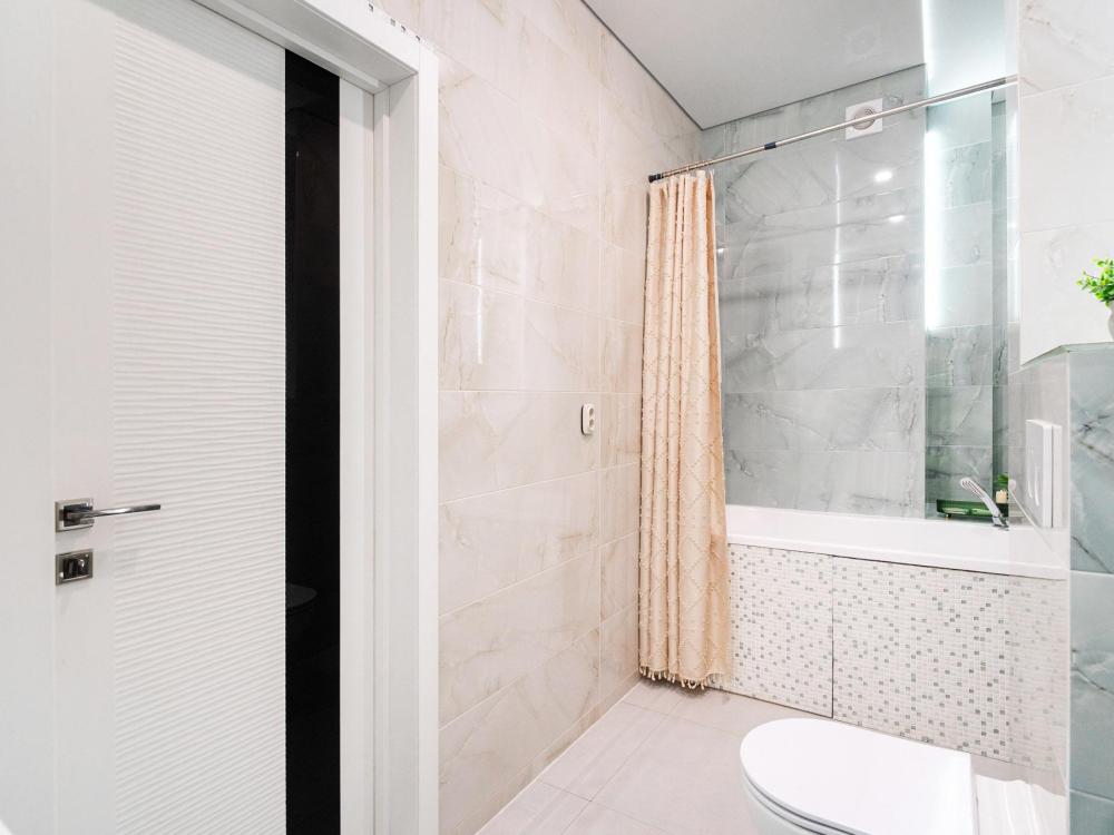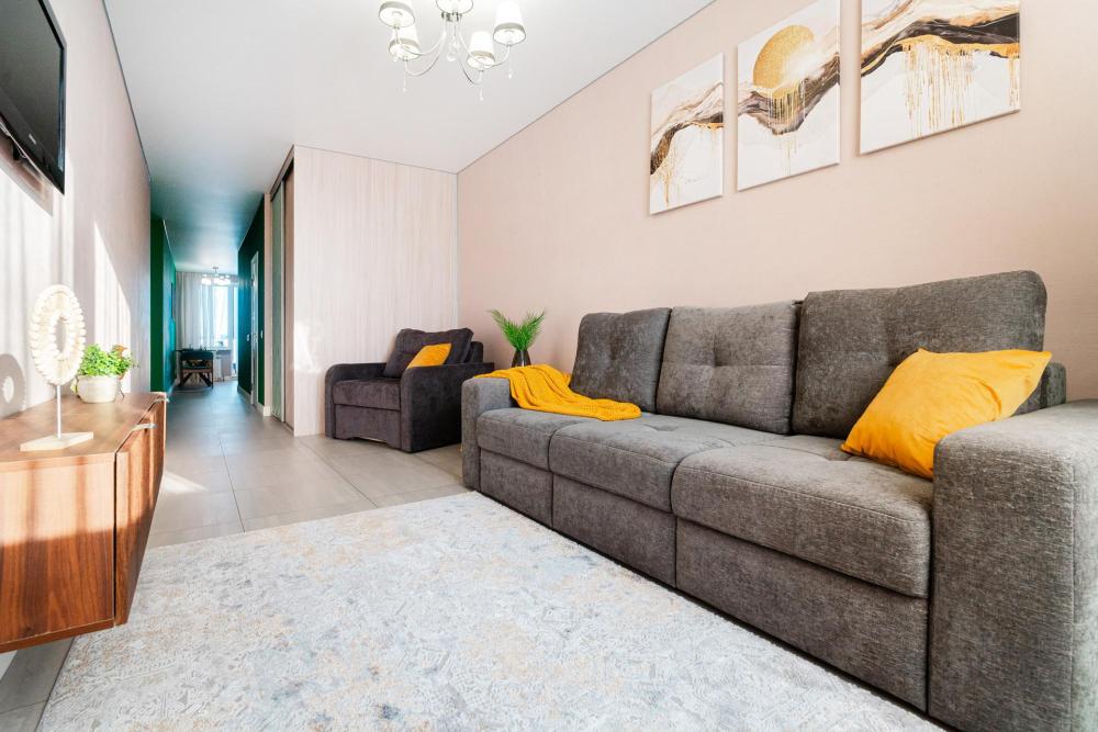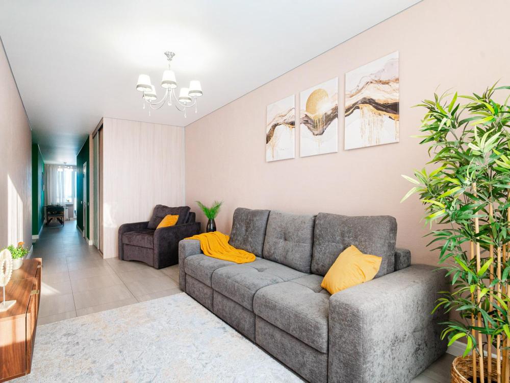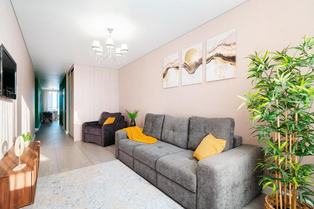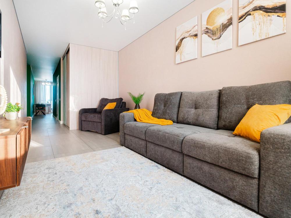 Двухомнатная квартира 46 м², 16 этаже (лифт). 2-спальных раскладной диван 160/190 + 1-спальное раскладное кресло 110/190. Свежее постельное белье и полотенца. Базовые одноразовые гигиенические средства. Бытовая техника: холодильник, бойлер, стиральная машинка, чайник, микроволновка, чайник, фен, утюг, гладильная доска, вентилятор. Современная кухня, полностью оснащенная посудой и кухонным инвентарем. Wi-Fi 100 Мбит/с и Smart-TV
