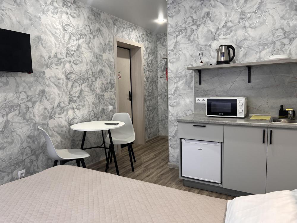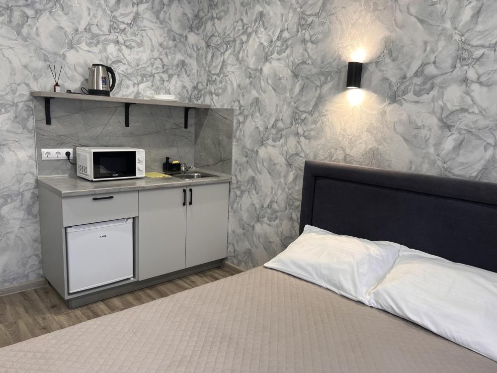 Номер категории «Стандарт» оснащен отдельным санузлом с душем, раковиной, унитазом. В номере есть кухонный блок, оснащенный чайником, микроволновкой, холодильником. Размещена одна стандартная двуспальная кровать с ортопедическим матрасом. Дополнительно можно разместить третьего гостя на современной раскладушке.