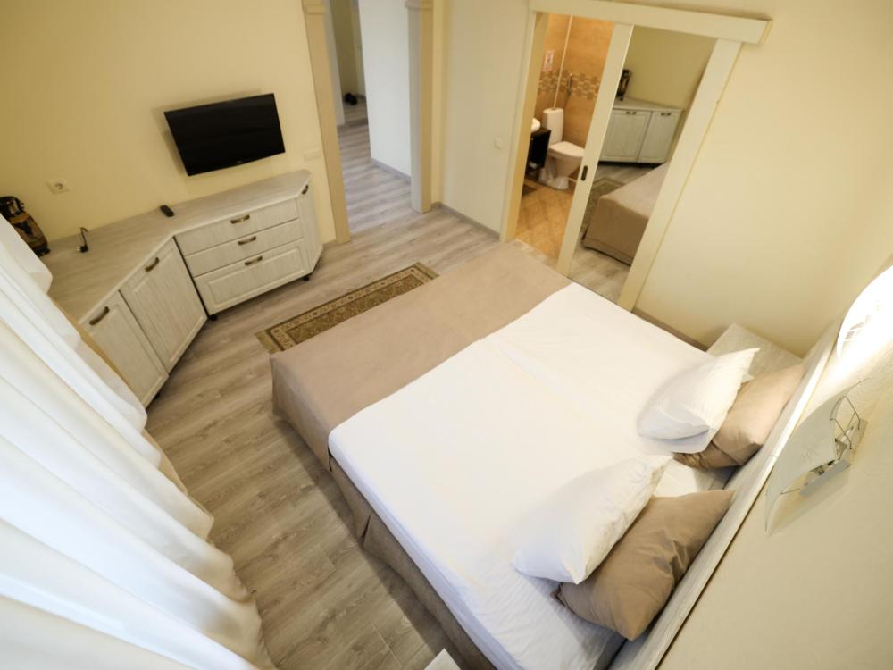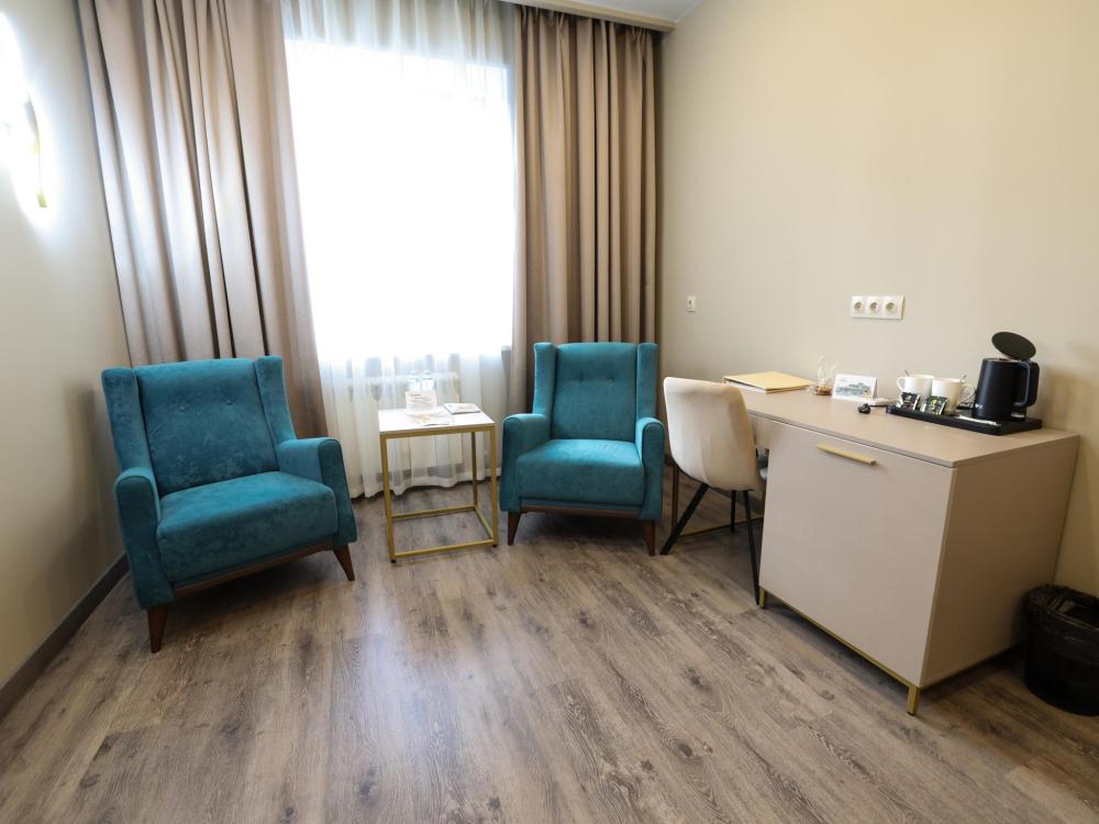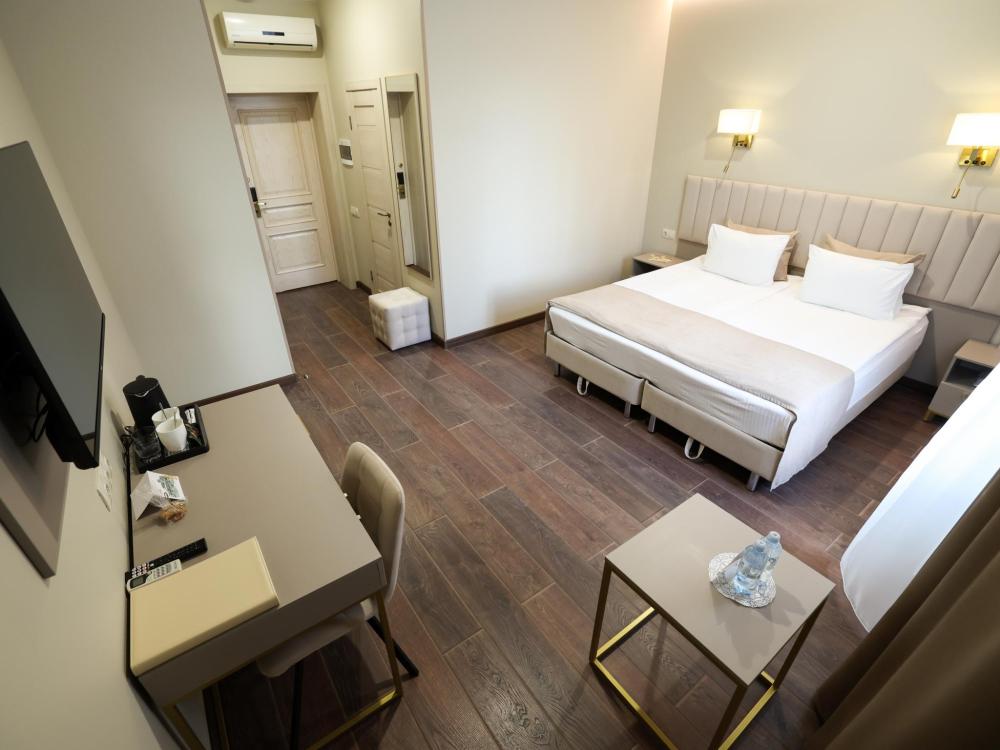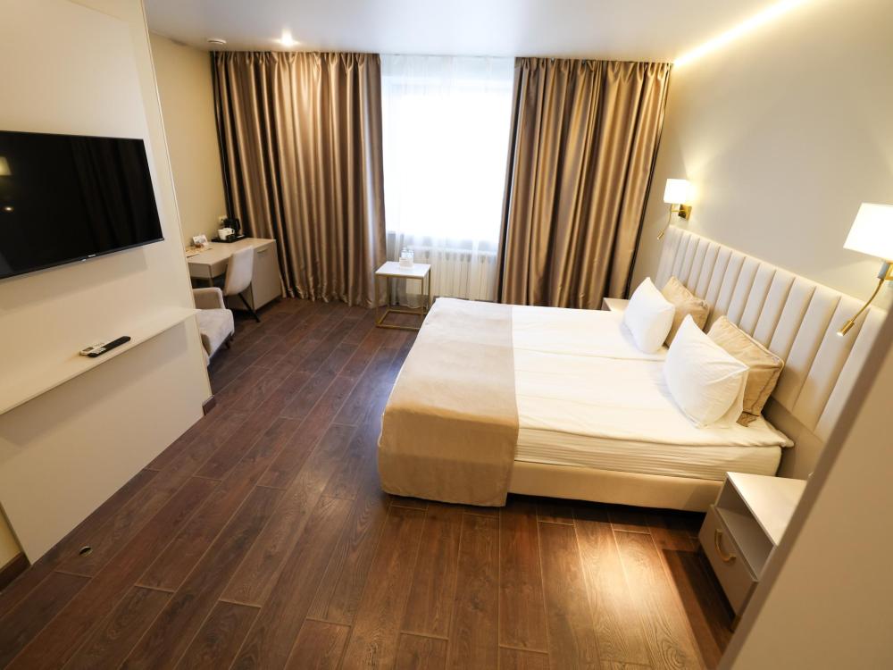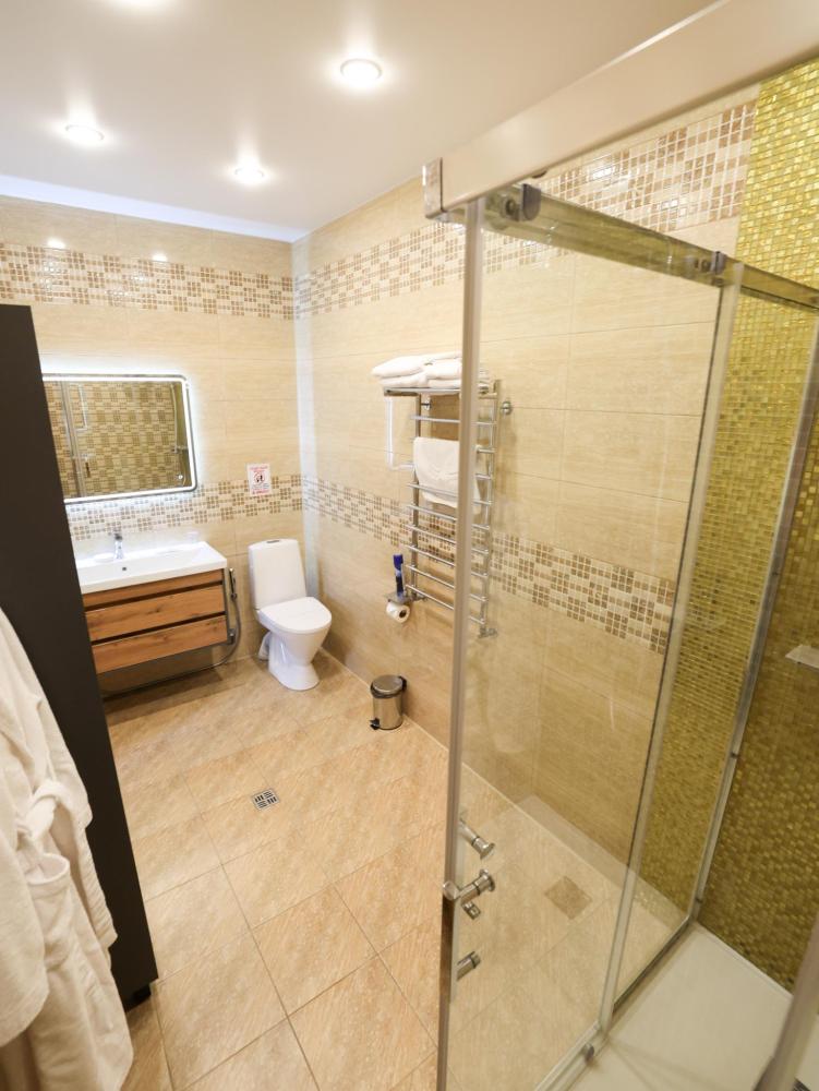 Кровать размера king size, рабочая зона, холодильник, кондиционер, ЖК-телевизор со спутниковыми каналами, беспроводной интернет, тапочки, халаты, ванная комната с душевой кабиной (оборудованная всем необходимым), бутилированная вода.