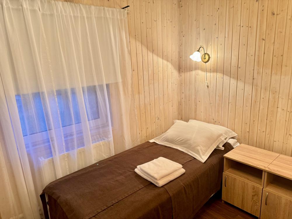 Двухэтажный дом с номерами. В номере 1 комната на 4 человека, чайник, телевизор, обогреватель С/у в другом здании - 3 минуты пешком Газовых и электрических плит - нет.