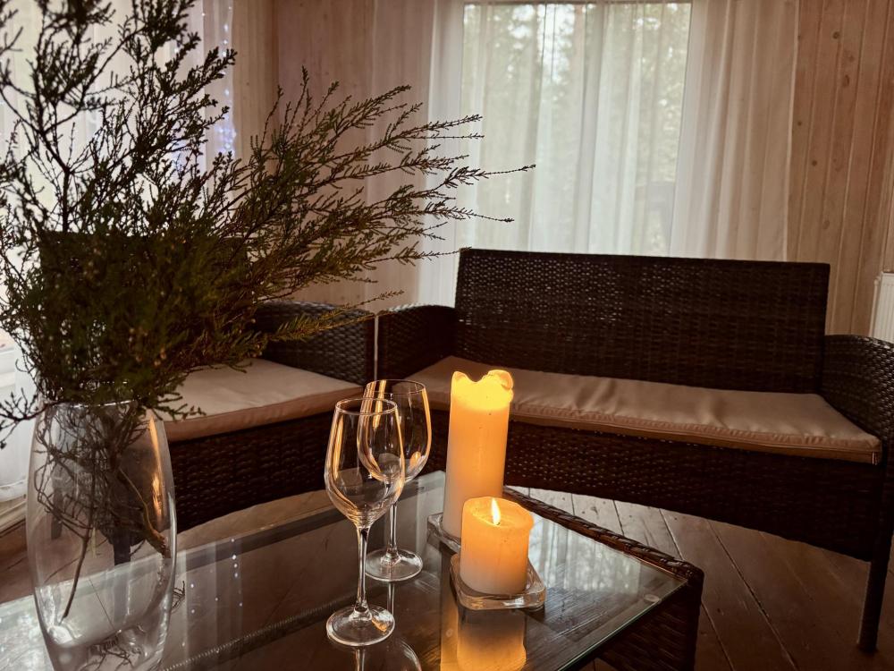 Одноэтажный дом с верандой. В доме 2 спальни, 1 с/у, сауна, мини - кухня, микроволновка, чайник, телевизор, холодильник, обогреватели. Высокоскоростной интернет - Wi-fi Газовых и электрических плит - нет.