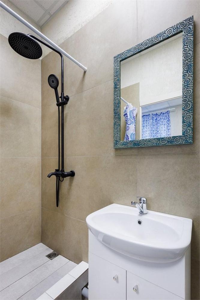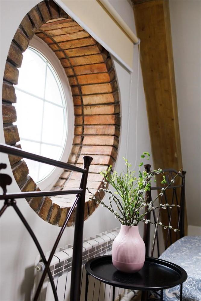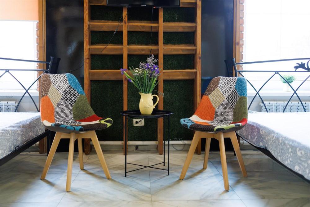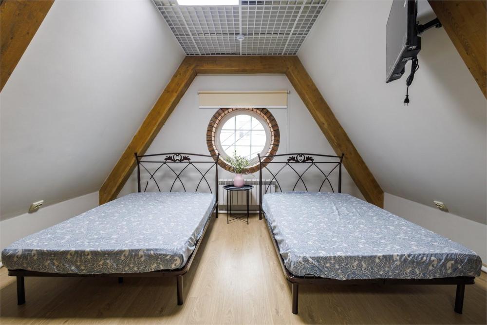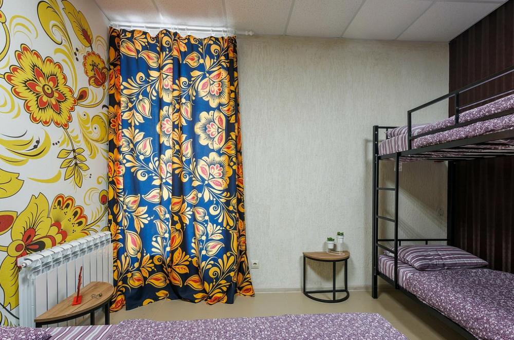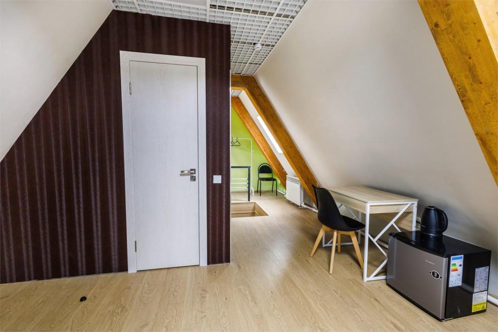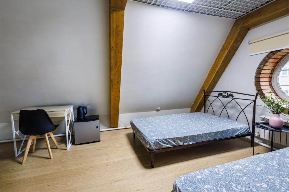 Просторный номер с тремя двуспальными кроватями, собственной душевой и санузлом. Номер оформлен в стиле лофт.