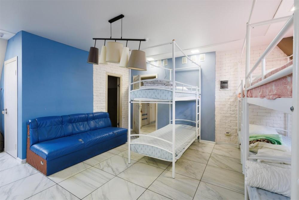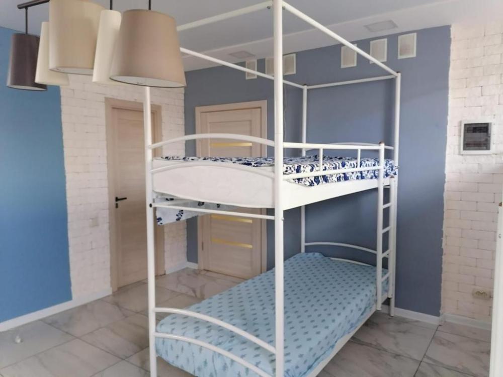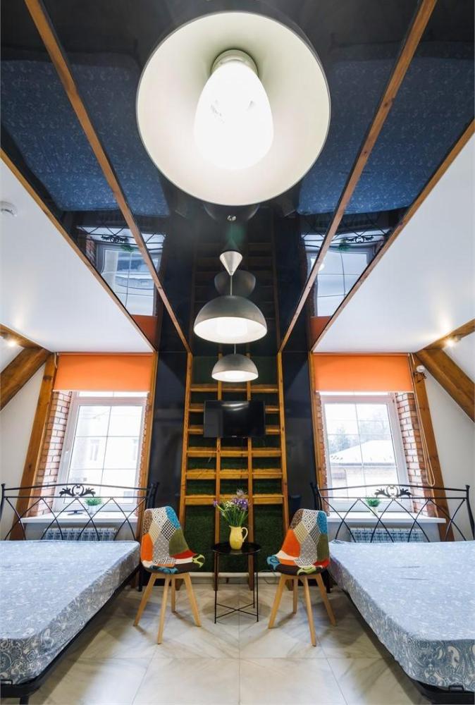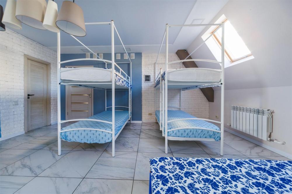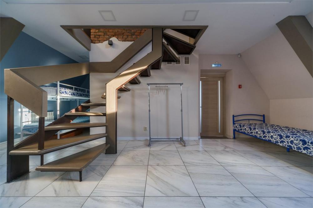 Двухуровневый номер по типу таунхаус: верхняя часть номера представляет из себя отдельный номер с 2мя двуспальными и двумя односпальными кроватями, витой лестницей соединяется со второй частью просторного номера, в котором есть мини кухня, душ, санузел и 4 двухъярусные кровати.