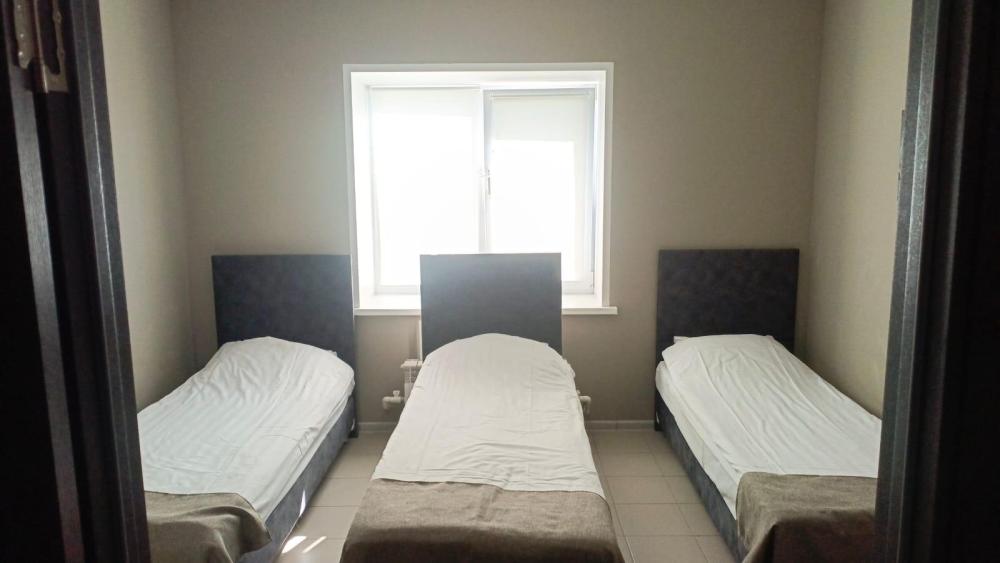 Трехместный номер с тремя одноместными кроватями и необходимой мебелью (стол, стул, настольная лампа, тумбочка для обуви, напольная и настенная вешалки для одежды, зеркало.) Душевая, санузел на этаже.