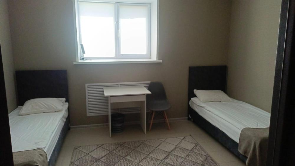 Двух номер с двумя одноместными кроватями и необходимой мебелью (стол, стул, настольная лампа, тумбочка для обуви, напольная и настенная вешалки для одежды, зеркало.) Душевая, санузел на этаже.