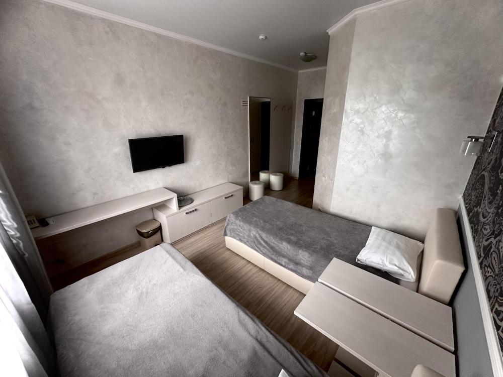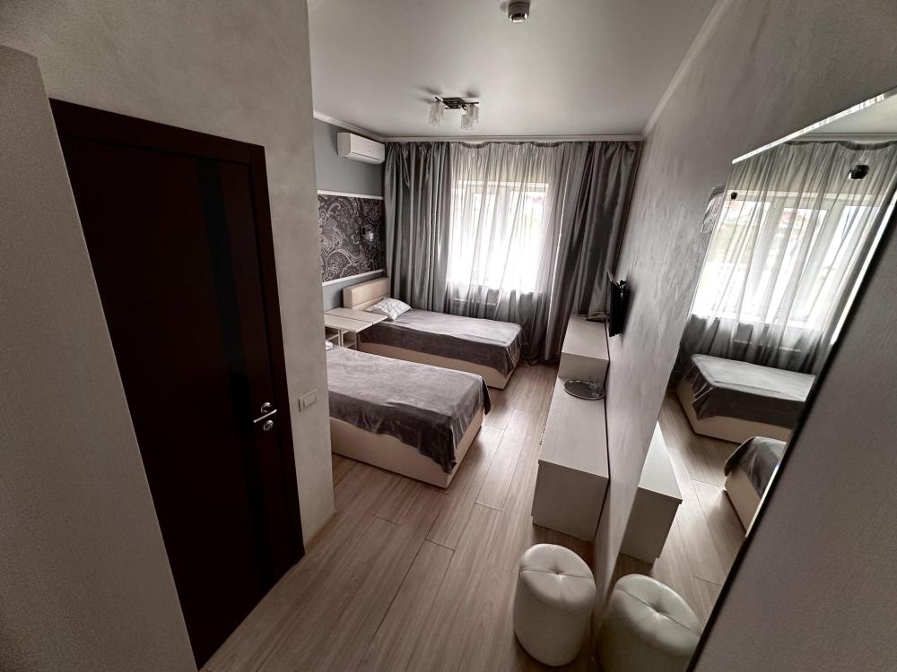 Номер стандарт с двумя односпальными кроватями 12 кв.м. Для гостей есть все необходимое для комфортного отдыха: телевизор,холодильник,кондиционер, удобства,предоставляются туалетно-комсметические принадлежности,полотенце.