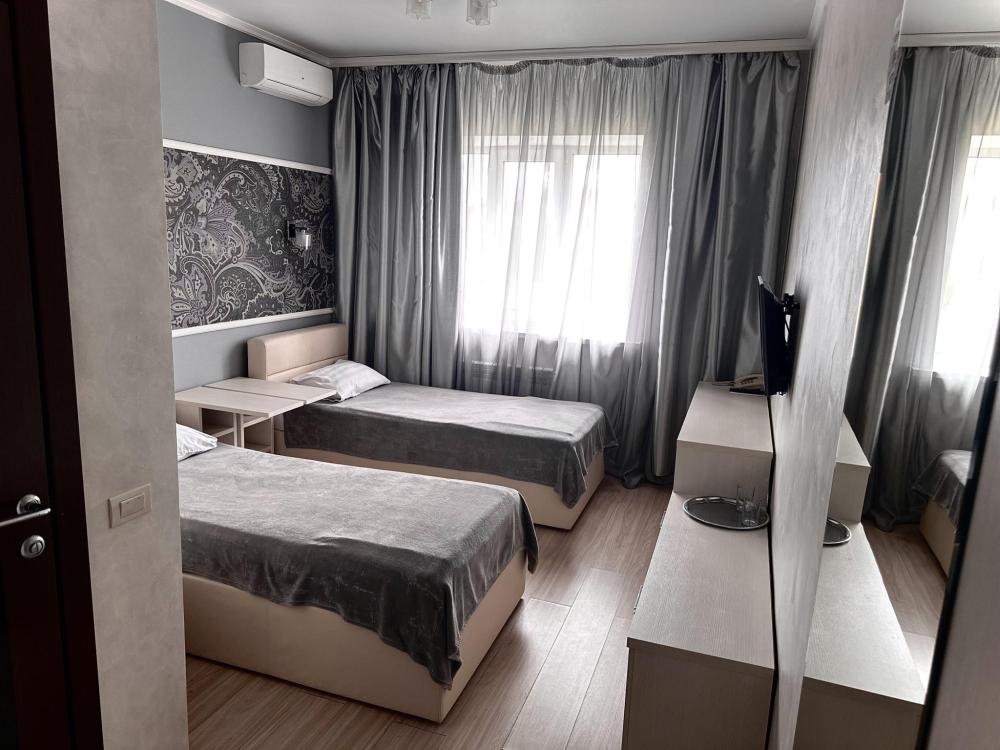 Уютный номер с двумя односпальными кроватями 14 кв.м. Для гостей есть все необходимое для комфортного отдыха: телевизор, холодильник, кондиционер, удобства, предоставляются туалетно-комсметические принадлежности, полотенце.