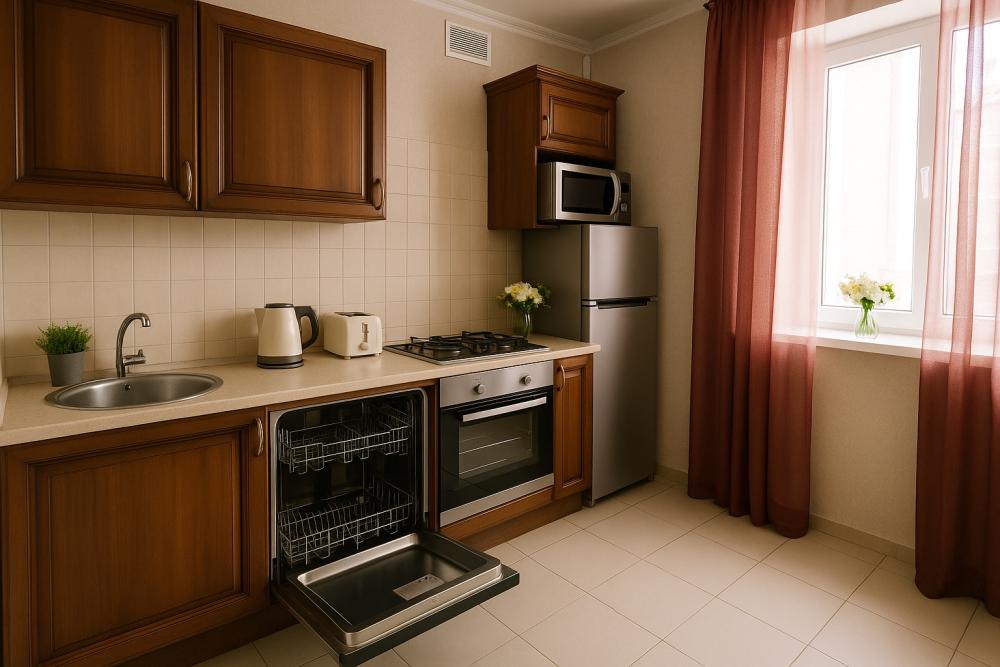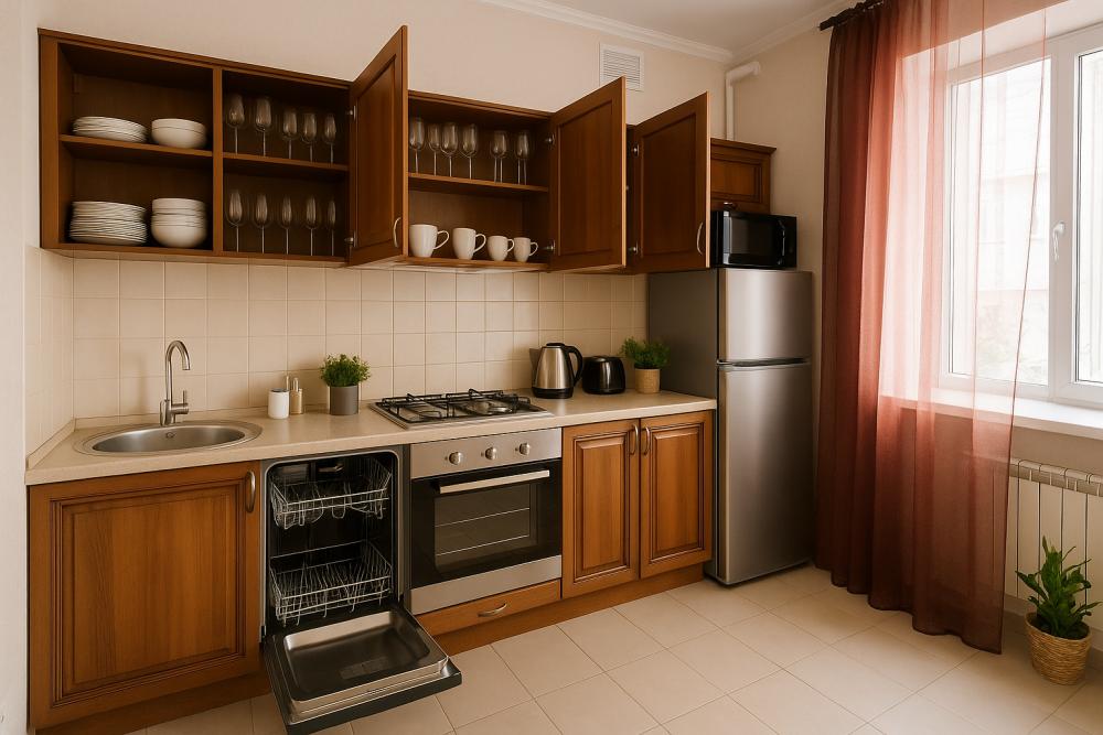 - Техника: Холодильник с морозильной камерой, плита с духовкой, микроволновка, электрочайник, тостер, мультиварка.