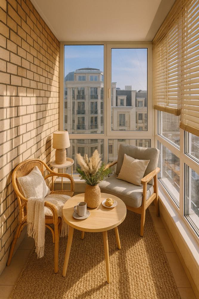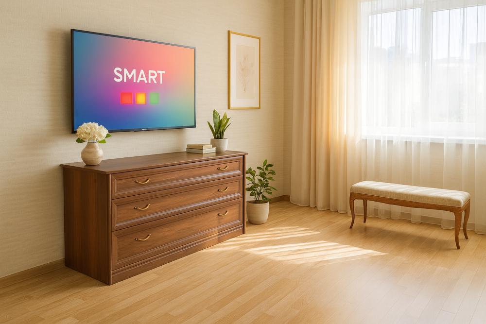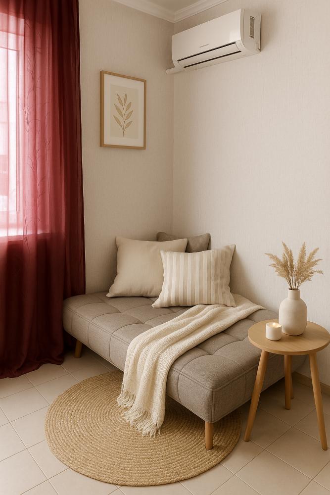 - Зона отдыха: Мягкий угловой диван с механизмом «еврокнига» (раскладывается в полноценное двуспальное место), два кресла-мешка, кофейный столик из массива дерева и 55-дюймовый Smart TV с Netflix и YouTube. Уют дополняют пледы, декоративные подушки и торшер с тёплым светом.