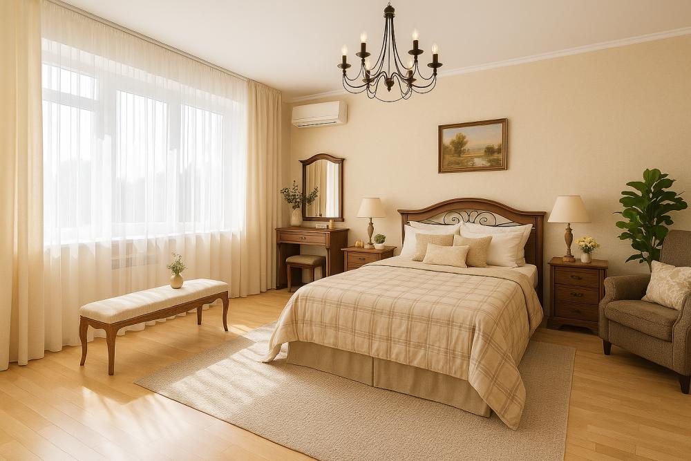 - Большая двуспальная кровать (180×200 см) с ортопедическим матрасом Premium класса и гипоаллергенным бельём из хлопка сатин.