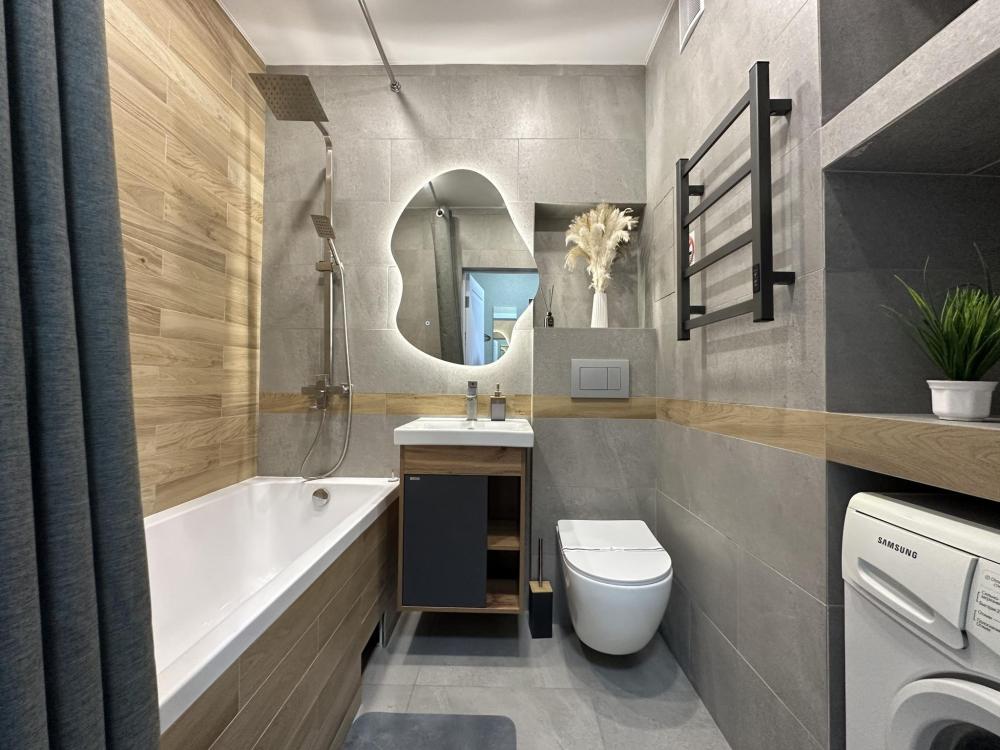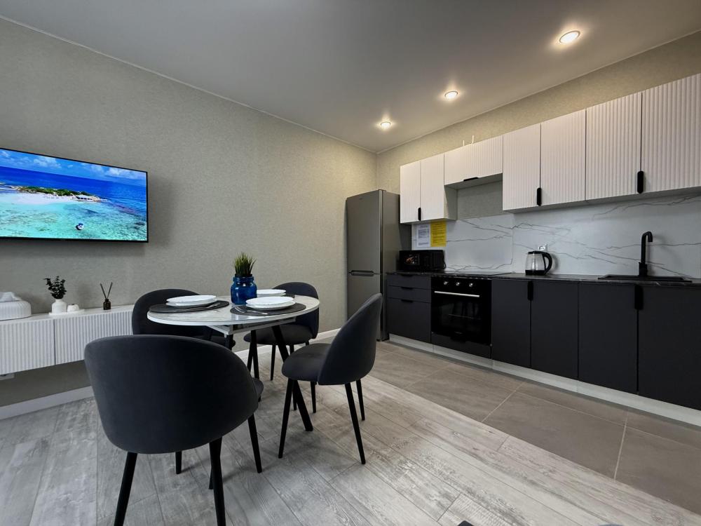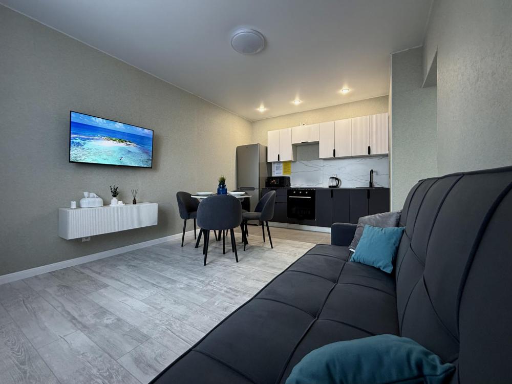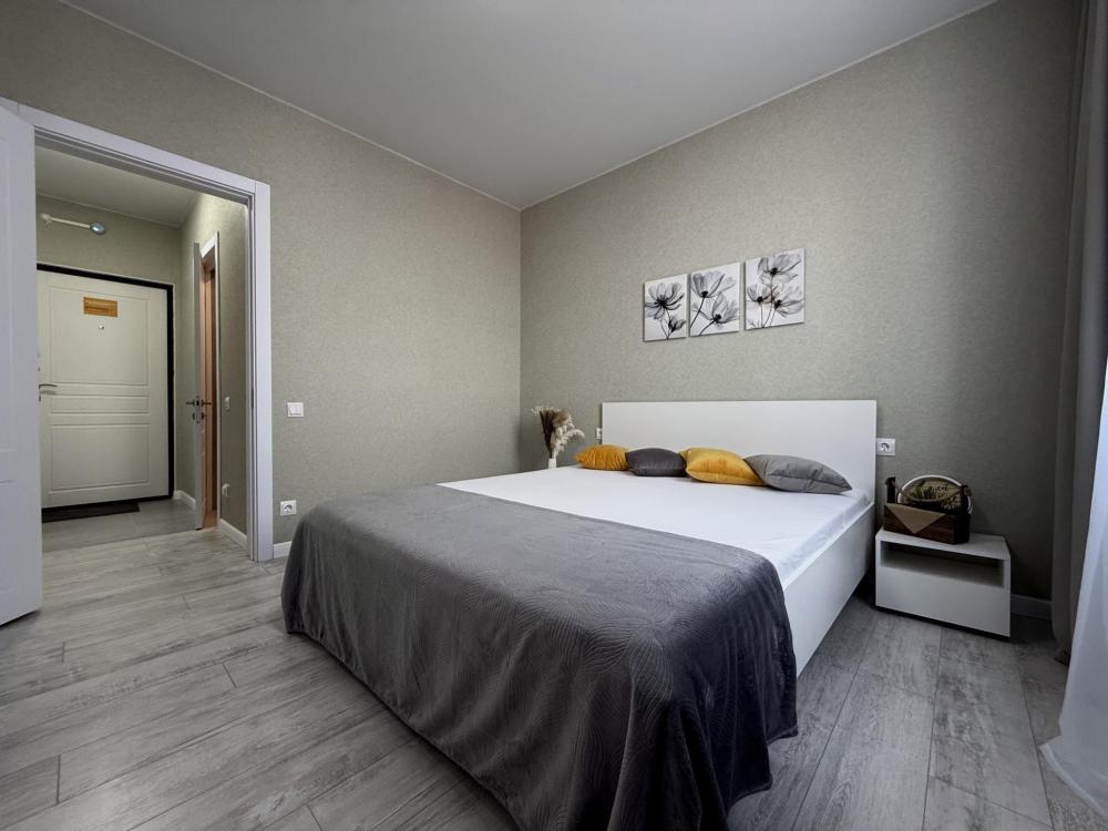 В КВАРТИРЕ ИМЕЮТСЯ: Кондиционер; ЖК-телевизор с подключенным кабельным ТВ; Комплект хлопкового постельного белья и полотенца; Бытовая техника (стиральная машинка, СВЧ-печь, холодильник, плита, чайник, утюг, фен); Средства для личной гигиены (шампунь, гель для душа, мыло); Посуда для приготовления пищи; Гладильная доска и сушилка. Цена зависит от количества проживающих, срока проживания, а также дня недели бронирования.
