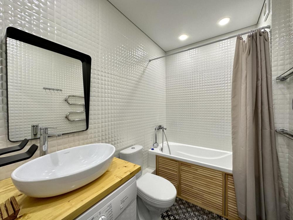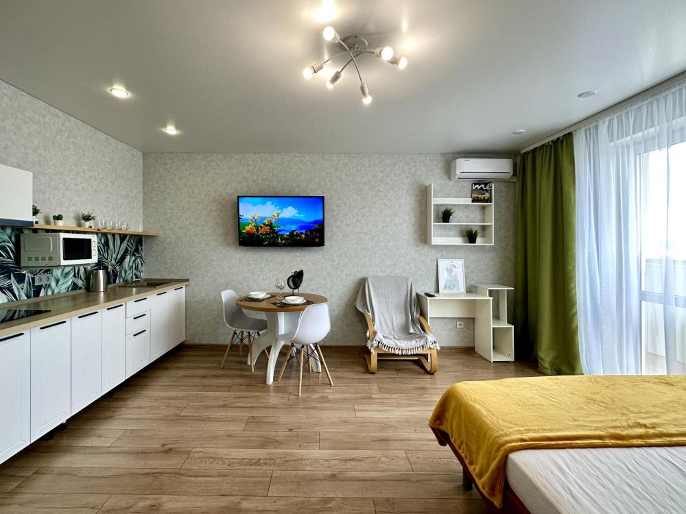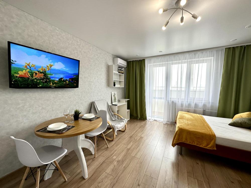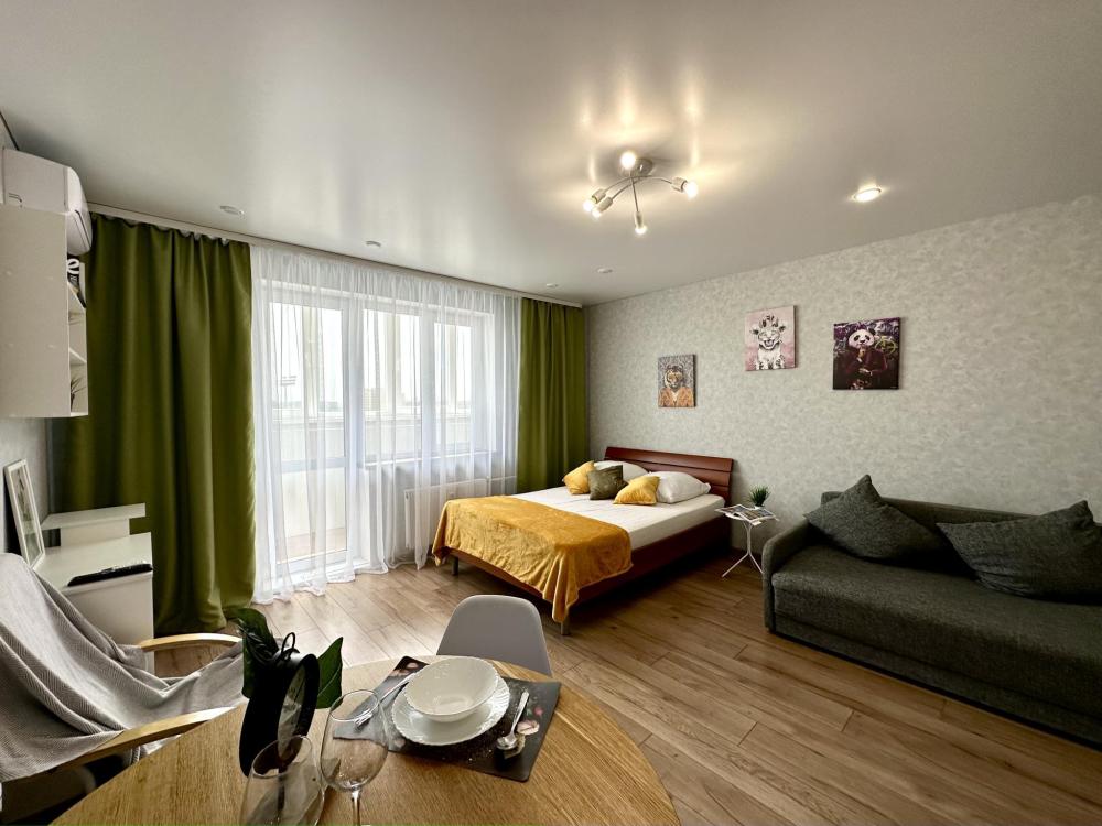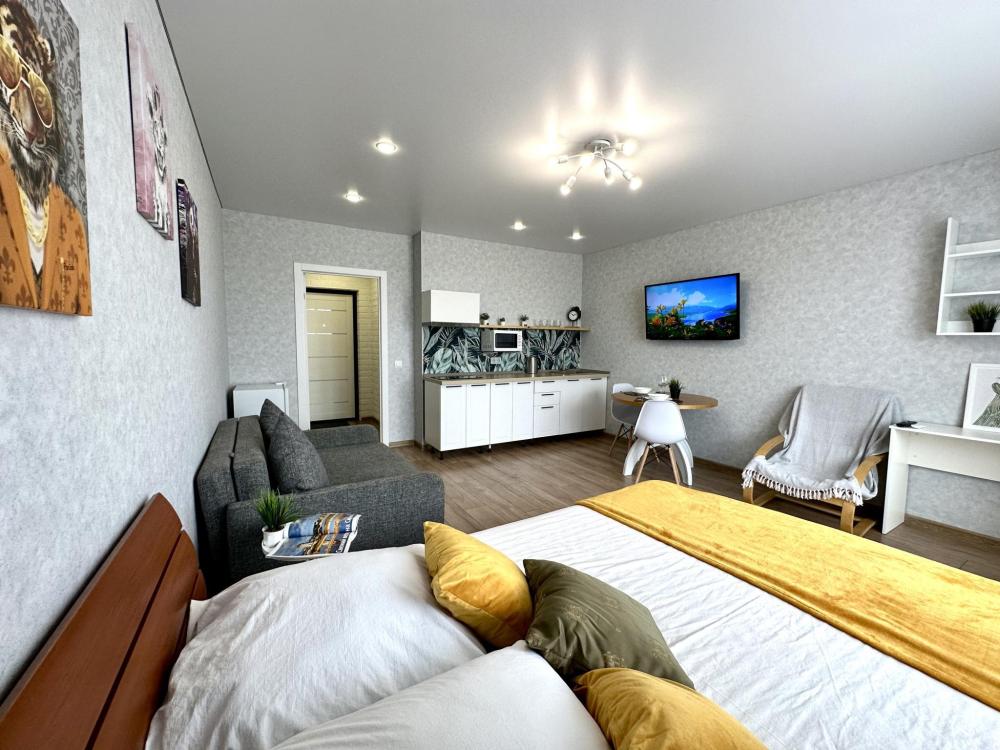 В КВАРТИРЕ ИМЕЮТСЯ: Кондиционер; ЖК-телевизор с подключенным кабельным ТВ; Комплект хлопкового постельного белья и полотенца; Бытовая техника (стиральная машинка, СВЧ-печь, холодильник, плита, чайник, утюг, фен); Средства для личной гигиены (шампунь, гель для душа, мыло); Посуда для приготовления пищи; Гладильная доска и сушилка. Цена зависит от количества проживающих, срока проживания, а также дня недели бронирования.
