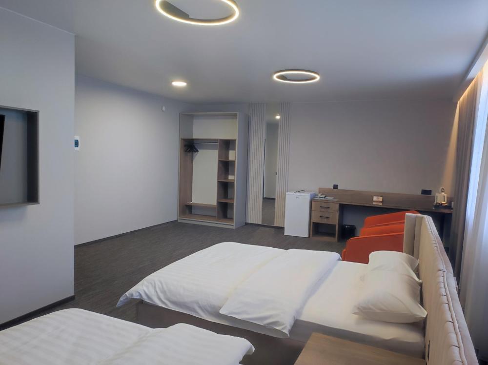 Интерьер двухкомнатных номеров категории "Люкс" А общей площадью 52 кв.м приглашает прикоснуться к современности. Стильная мебель, декоративные предметы интерьера создают неповторимую атмосферу для проживания. В спальной комнате - евро-кровать с роскошными постельными пренадлежностями.