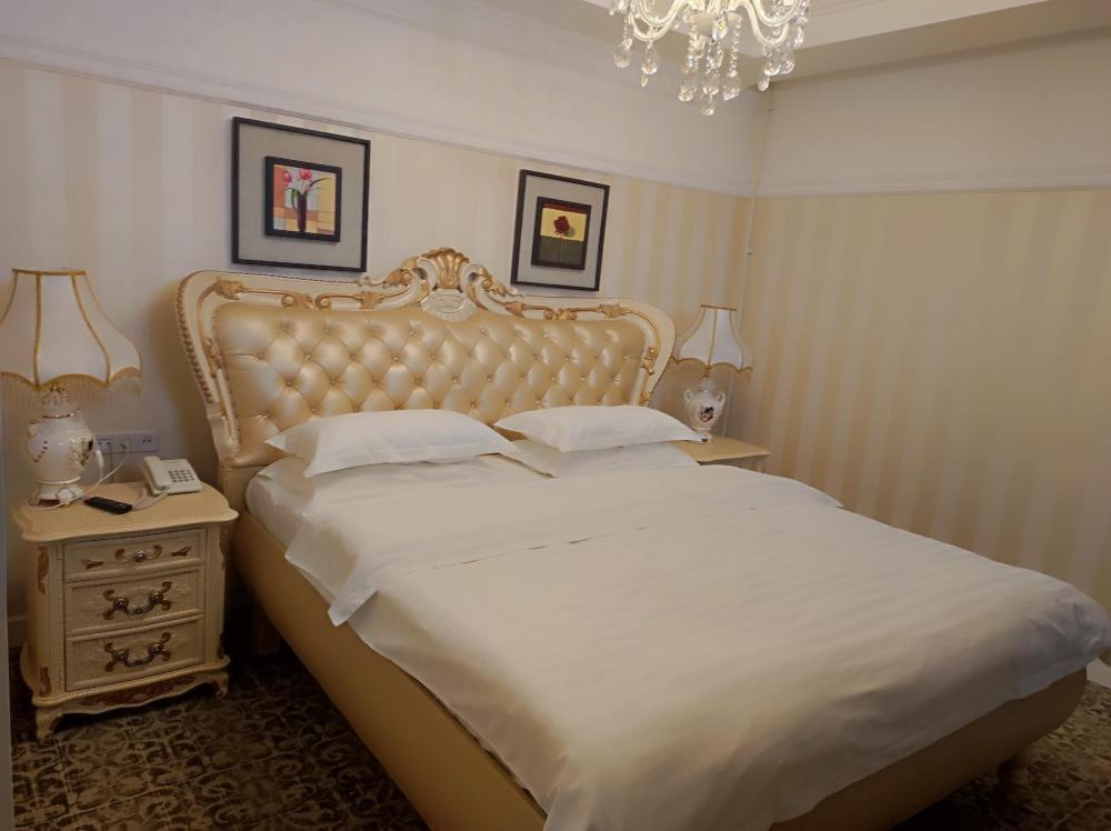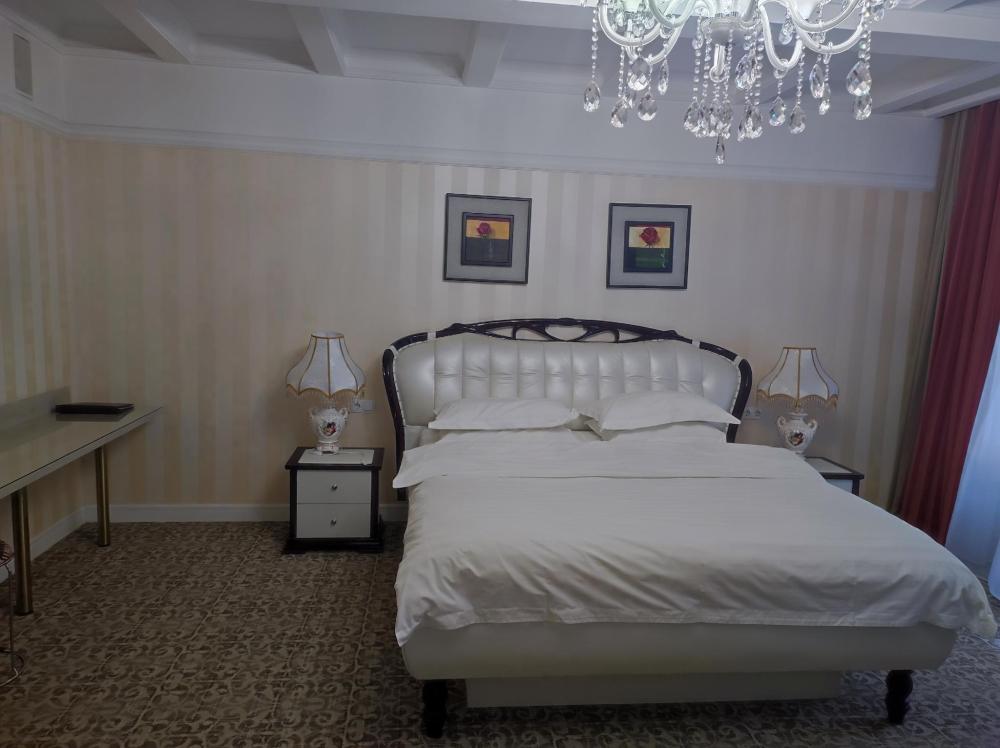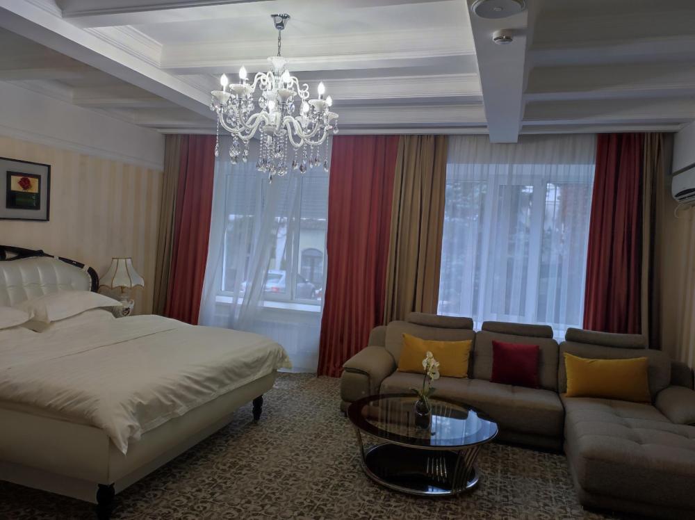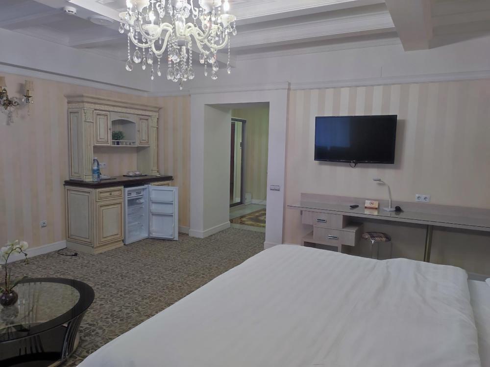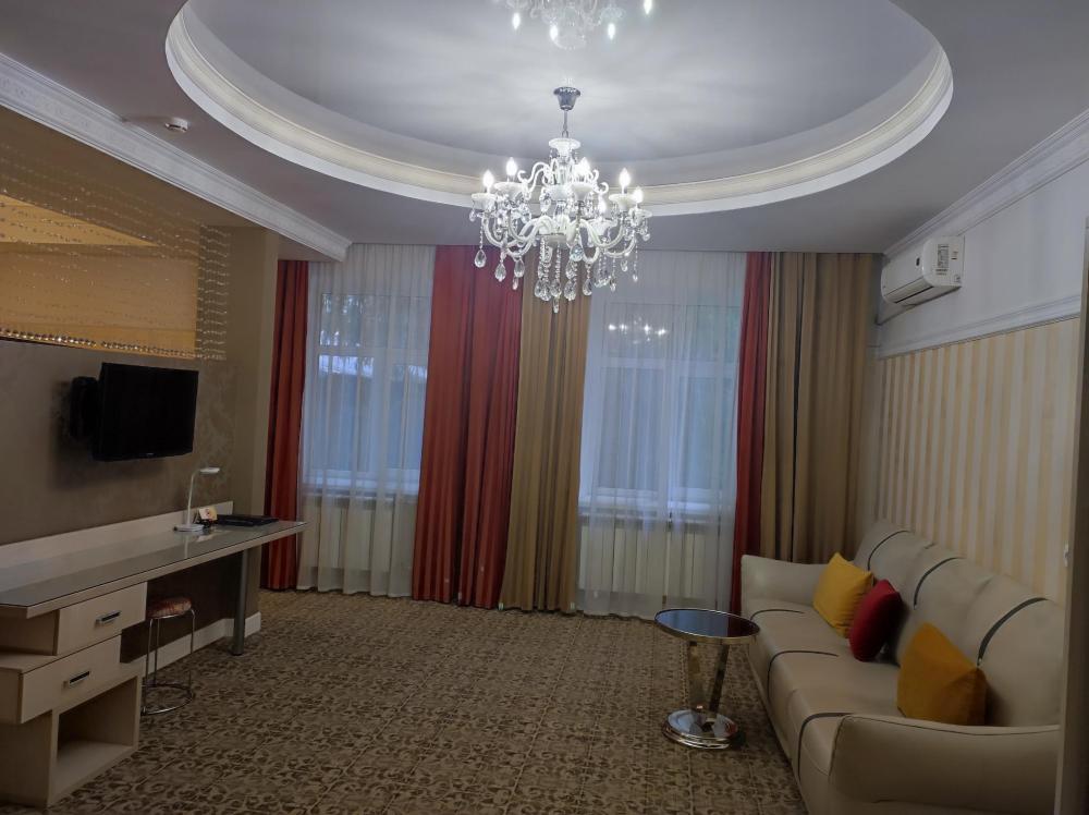 Номер "Президентский" общей площадью 54 кв.м. состоит из двух комнат. В номере имеется спальня с евро-кроватью, гостиная с рабочим столом, бесплатный доступ к интернету. Ванная комната оснащена душевой кабиной-джакузи. Круглосуточное обслуживание в номере, халат и тапочки, Wi-Fi, завтрак, 2 телевизора, фен, кондиционер, 2 телефона, холодильник, рабочее место, услуги прачечной.