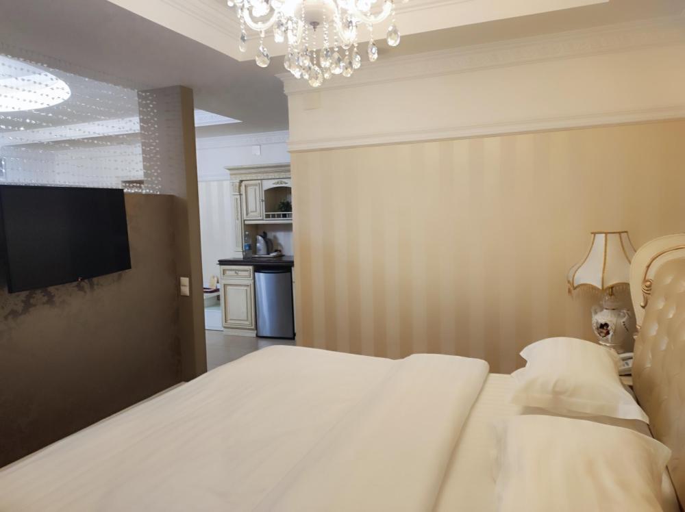 Номер «Апартаменты» общей площадью 95 кв. м., состоит из трех комнат, выполнен в классическом стиле, предлагает превосходный дизайн и безупречный комфорт. Круглосуточное обслуживание в номере, халат и тапочки, Wi-Fi, завтрак, 3 телевизора, фен, джакузи, услуги прачечной, камин, телефон, кондиционер.