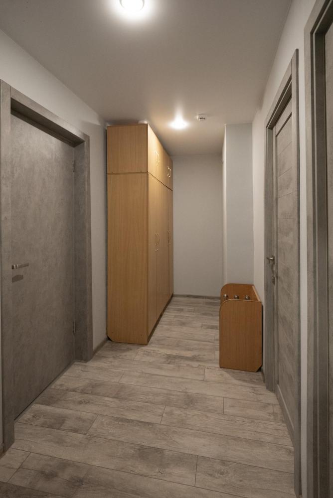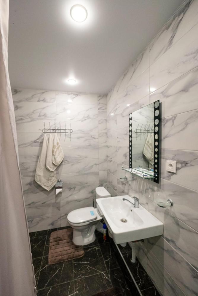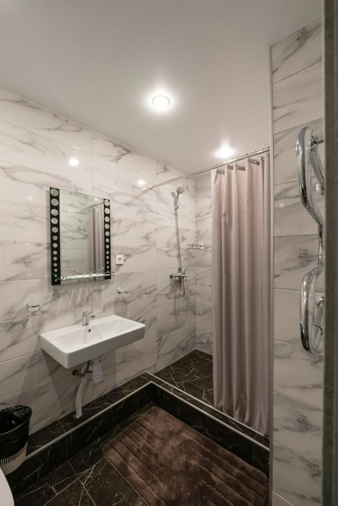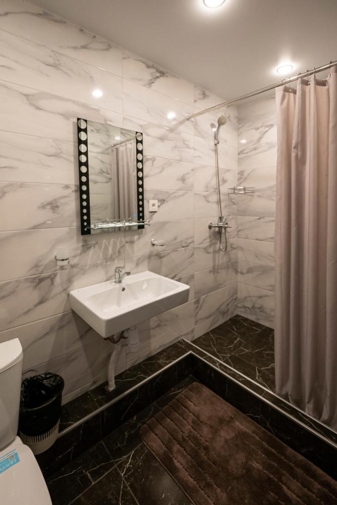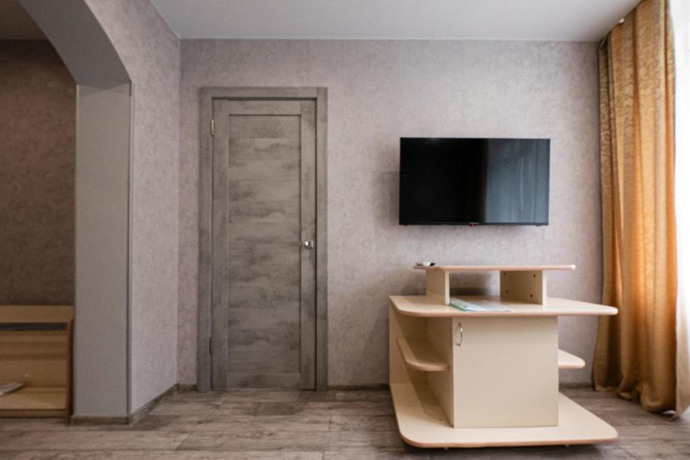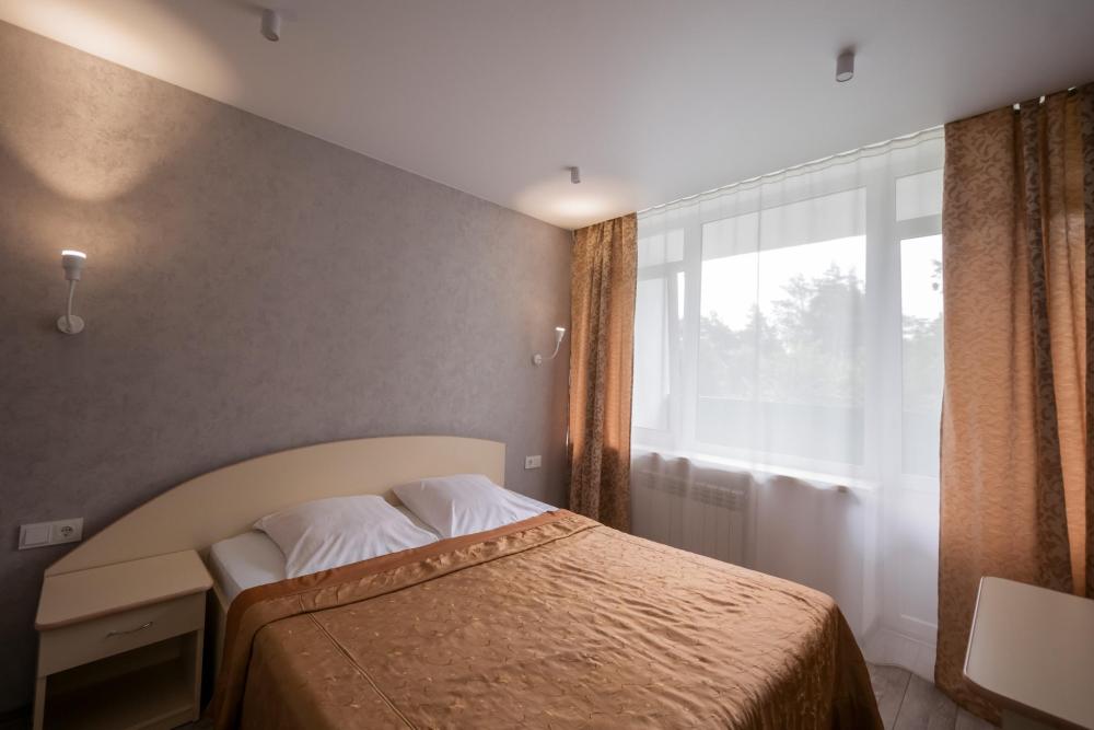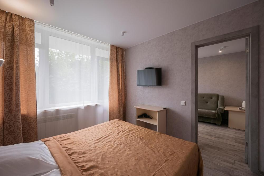 Номер высшей категории, состоящий из двух жилых комнат (комната для отдыха и спальня с двуспальной кроватью. В номере имеется телевизор, холодильник, чайник, столовые приборы, санузел, душевая кабина.