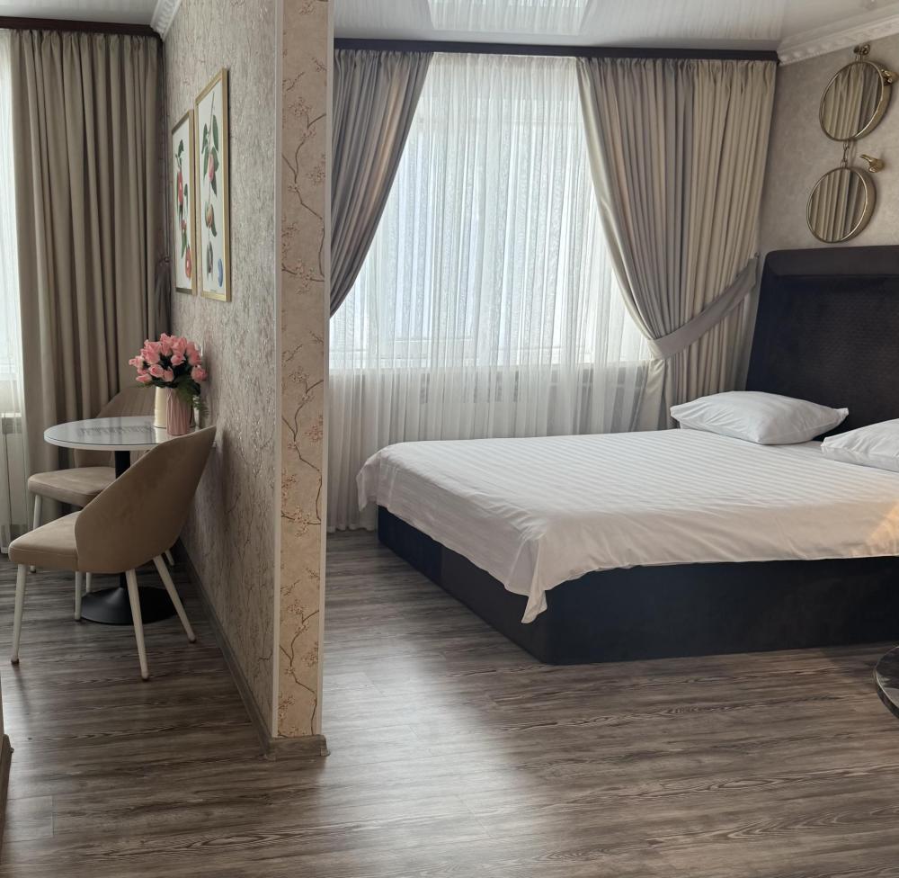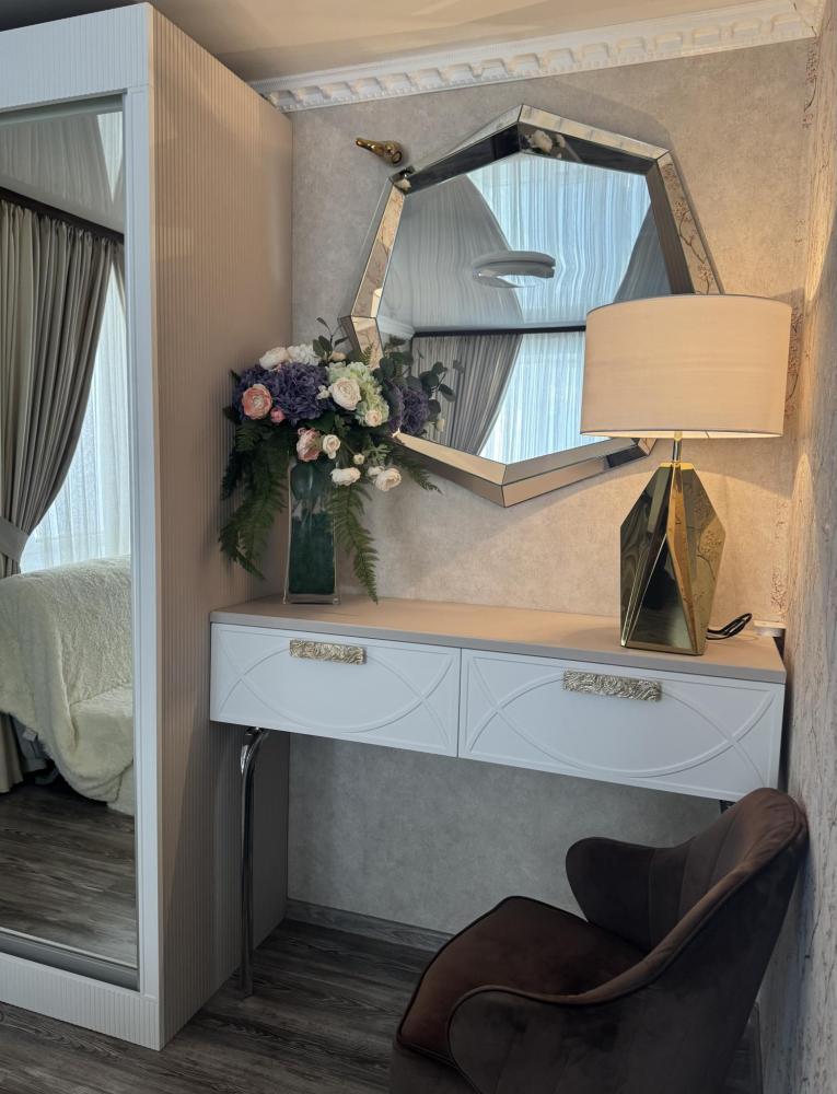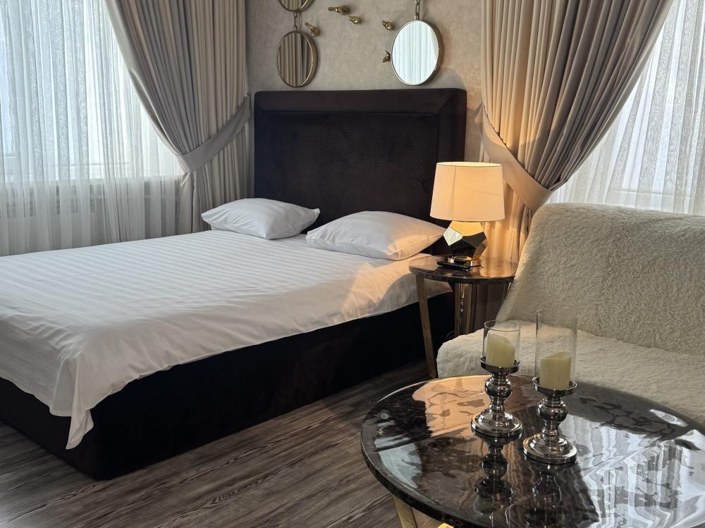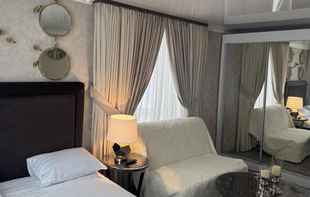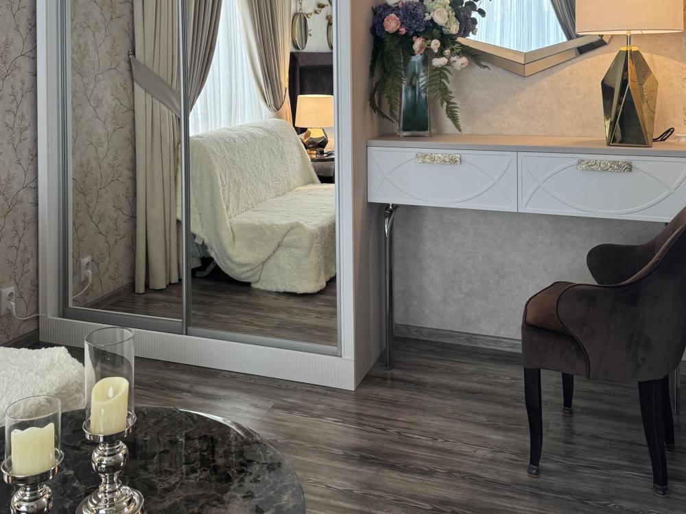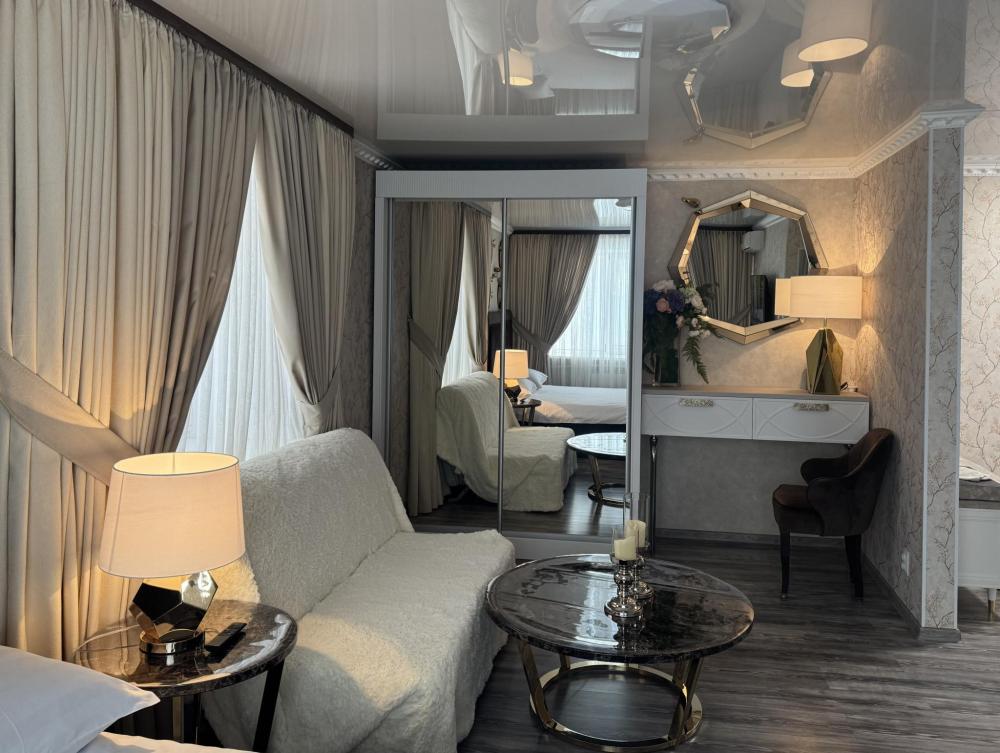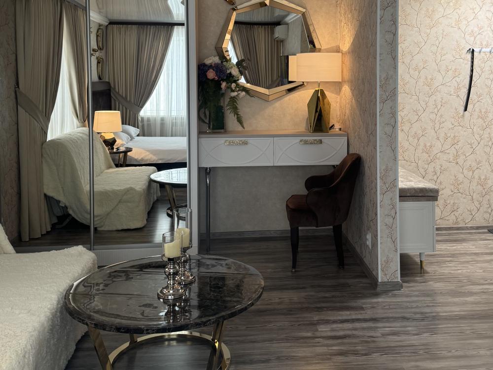 Апартаменты 2х комнатные двухместные, 4 этаж, 1 двухспальная кровать, 1 двухместный диван.В номере: кровать двухспальная , диван раскладной, мини кухня с посудой, чайник, плита, микроволновая печь, холодильник, кондиционер, шкаф для одежды, утюг,гладильная доска, сушилка, плечики журнальный стол, письменный стол, ванна и банные принадлежности, стиральная машина, фен, водонагреватель, полотенца, вай фай. Современный интерьер!