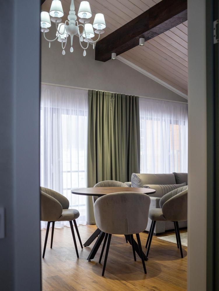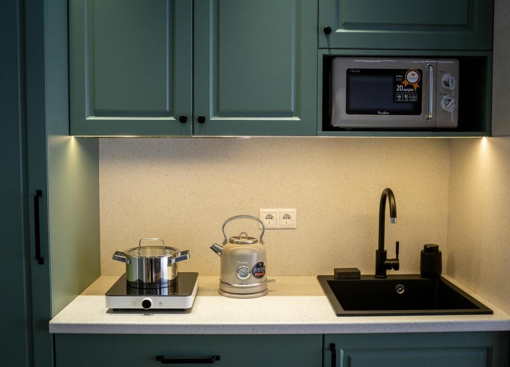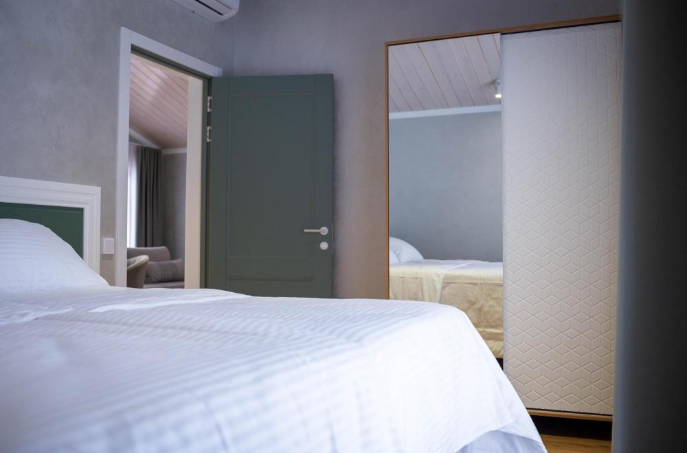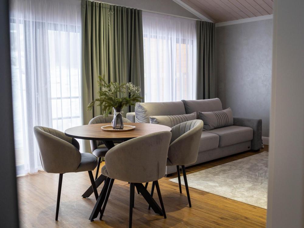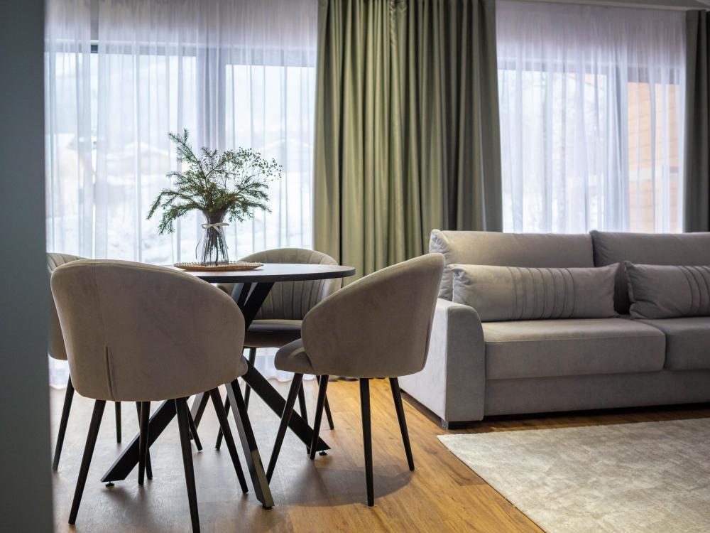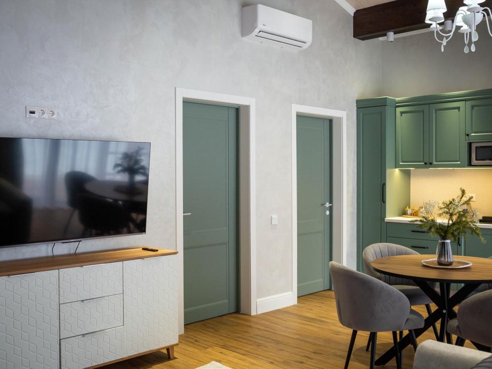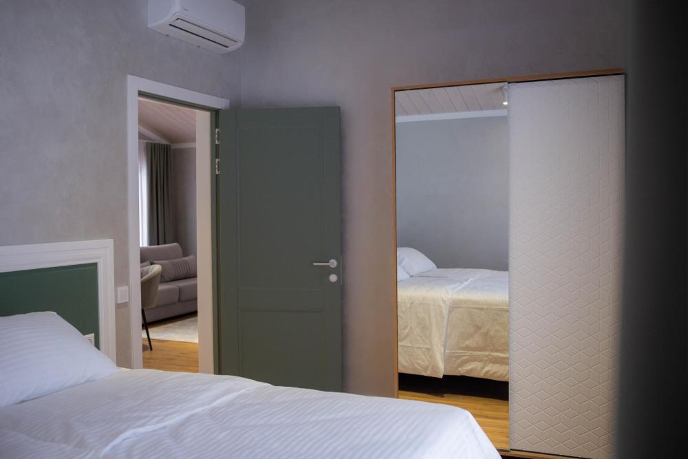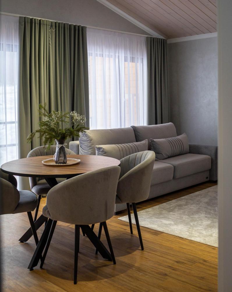 Оборудованная всем необходимым кухня-гостиная: рабочий стол, телевизор 52", диван, кухонный гарнитур, обеденный сервиз на 6 персон, индукционная плита, вместительный холодильник, микроволновая печь, чайник, капельная кофемашина, Алиса. Две спальных комнаты в каждой спальне 2 односпальные кровати (при необходимости, объединяются в большую двуспальную): шкаф купе, прикроватные тумбы, гладильная станция, банные халаты. Ванная комната: остекленная душевая кабина, комплект полотенец, набор косметики для душа, фен, одноразовые тапочки.
