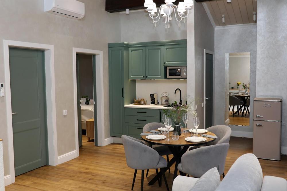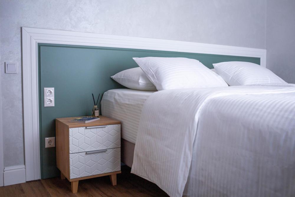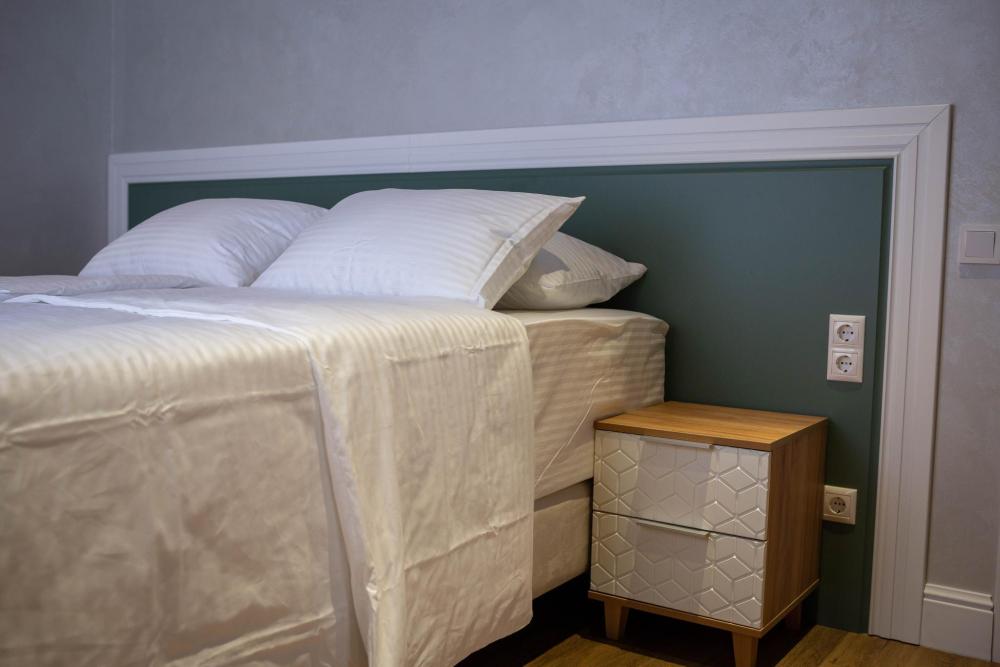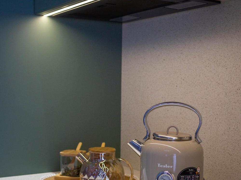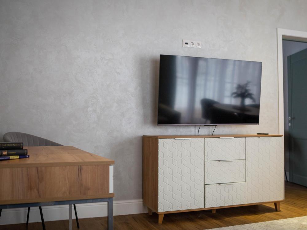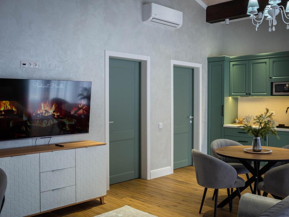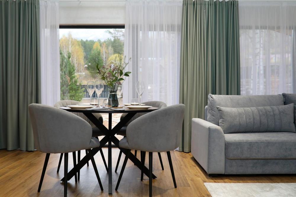 Оборудованная всем необходимым кухня-гостиная: рабочий стол, телевизор 52", диван, кухонный гарнитур, обеденный сервиз на 6 персон, индукционная плита, вместительный холодильник, микроволновая печь, чайник, капельная кофемашина, Алиса. Две спальных комнаты в каждой спальне 2 односпальные кровати (при необходимости, объединяются в большую двуспальную): шкаф купе, прикроватные тумбы, гладильная станция, банные халаты. Ванная комната: остекленная душевая кабина, комплект полотенец, набор косметики для душа, фен, одноразовые тапочки.