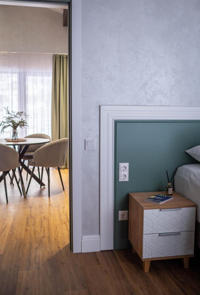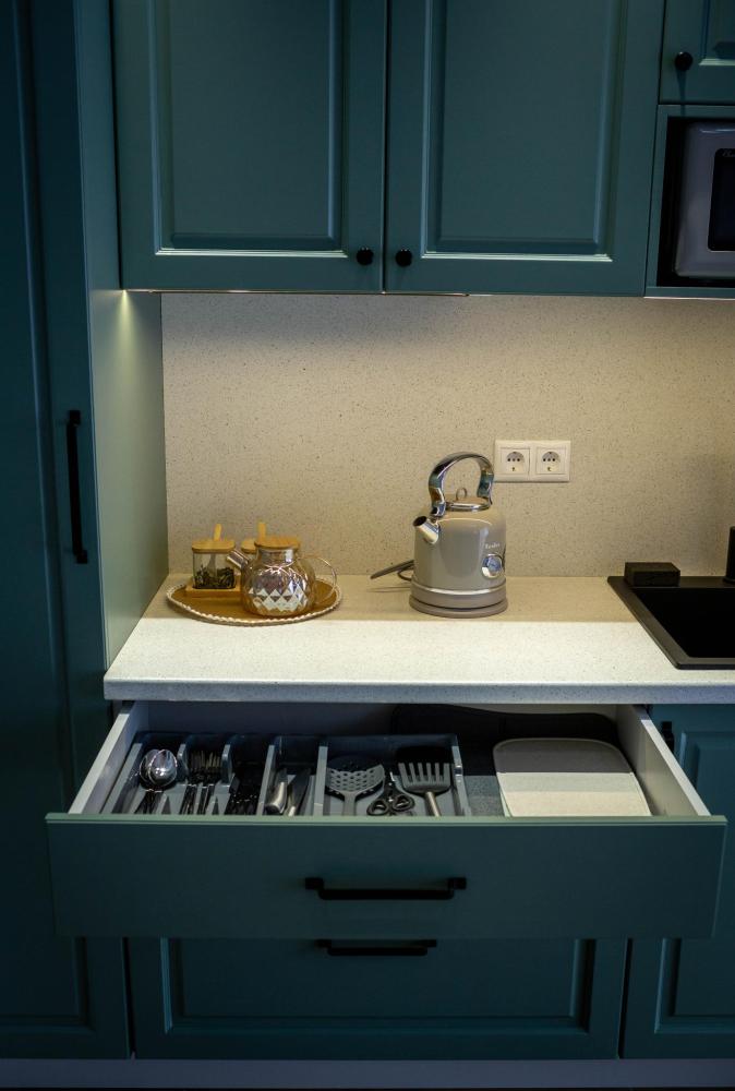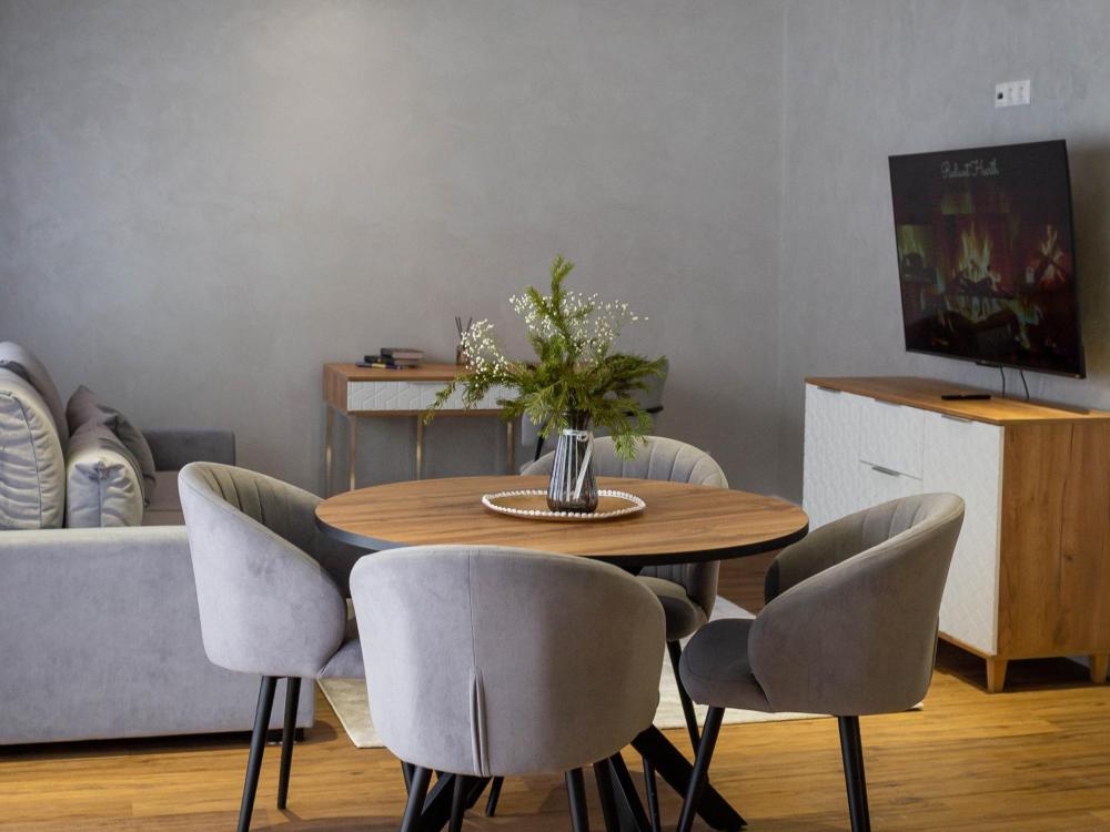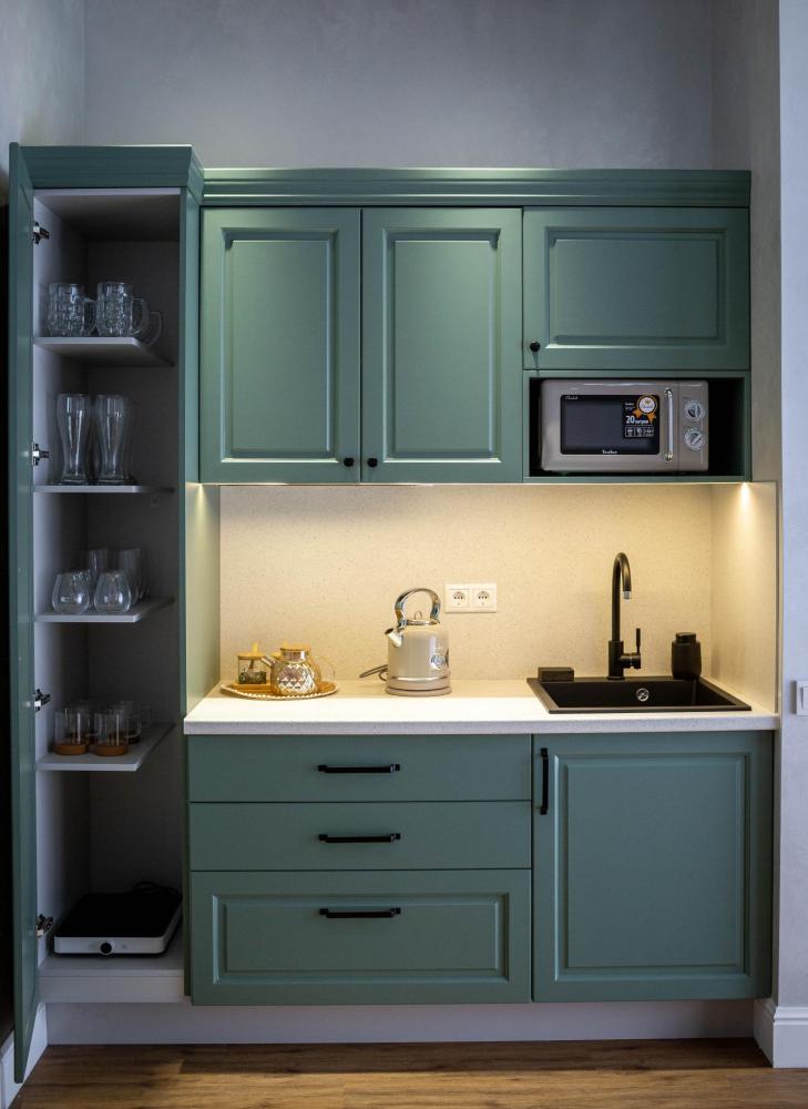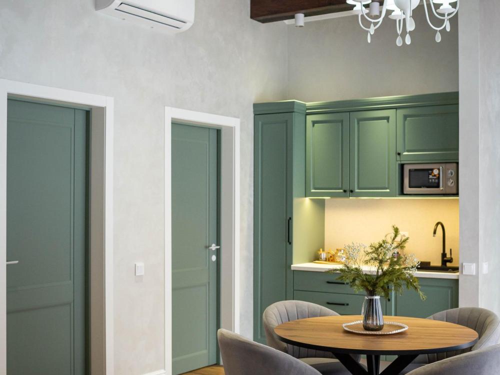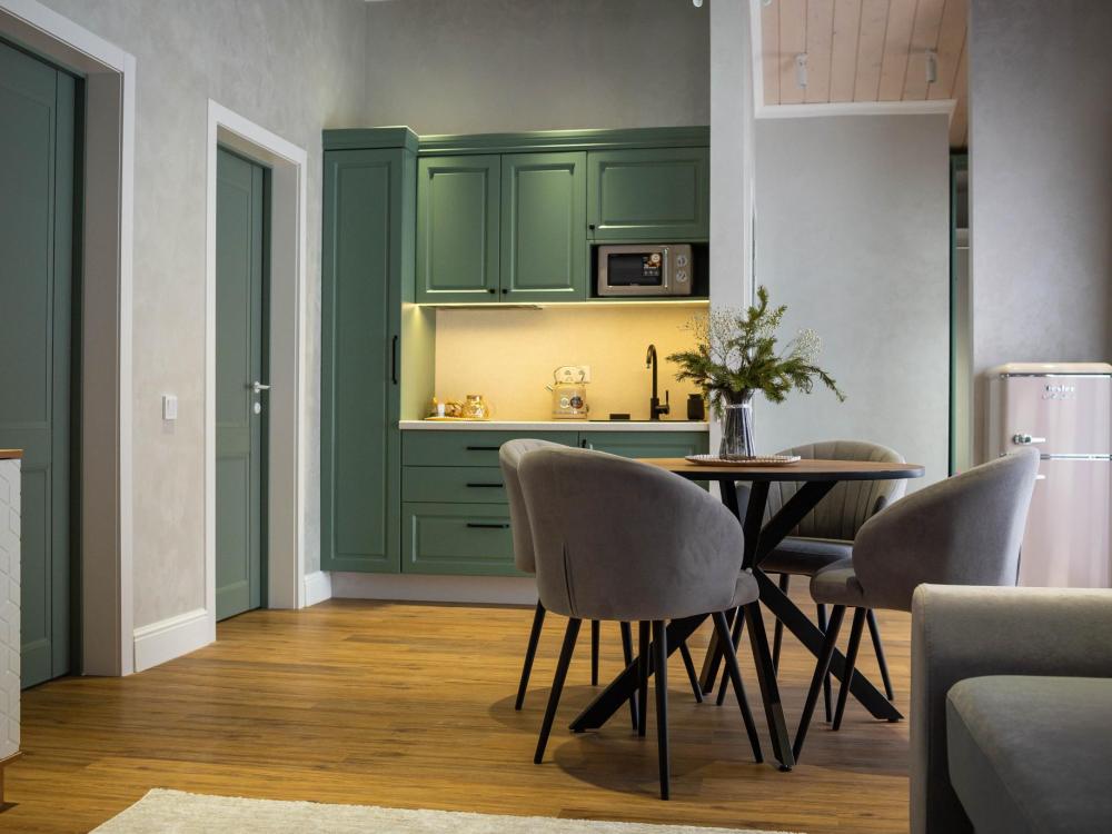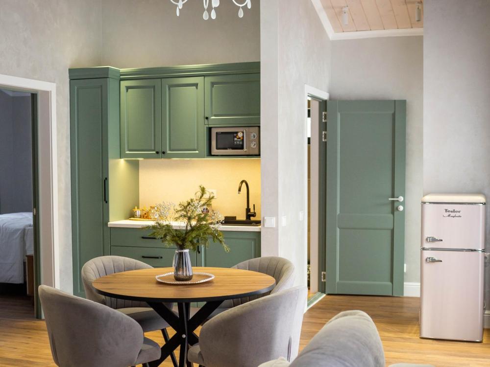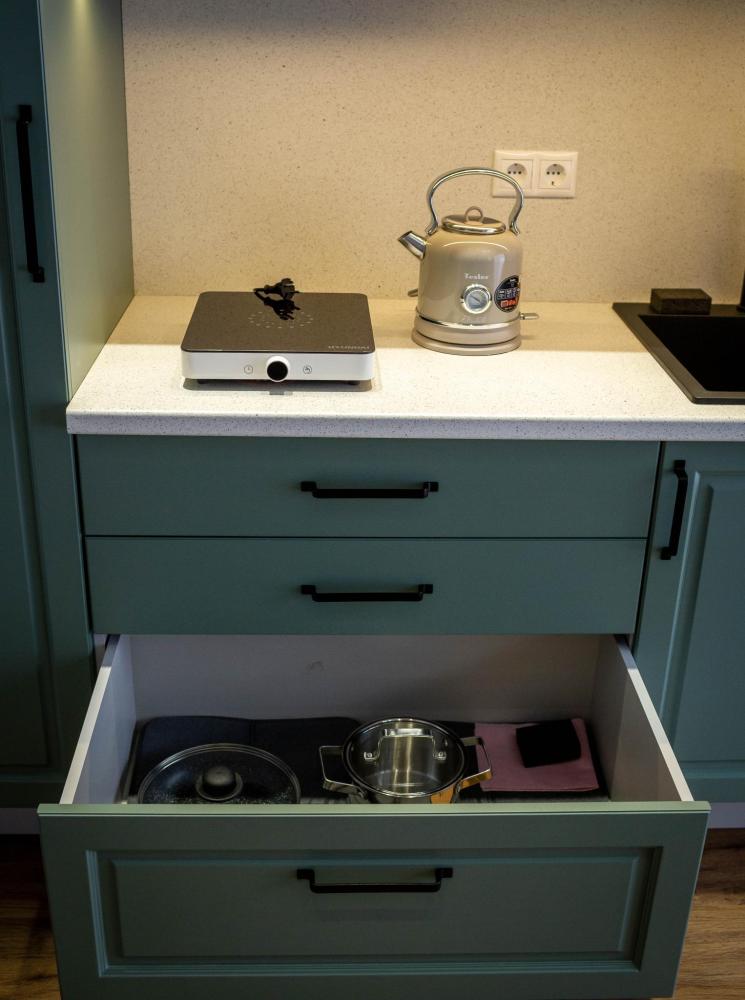 Оборудованная всем необходимым кухня-гостиная: рабочий стол, телевизор 52", диван, кухонный гарнитур, обеденный сервиз на 6 персон, индукционная плита, вместительный холодильник, микроволновая печь, чайник, капельная кофемашина, Алиса. Две спальных комнаты в каждой спальне 2 односпальные кровати (при необходимости, объединяются в большую двуспальную): шкаф купе, прикроватные тумбы, гладильная станция, банные халаты. Ванная комната: остекленная душевая кабина, комплект полотенец, набор косметики для душа, фен, одноразовые тапочки.