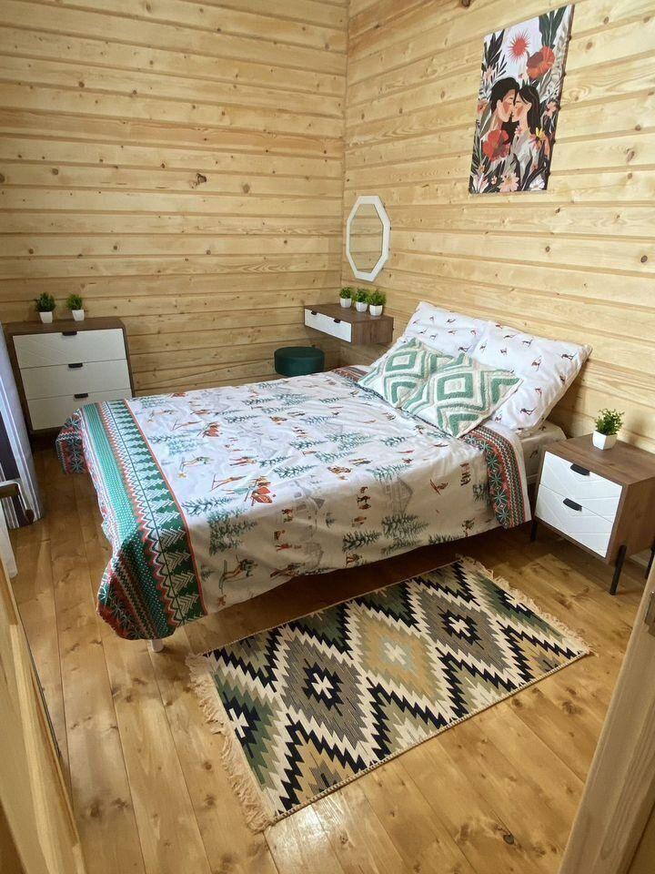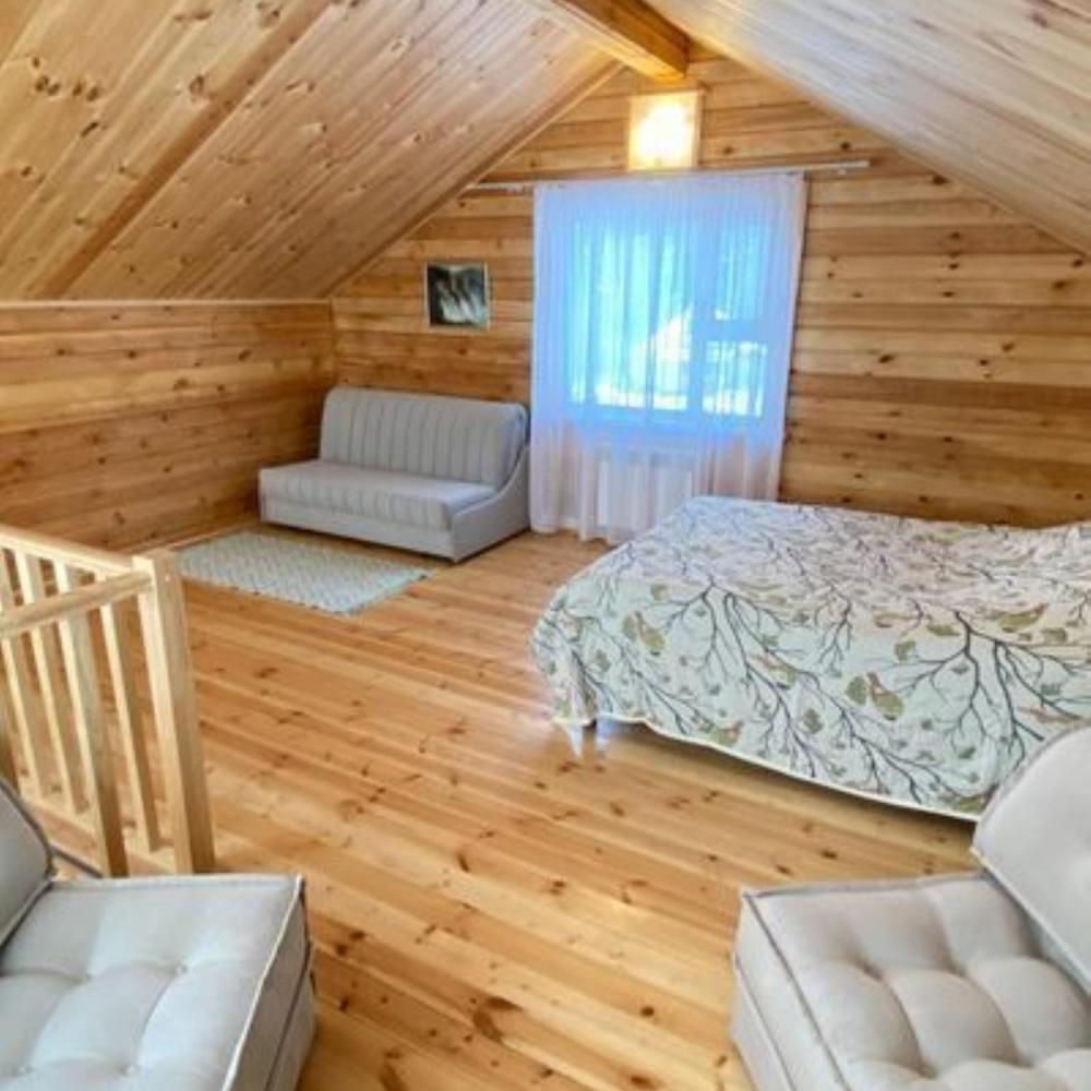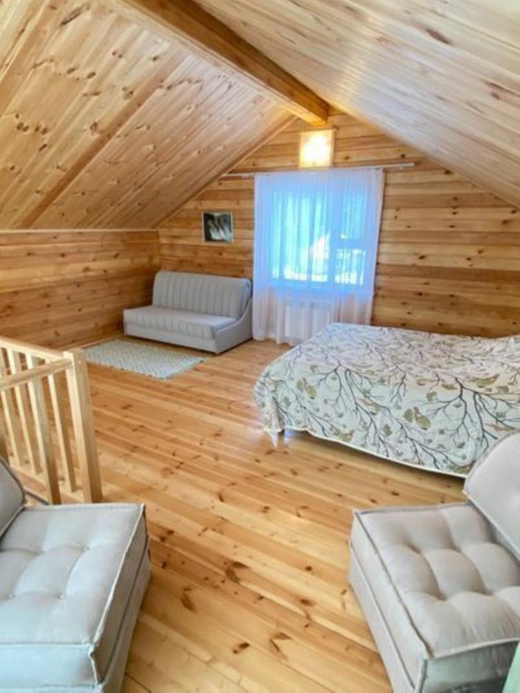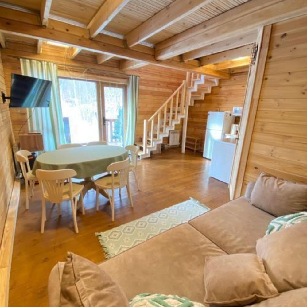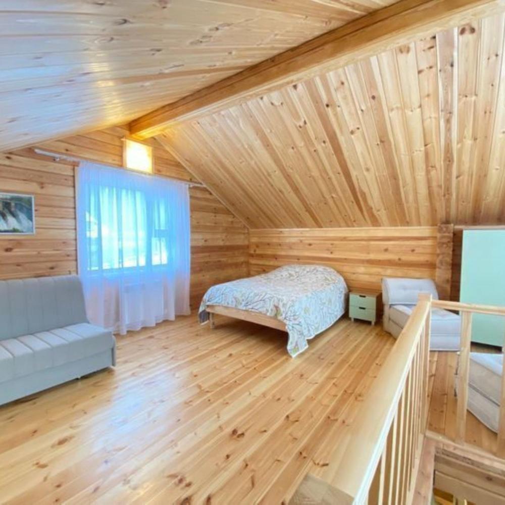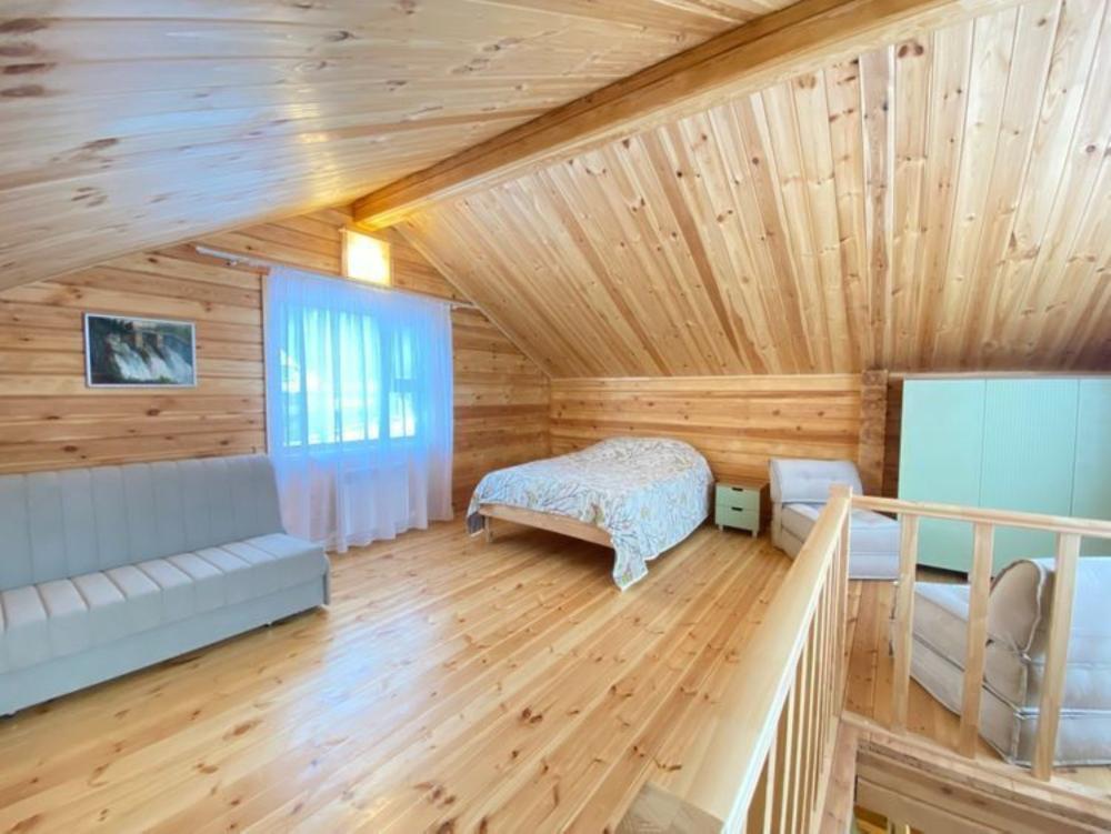Двухэтажный домик из бруса хвойных пород. Первый этаж дома - это гостиная с кухонным уголком, диваном, обеденным столом и 6 стульями. Также на первом этаже находится санузел с душевой кабиной. Второй этаж - это спальная зона с двуспальной кроватью, диваном, 2 креслами, шкафом и тумбочками. В доме есть все для комфортного проживания, включая посудомойку, всю необходимую посуду, технику, постельное бельё и полотенца.