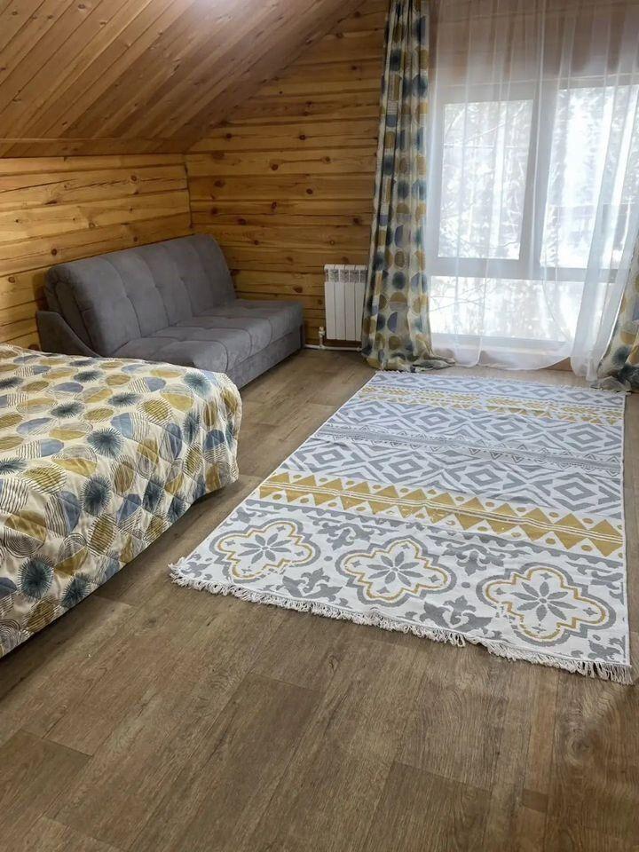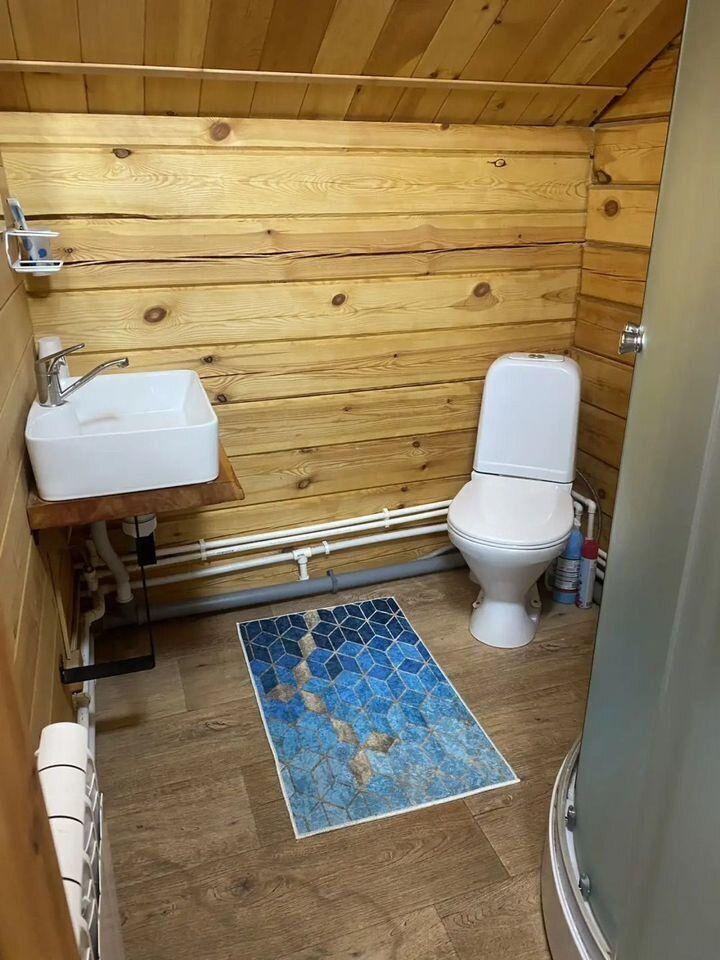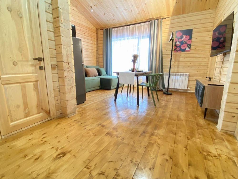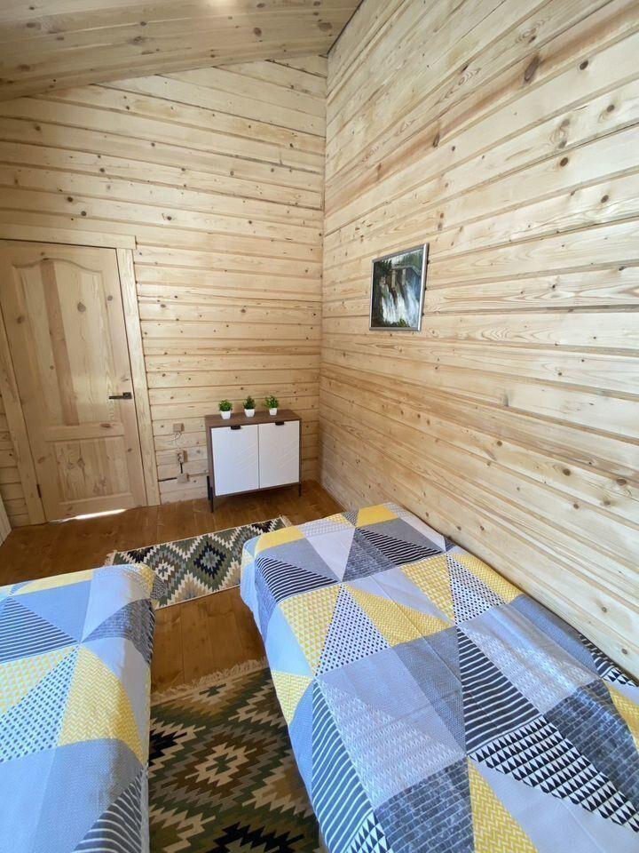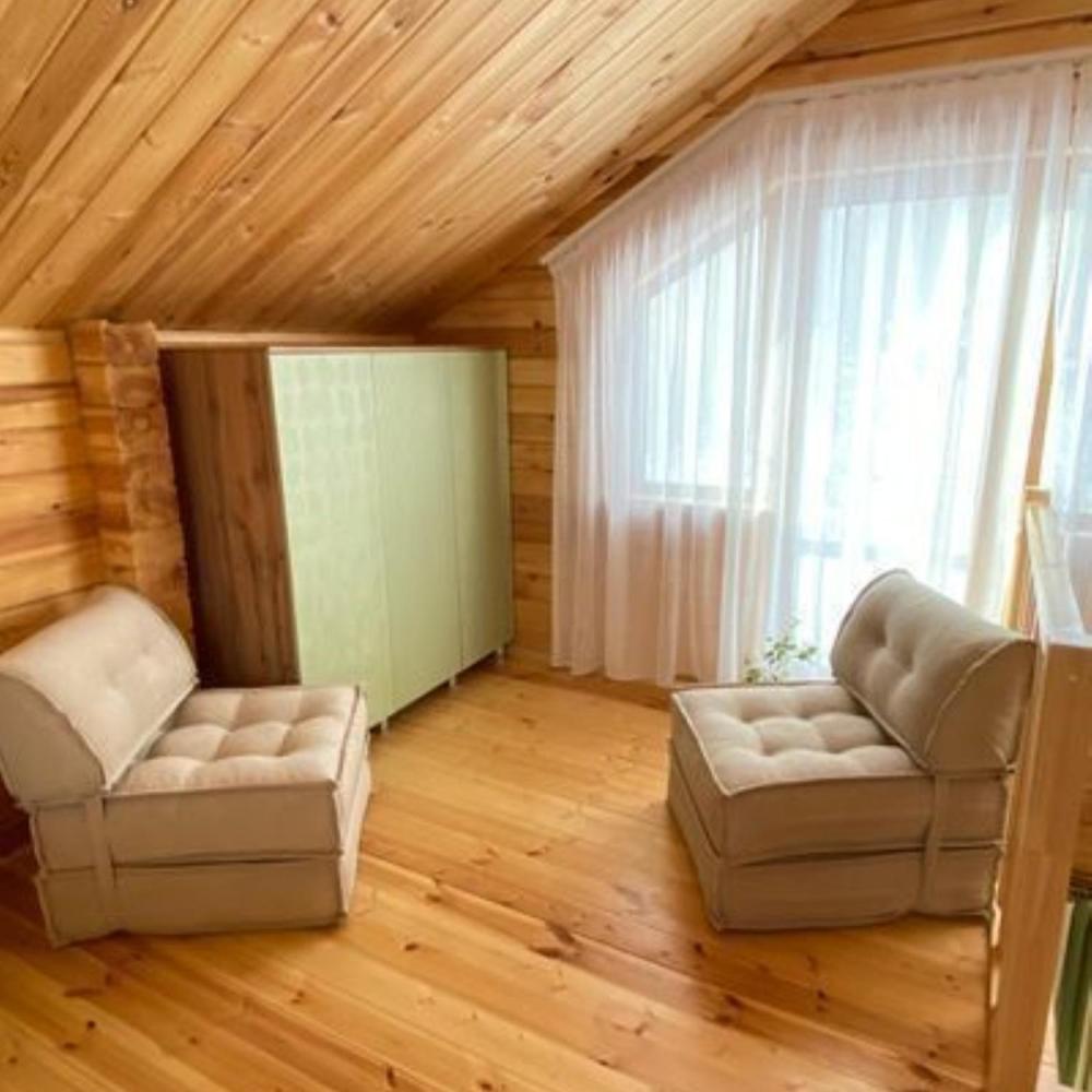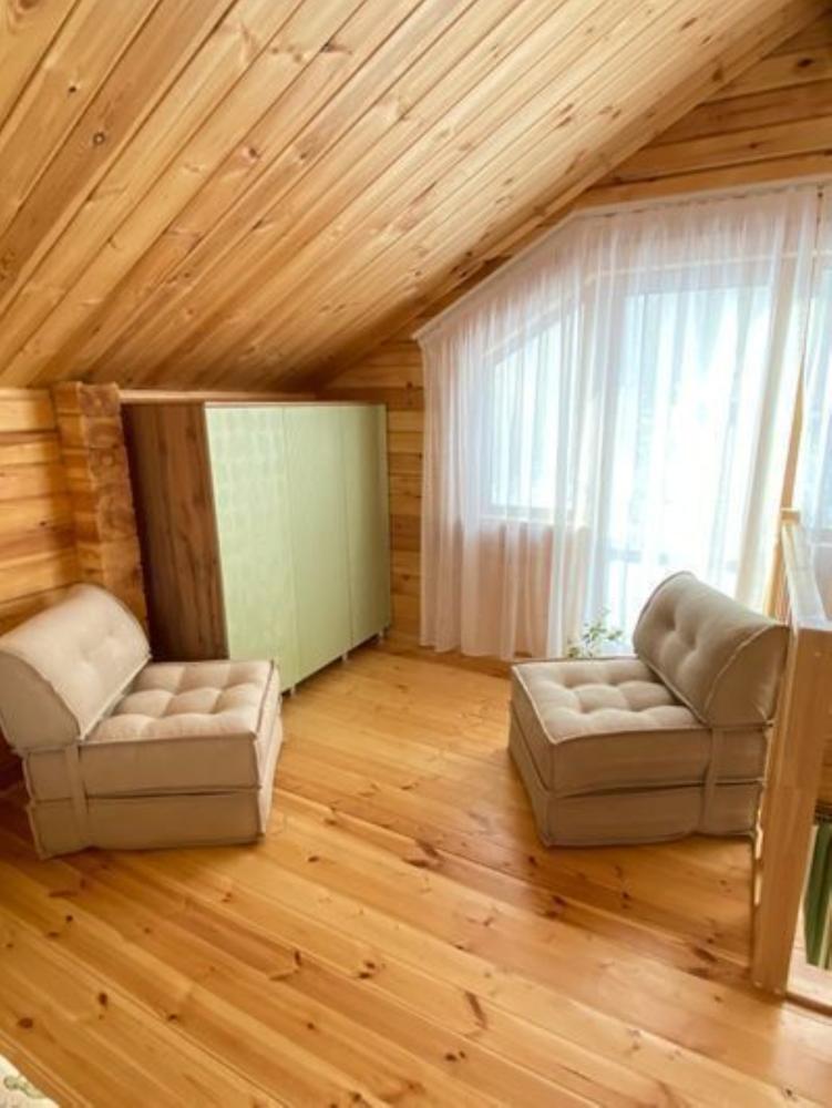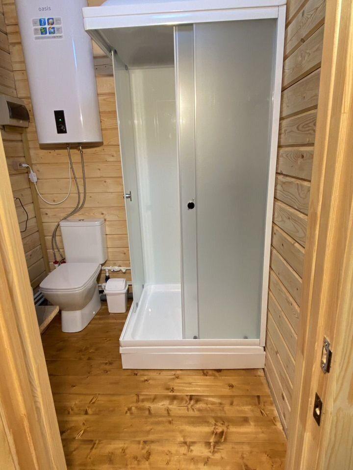 Двухэтажный домик из бруса хвойных пород. Первый этаж дома - это гостиная с кухонным уголком, диваном, обеденным столом и 6 стульями. Также на первом этаже находится санузел с душевой кабиной. Второй этаж - это спальная зона с двуспальной кроватью, диваном, 2 креслами, шкафом и тумбочками. В доме есть все для комфортного проживания, включая посудомойку, всю необходимую посуду, технику, постельное бельё и полотенца.