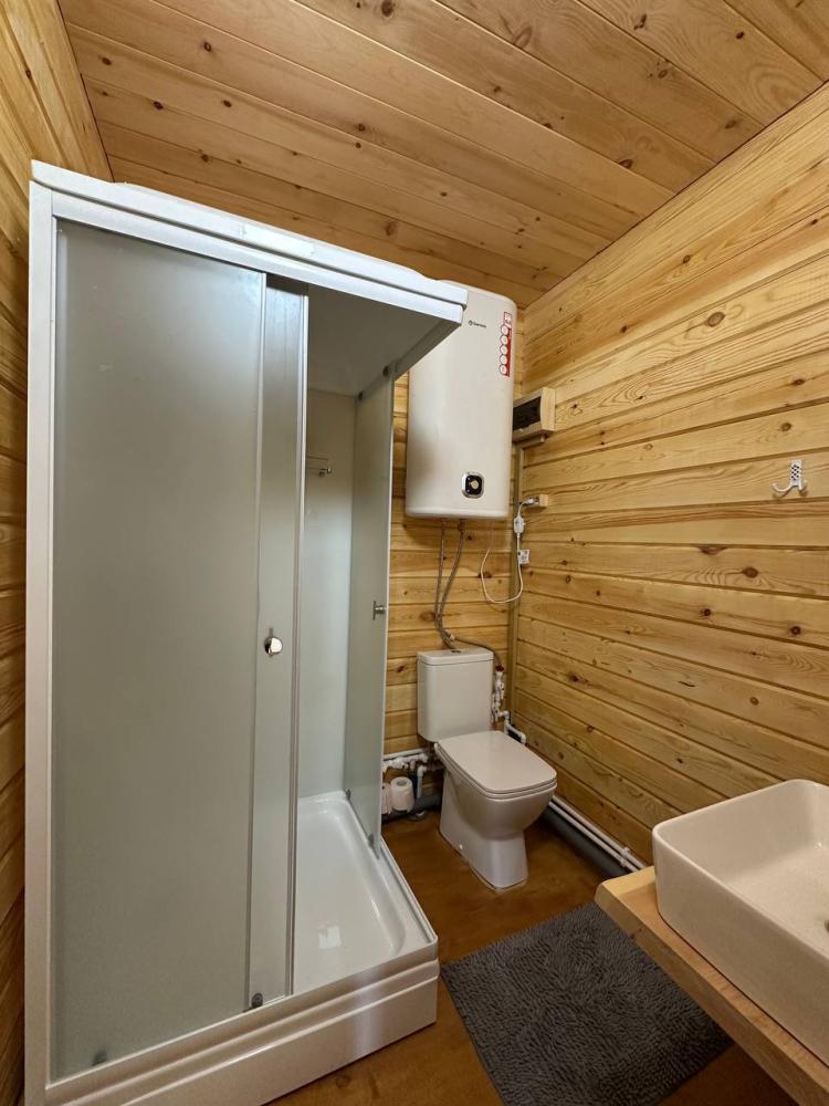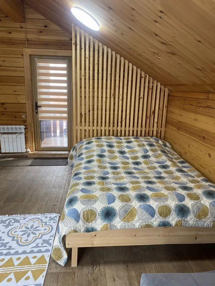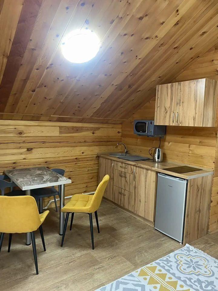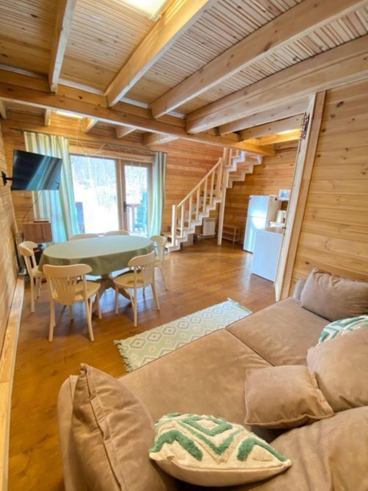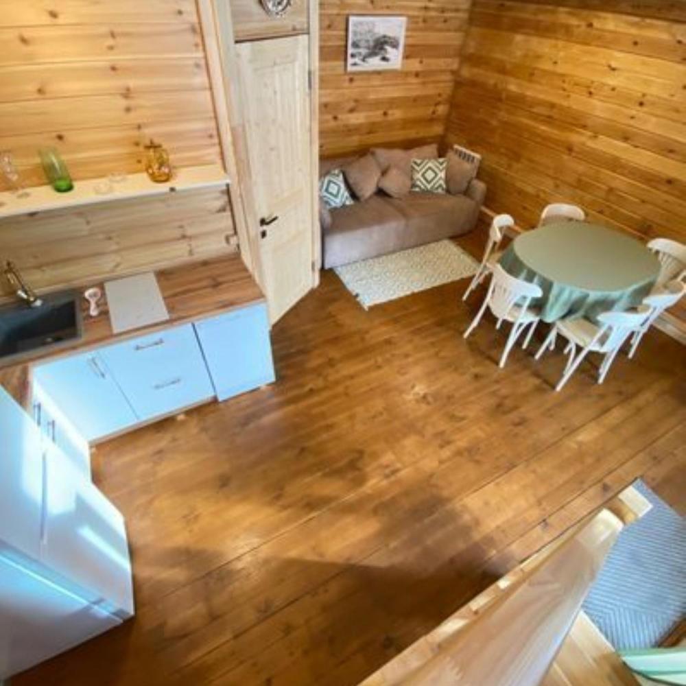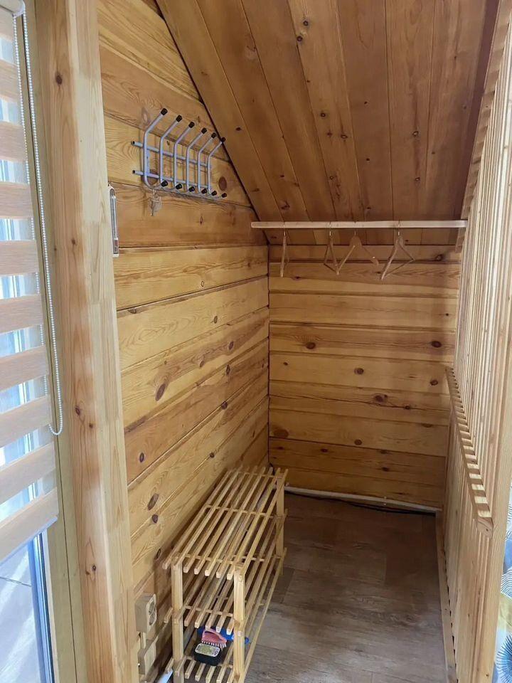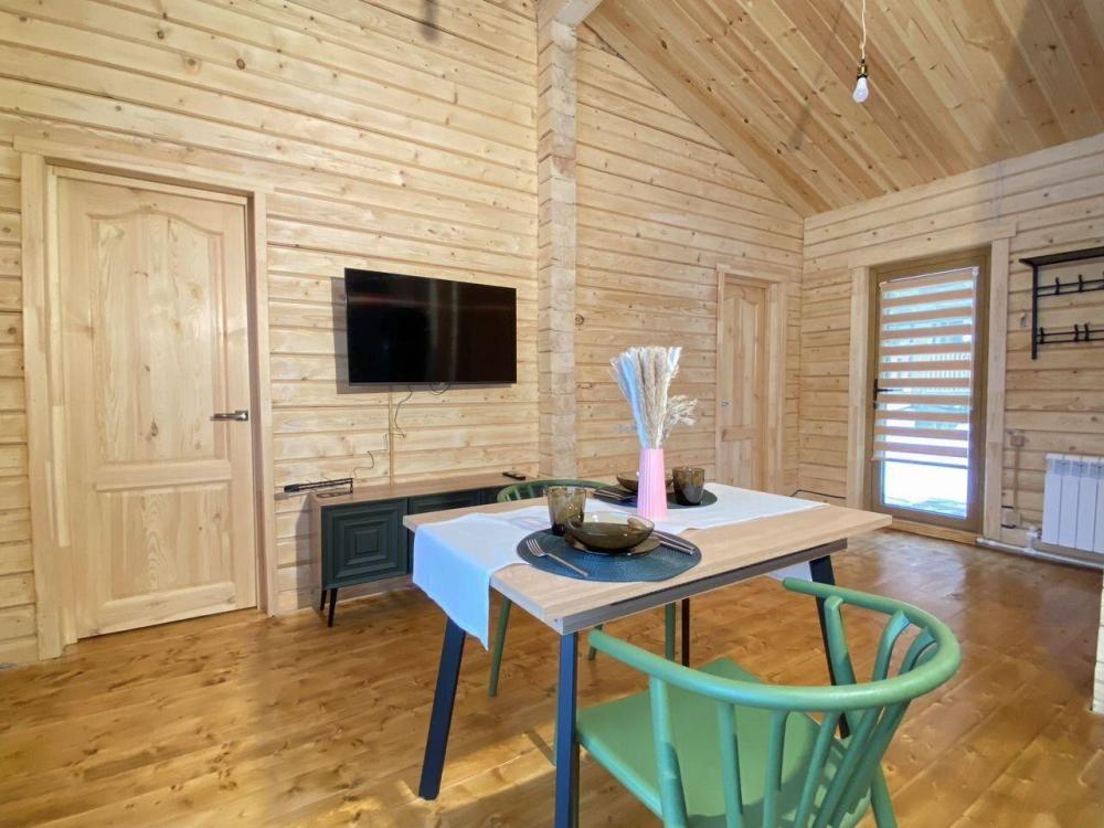 Двухэтажный домик из бруса хвойных пород. Первый этаж дома - это гостиная с кухонным уголком, диваном, обеденным столом и 6 стульями. Также на первом этаже находится санузел с душевой кабиной. Второй этаж - это спальная зона с двуспальной кроватью, диваном, 2 креслами, шкафом и тумбочками. В доме есть все для комфортного проживания, включая посудомойку, всю необходимую посуду, технику, постельное бельё и полотенца.
