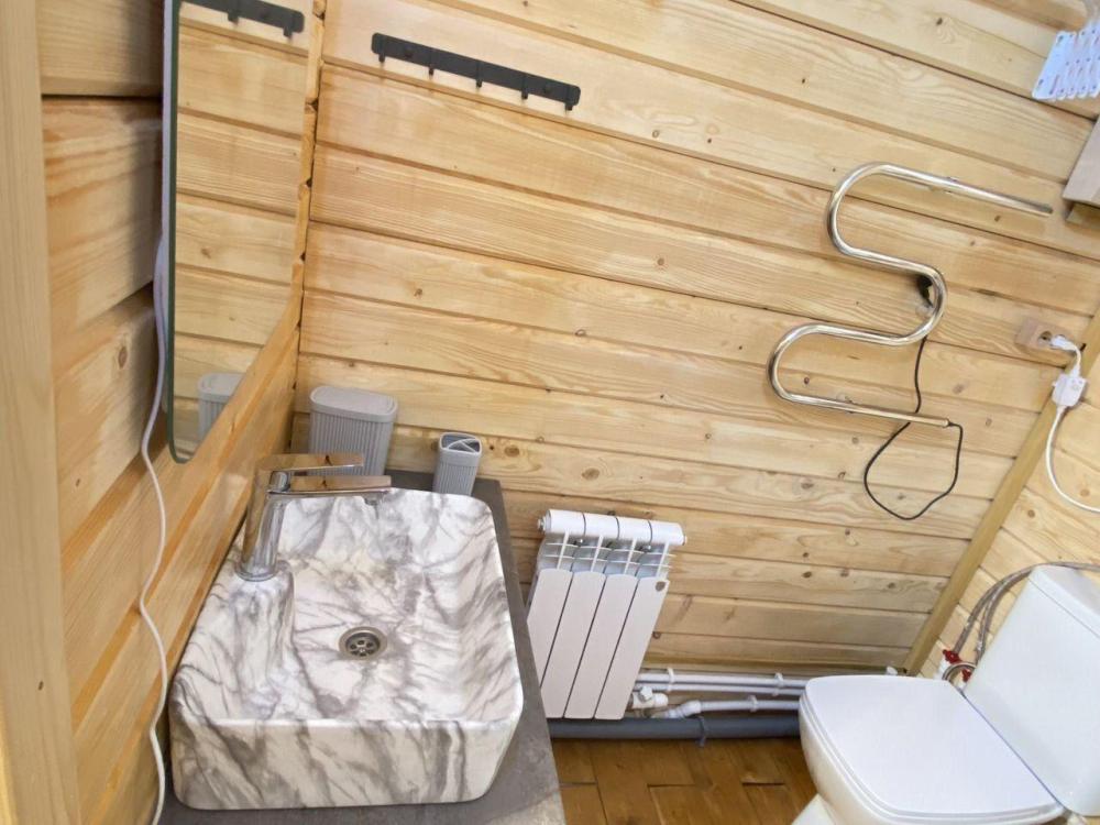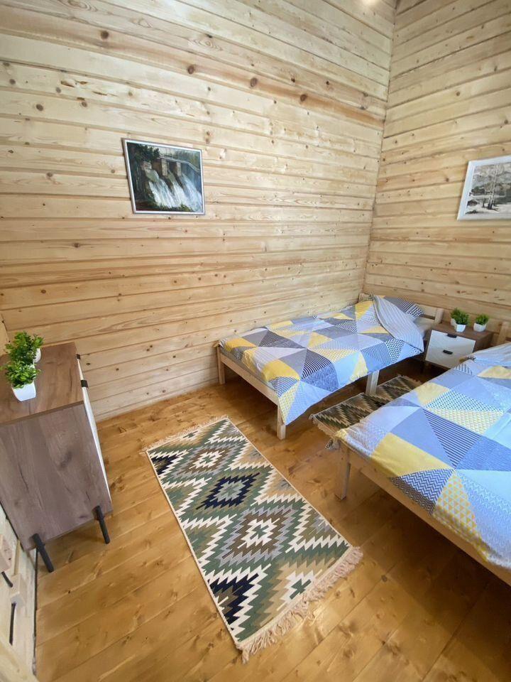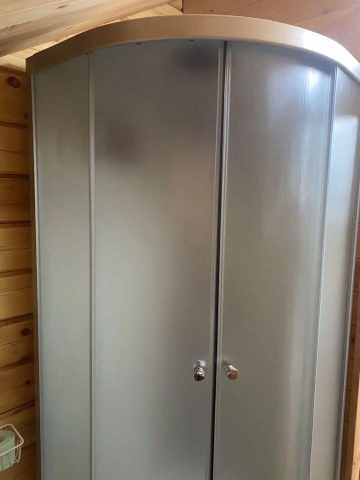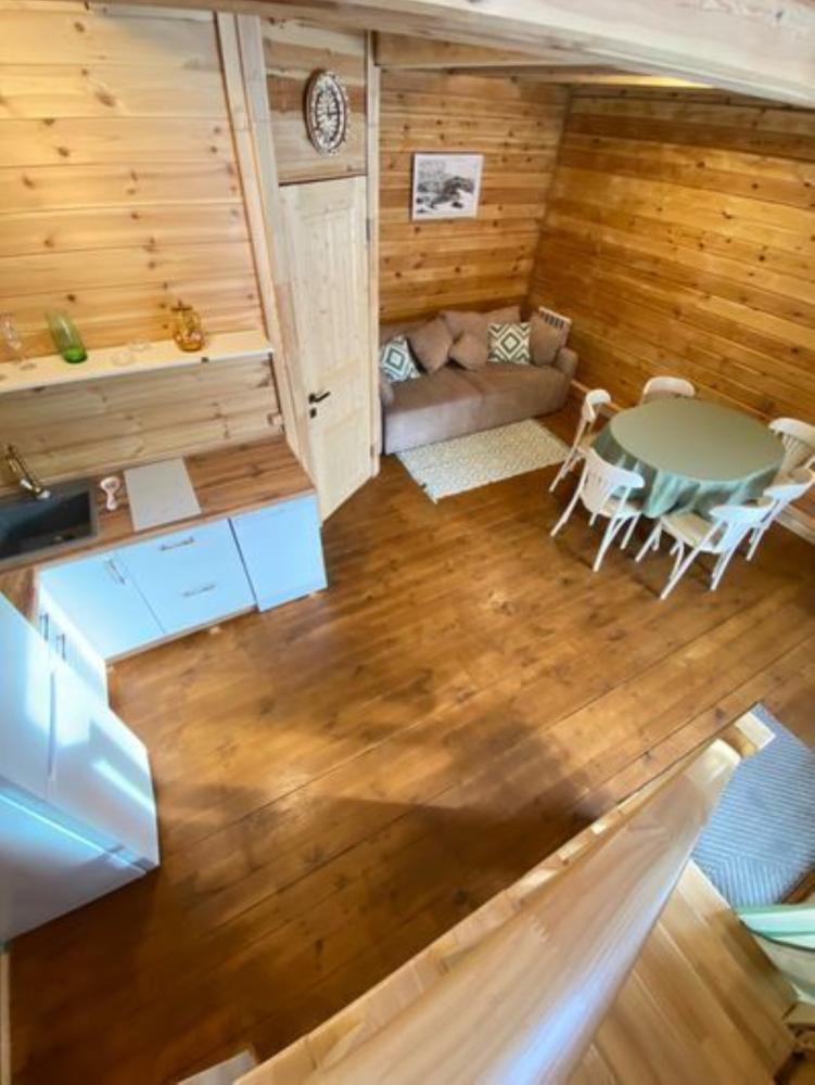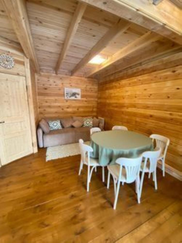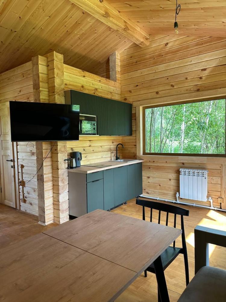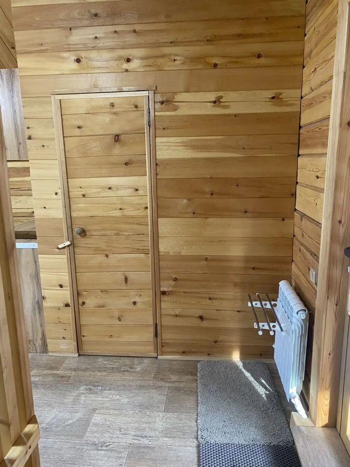 Двухэтажный домик из бруса хвойных пород. Первый этаж дома - это гостиная с кухонным уголком, диваном, обеденным столом и 6 стульями. Также на первом этаже находится санузел с душевой кабиной. Второй этаж - это спальная зона с двуспальной кроватью, диваном, 2 креслами, шкафом и тумбочками. В доме есть все для комфортного проживания, включая посудомойку, всю необходимую посуду, технику, постельное бельё и полотенца.