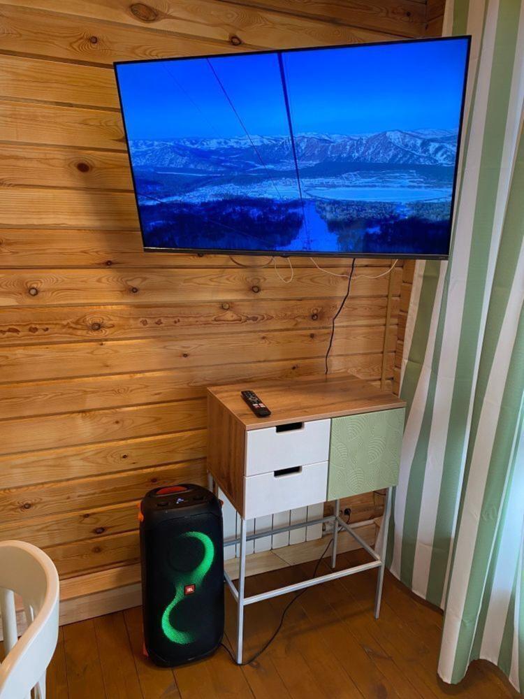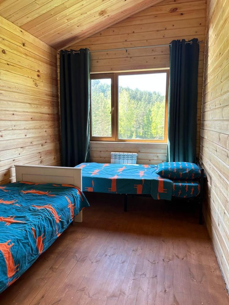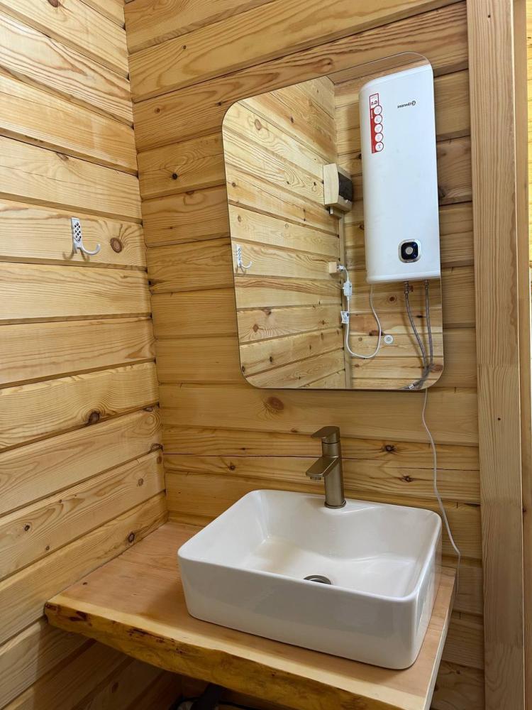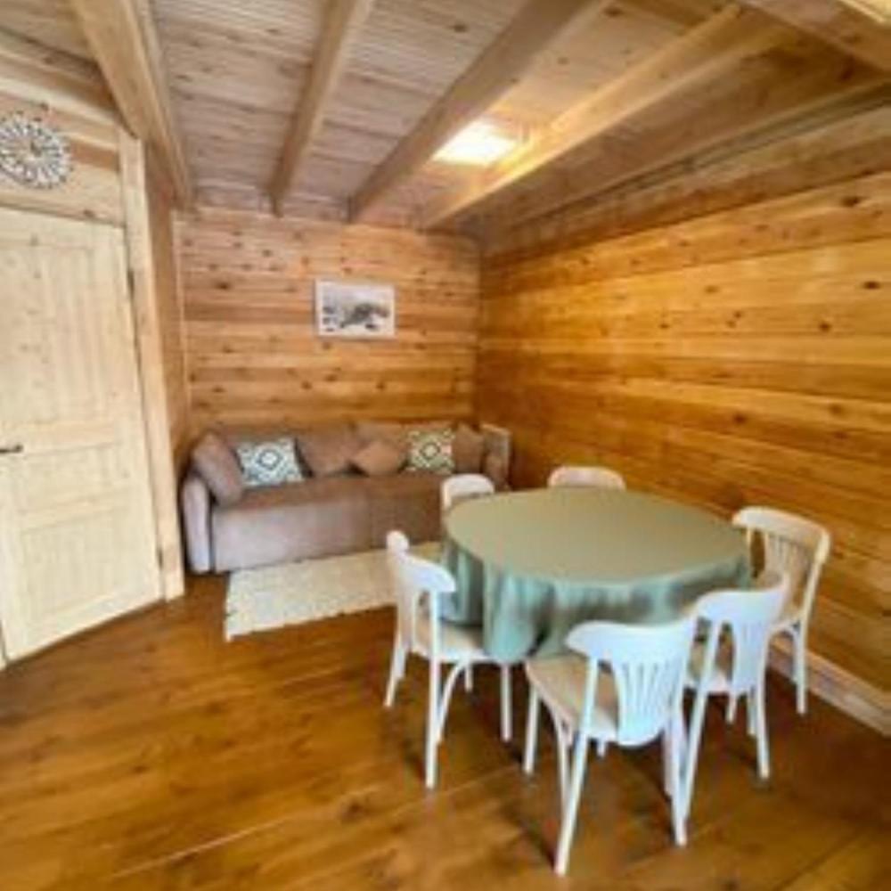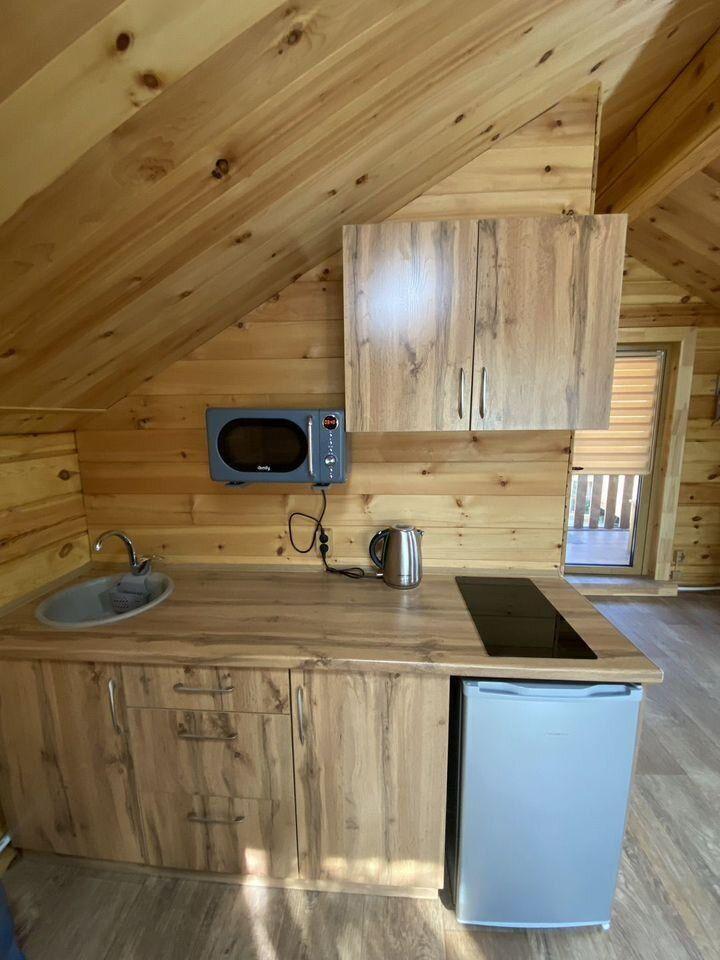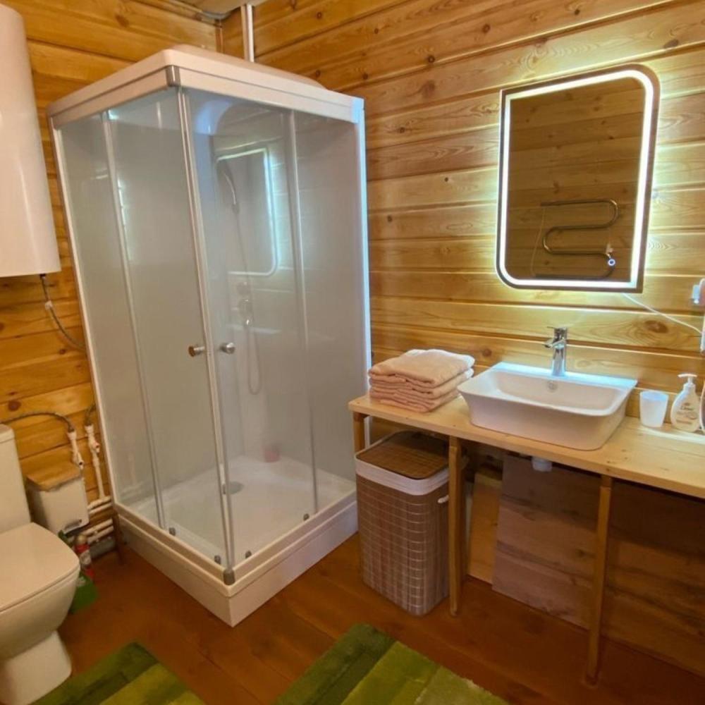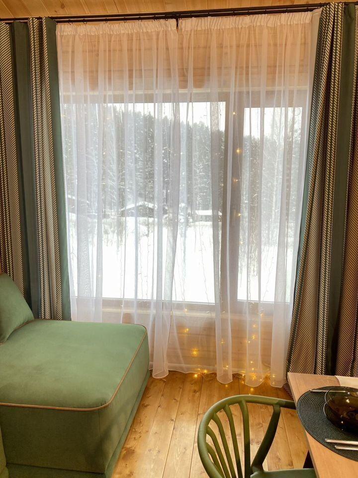 Двухэтажный домик из бруса хвойных пород. Первый этаж дома - это гостиная с кухонным уголком, диваном, обеденным столом и 6 стульями. Также на первом этаже находится санузел с душевой кабиной. Второй этаж - это спальная зона с двуспальной кроватью, диваном, 2 креслами, шкафом и тумбочками. В доме есть все для комфортного проживания, включая посудомойку, всю необходимую посуду, технику, постельное бельё и полотенца.