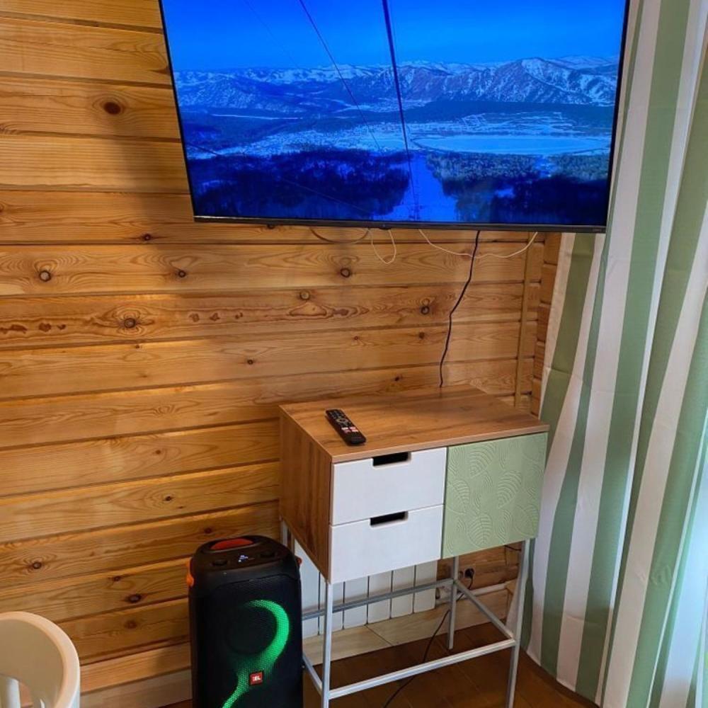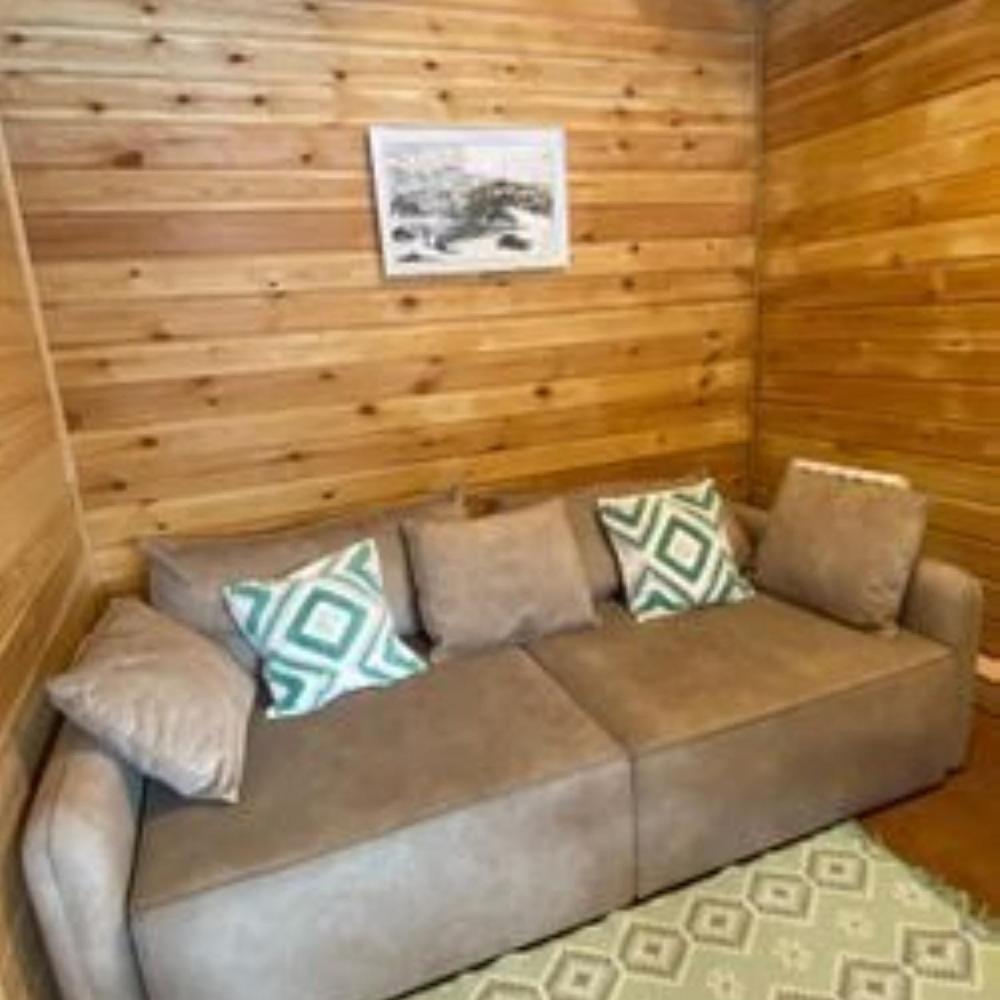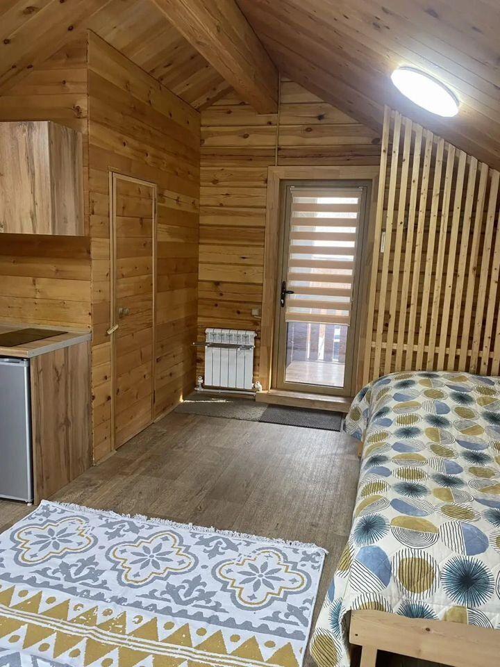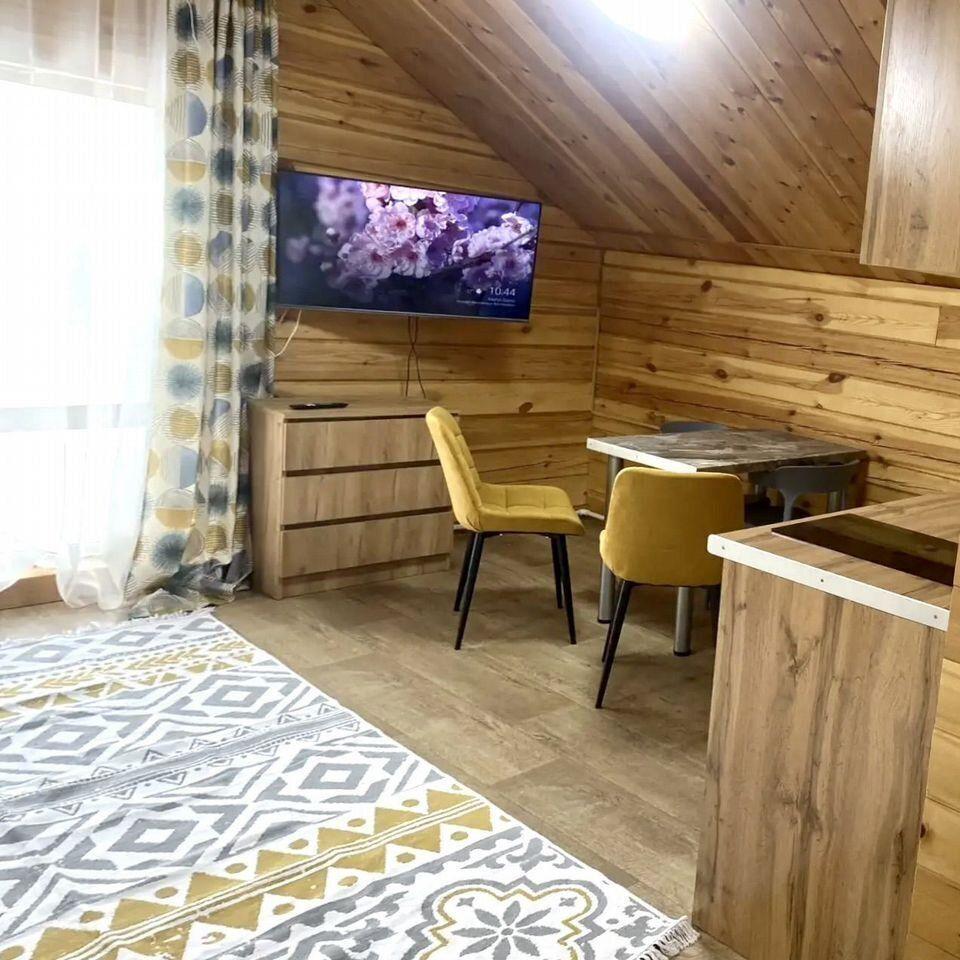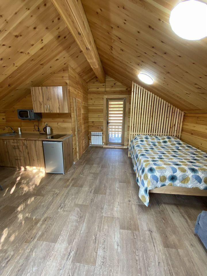 Уютная студия на втором этаже с отдельным входом. Гостиная зона: широкий раскладной диван, ТВ. Спальная зона: удобная двуспальная кровать с премиальным матрасом и постельным бельём из поплина и перкаля. Кухонная зона: гарнитур, варочная панель, микроволновка, чайник, холодильник, вся необходимая посуда. Санузел: душевая кабина, фен, полотенца. Балкон с видом на горы.