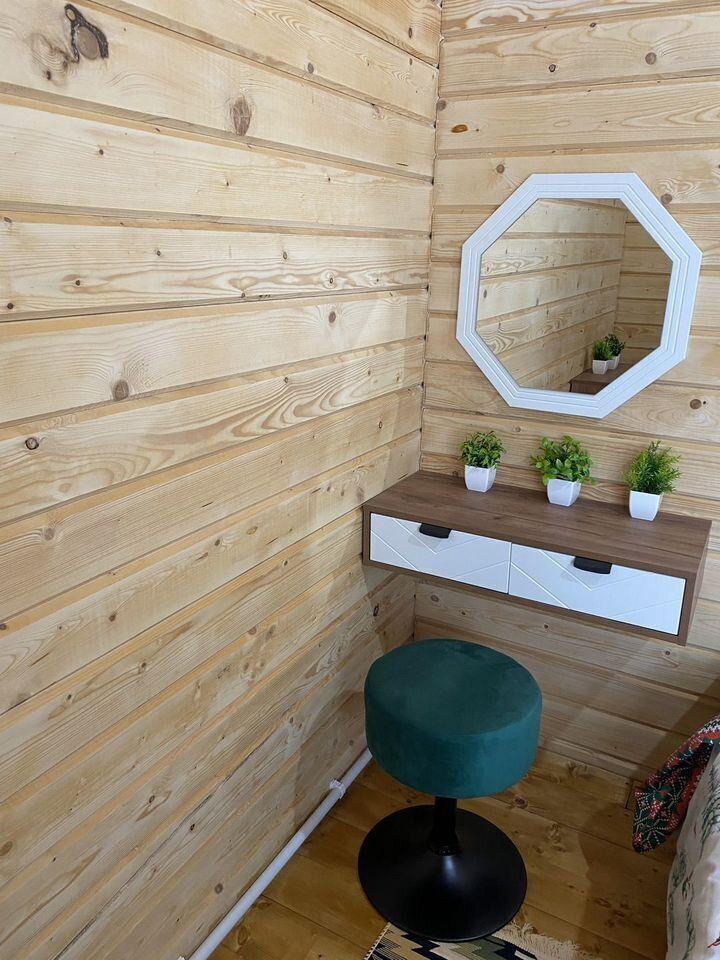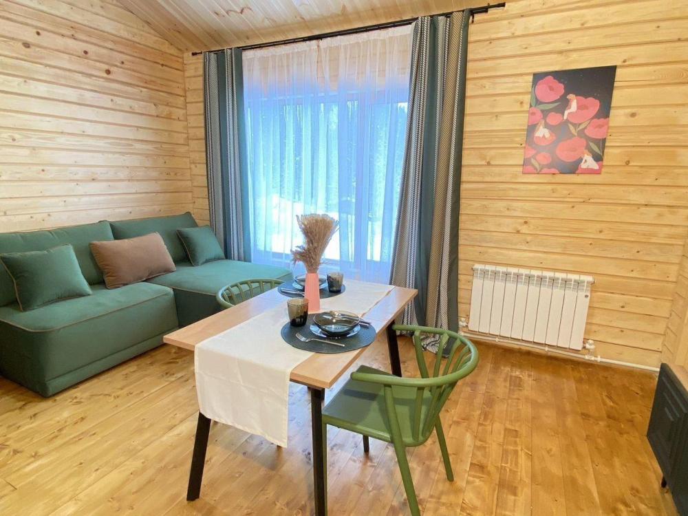 Дом рассчитан на до 6 гостей и включает две спальни: одну с кроватью 160×200 см, комодом, тумбочкой, туалетным столиком и пуфиком, а другую с двумя односпальными кроватями 90×200 см, комодом и тумбочкой. Гостиная с кухней и обеденной зоной оборудована индукционной плитой, холодильником, посудомоечной машиной, микроволновкой, чайником, полным комплектом посуды, большим диваном, телевизором и обеденным столом на 6 персон. В доме есть современный санузел с феном и полотенцами, а на террасе с видом на гору Синюха идеально пить утренний кофе или отдыхать вечером. Также на участке расположена зона для барбекю.