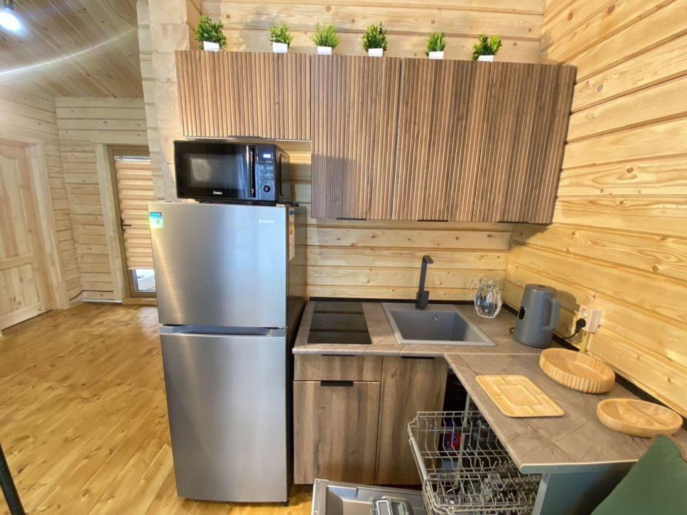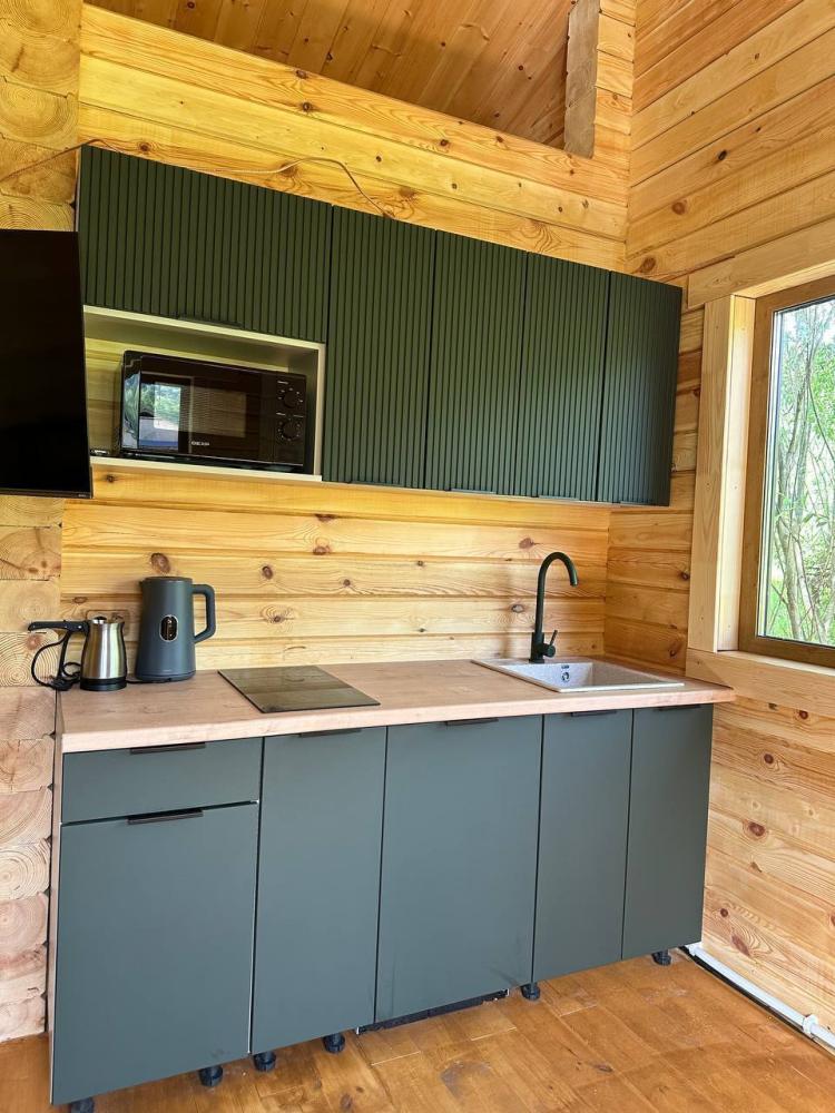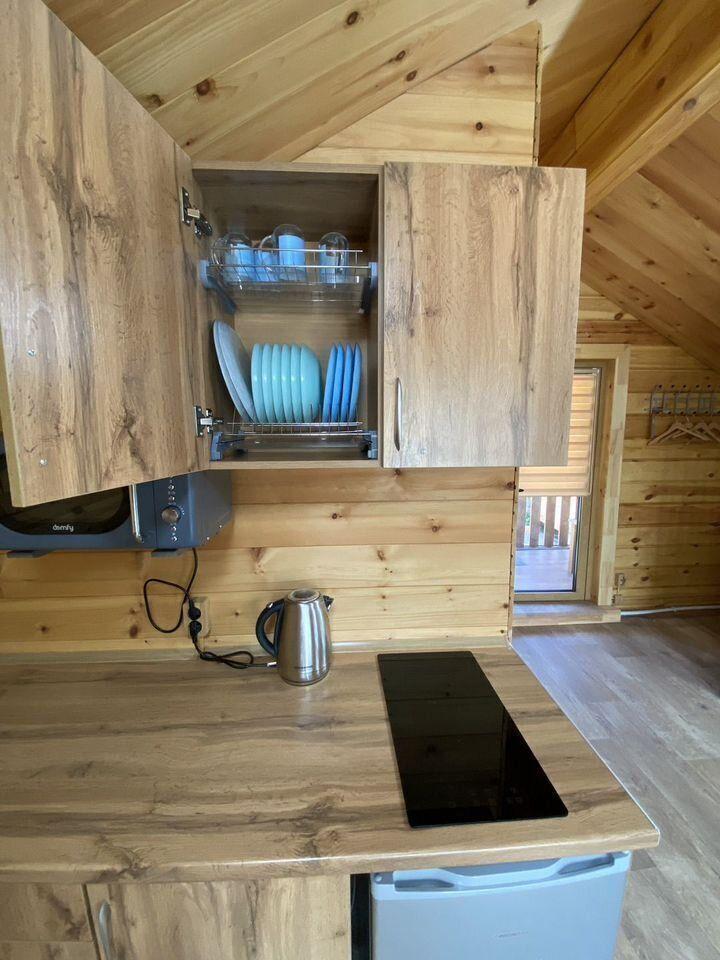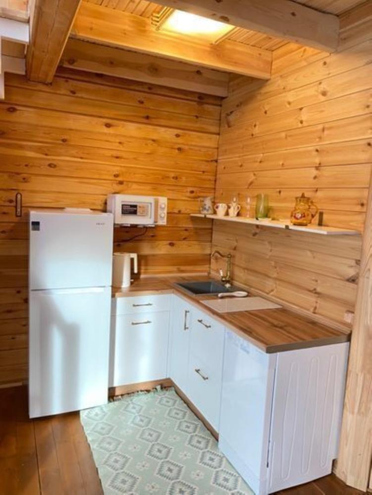 Дом рассчитан на 6 гостей и включает две спальни: в одной — кровать 160×200 см, стеллаж и тумбочки, в другой — две односпальные кровати 90×200 см, также с мебелью. Гостиная с кухней и обеденной зоной оснащена индукционной плитой, холодильником, посудомоечной машиной, микроволновкой, чайником, полным комплектом посуды, диваном, ТВ и обеденным столом на 4 персоны, современный санузел с феном, полотенцами. Зона для барбекю на участке.