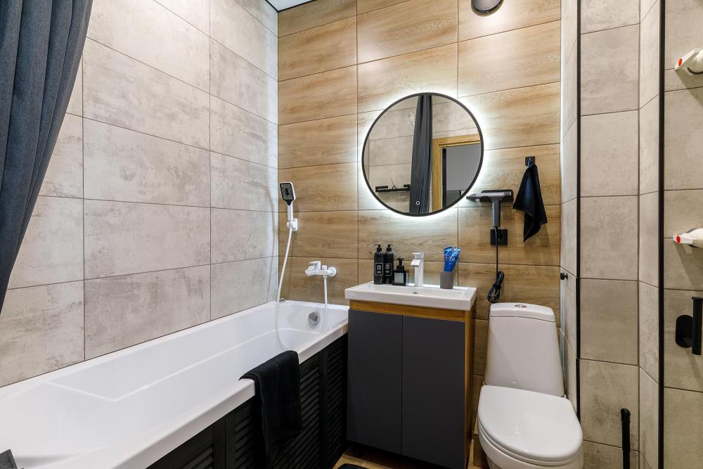 с акцентами в графитовом тонах. Пастельные тона создают ощущение простора и спокойствия.