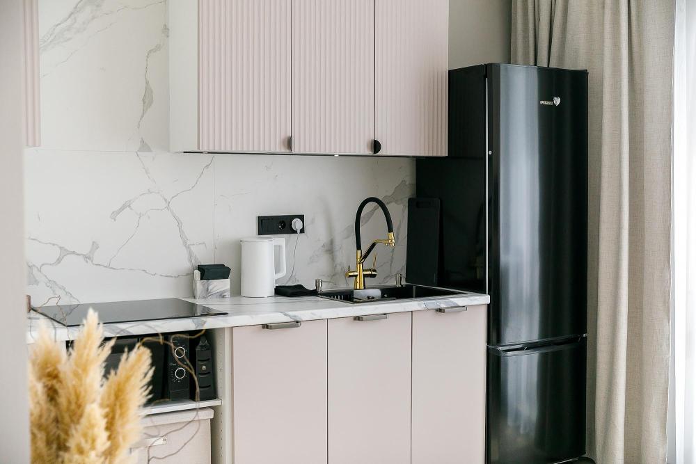 Кухня полностью оборудована: микроволновка, холодильник, чайник, индукционная варочная панель, СВЧ печь, утюг, гладильная доска, фен а так же бойлер